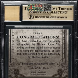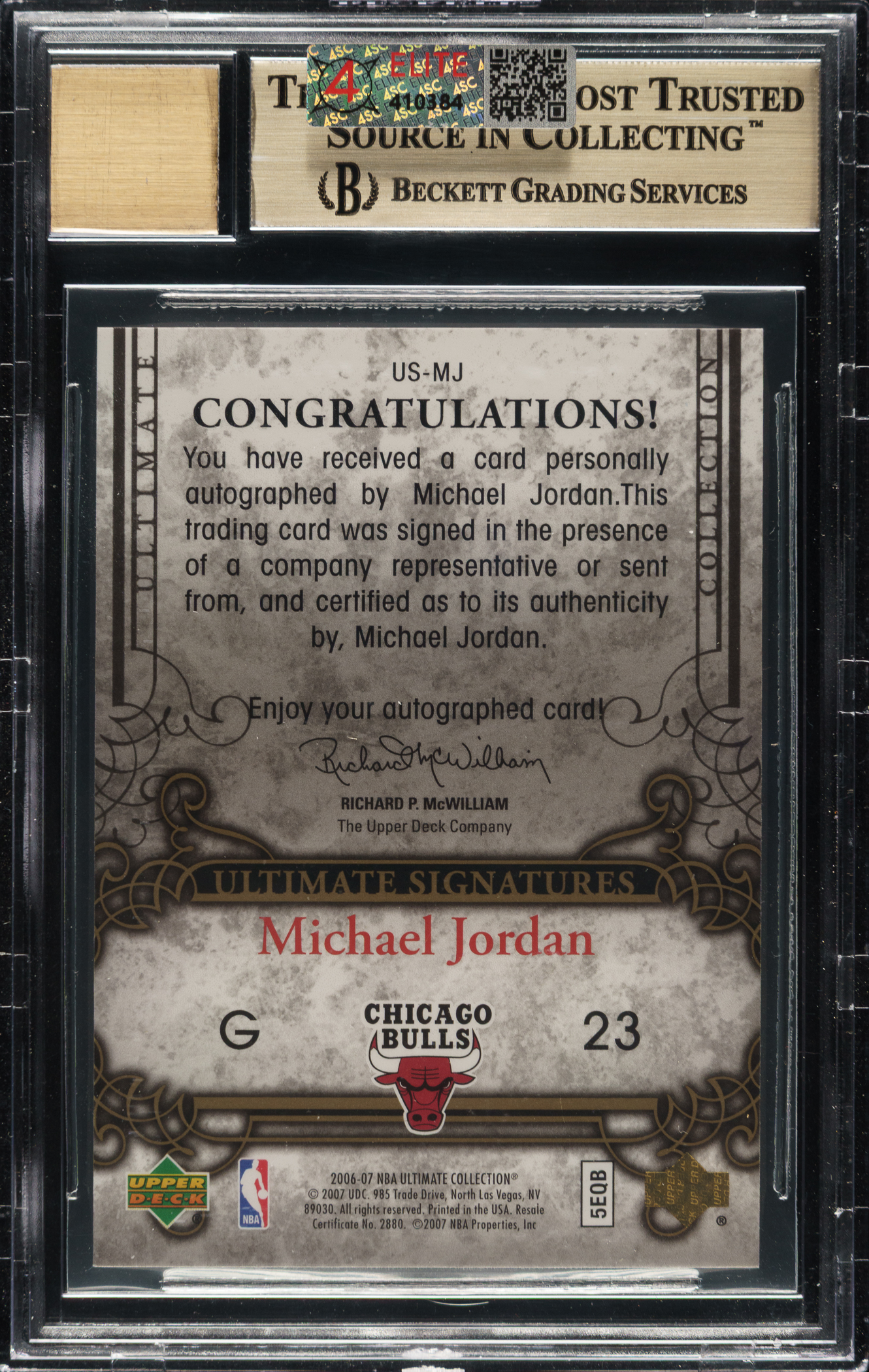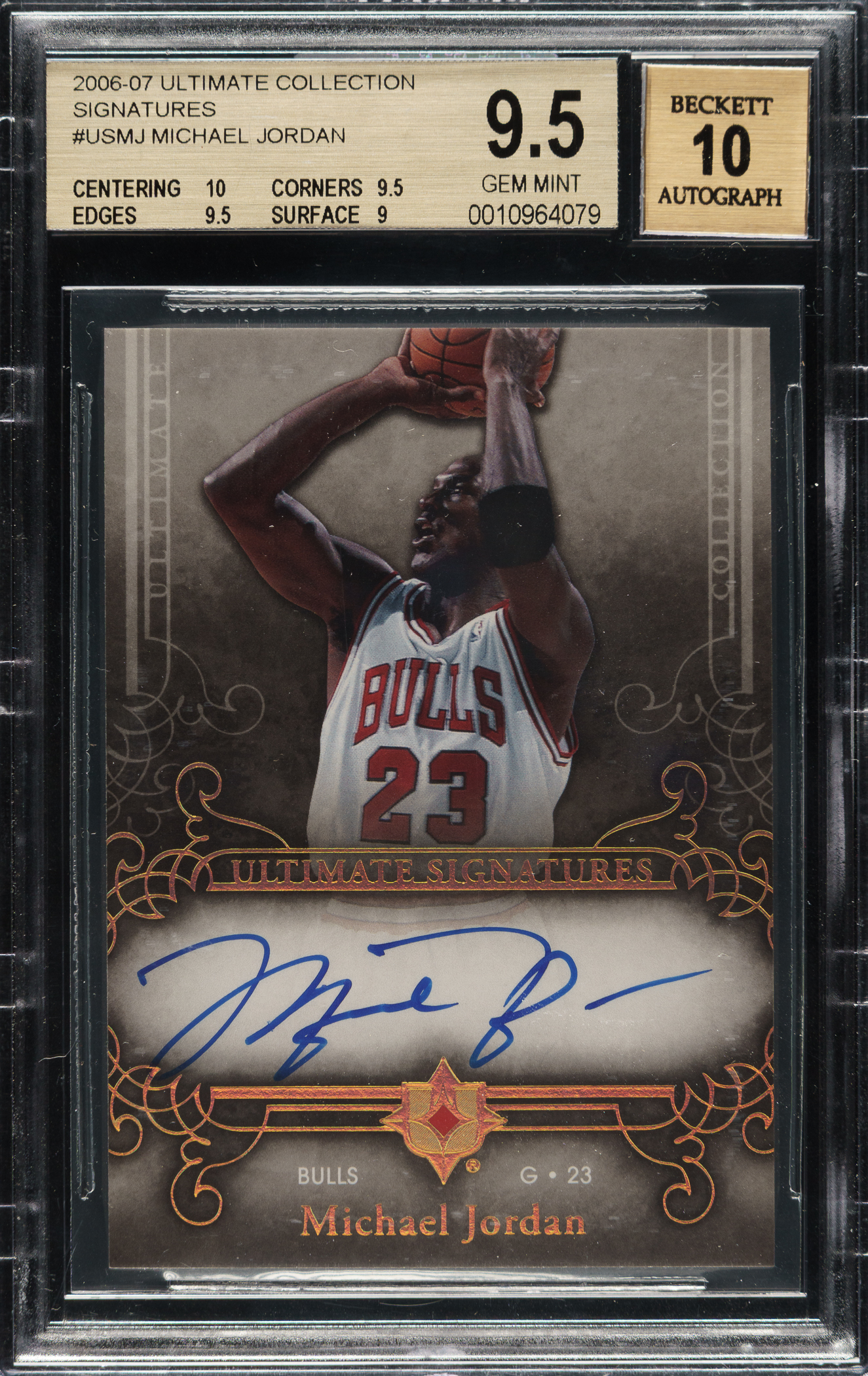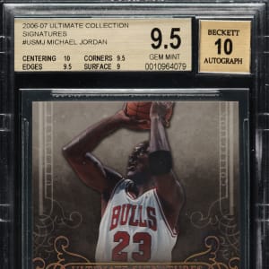 Graded GEM MINT 9.5 by BGS with GEM 10 signature. Tremendous example of Michael Jordan's 2006-2007 Upper Deck Ultimate Collection Ultimate Signatures card. Jordan's signature is scripted in blue fine-point marker on the front. Subgrades are 10 for centering, 9.5 for corners and edges, and 9 for surface. An outstanding signed example of this desirable Jordan card!