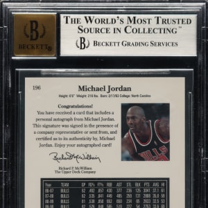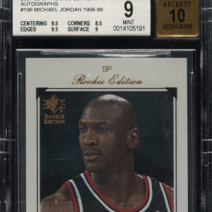 Graded MINT 9 by BGS with GEM 10 signature. Stunning example of Michael Jordan's 2007-2008 Upper Deck SP Rookie Edition 1998-1999 SP Autographs Basketball card. Jordan's signature is scripted in blue fine-point marker on the front. Subgrades are 9.5 for centering and edges, 9 for surface, and 8.5 for corners. A fantastic example of this desirable signed Jordan card!