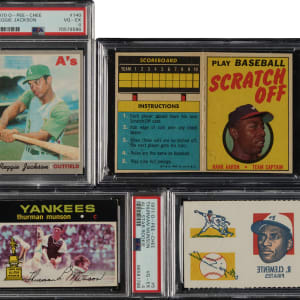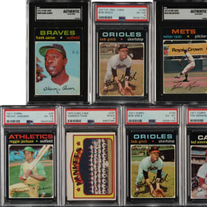 Collection of eleven 1970 to 1972 Topps and O-Pee-Chee cards, featuring Atlanta Braves, Pittsburgh Pirates and Oakland Athletics Hall of Famers Hank Aaron, Roberto Clemente and Reggie Jackson. Each card has been graded and encapsulated by PSA (9) or SGC (2). This collection consists of the following: 1) 1970 O-Pee-Chee (1 cards): #140 Jackson (VG-EX 4). 2) 1971 O-Pee-Chee (4 cards): #5 (VG-EX 4), 193 (VG-EX 4), 400 Aaron (SGC Authentic), and 513 Ryan (SGC Authentic). 3) 1971 Topps (3 cards): #20 Jackson (VG-EX 4), 117 Simmons RC (EX 5), and 193 (EX-MT 6). 4) 1971 Topps Tattoos Perforated Panels (1 card): Clemente (FAIR 1.5). 5) 1971 Topps Scratch-Offs (1 card): Aaron (EX 5). 6) 1972 O-Pee-Chee (1 card): #237 (VG-EX 4). Total: 11 cards. The size/weight of this item requires that there will be an additional shipping charge for this lot.