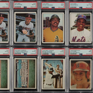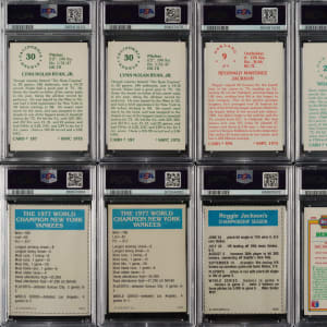 Collection of eight 1975 to 1986 SSPC and Sportflics cards, featuring California Angels, Oakland Athletics and New York Mets Hall of Famers Nolan Ryan, Reggie Jackson, and Willie Mays. Each card has been graded and encapsulated by PSA. This collection consists of the following: 1) 1975 SSPC (4 cards): Two #187 Ryan (NM-MT 8 and NM 7), 494 Jackson (MINT 9), and 616 Mays (NM-MT 8). 2) 1978 SSPC (3 cards): Two #22 (EX-MT 6 and VG-EX 4), 26 Jackson (VG-EX 4). 3) 1986 Sportflics Decade Greats (1 card): #62 Munson/Fisk/Simmons (MINT 9). Total: 8 cards.