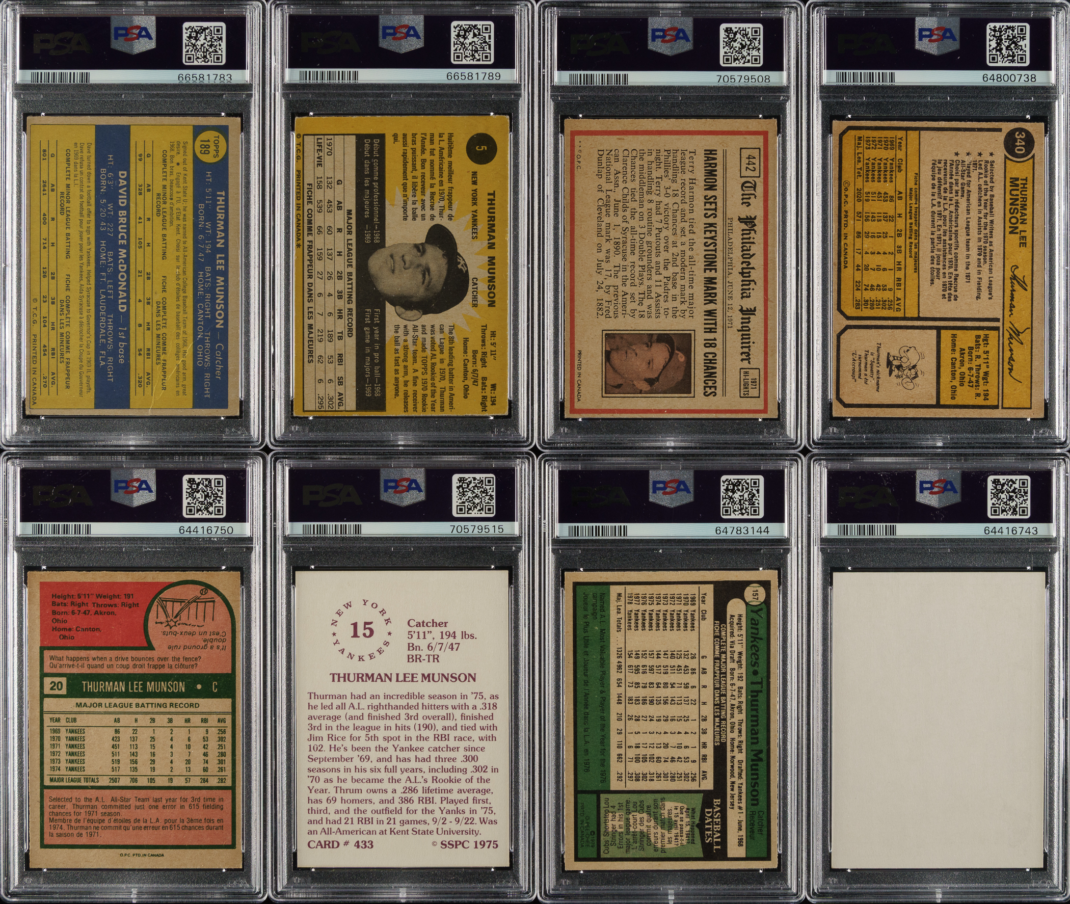 Collection of eight 1970 to 1980 O-Pee-Chee and SSPC cards, featuring New York Yankees Star Thurman Munson. Each card has been graded and encapsulated by PSA. This collection consists of the following: 1) 1970 O-Pee-Chee #189 Thuman Munson and Dave McDonald (GOOD 2). 2) 1971 O-Pee-Chee #5 Thurman Munson AS (VG 3). 3) 1972 O-Pee-Chee #442 Thurman Munson In Action (EX 5). 4) 1974 O-Pee-Chee #340 Thurman Munson (VG 3). 5) 1975 O-Pee-Chee #20 Thurman Munson (EX-MT 6 ST). 6) 1975 SSPC #433 Thurman Munson (MINT 9). 7) 1979 O-Pee-Chee #157 Thurman Munson (NM 7). 8) 1980 Laughlin Famous Feats #13 Thurman Munson (NM-MT 8). Total: 8 cards.