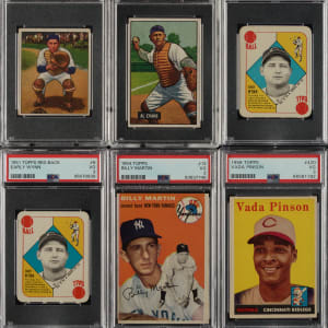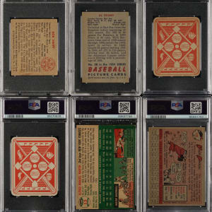 Collection of six 1950 to 1958 Topps, Topps Red Backs, and Bowman cards, featuring Cleveland Indians Hall of Famer Early Wynn. Each card has been graded and encapsulated by PSA. This collection consists of the following: 1) 1950 Bowman (1 card): #149 (POOR 1). 2) 1951 Bowman (1 card): #38 (EX-MT 6). 3) 1951 Topps Red Backs (2 cards): Two #8 Wynn (VG 3 and GOOD 2). 4) 1954 Topps (1 card): #13 (VG 3). 5) 1958 Topps (1 card): #420 (VG 3). Total: 6 cards.