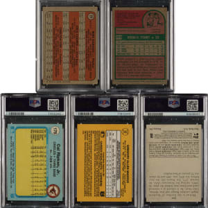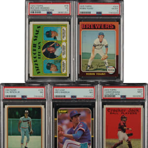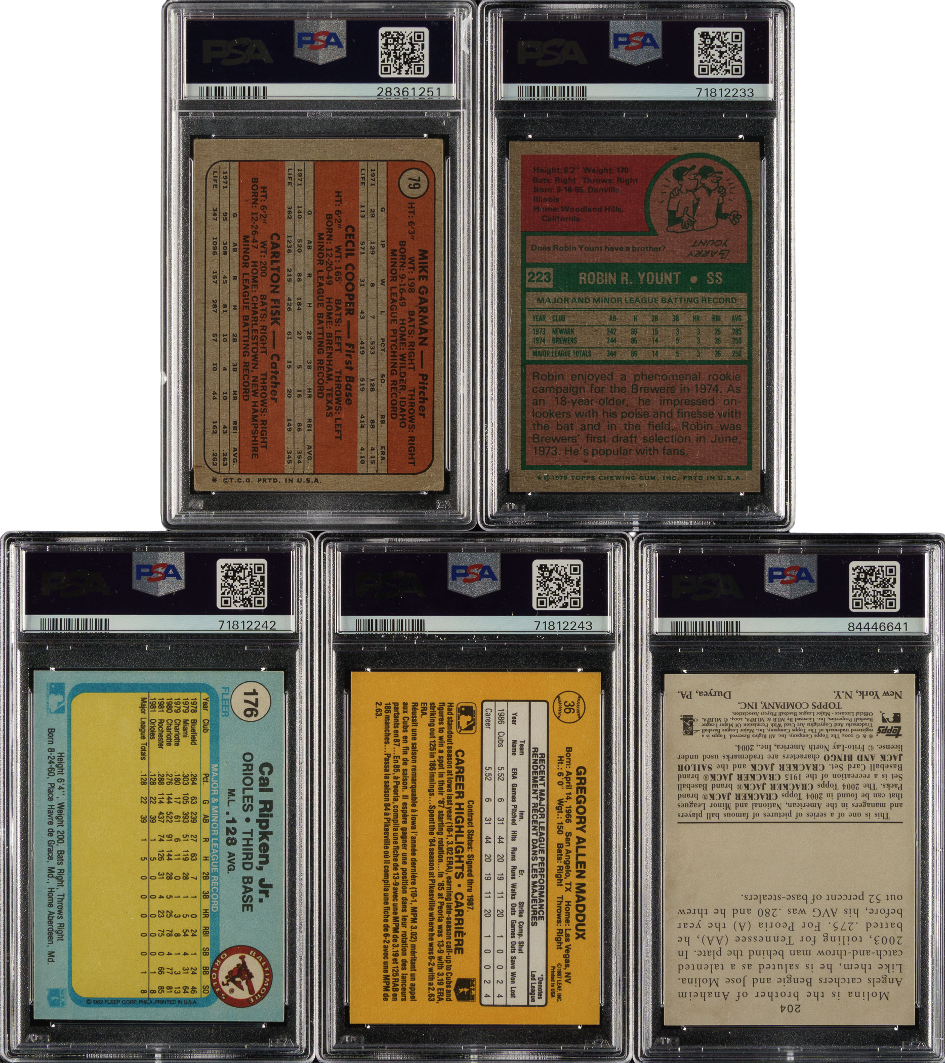 Collection of five 1972 to 2004 Topps, Fleer and Leaf cards, featuring Milwaukee, Baltimore Orioles and Boston Red Sox Hall of Famers Robin Yount, Cal Ripken Jr. and Carlton Fisk. Each card has been graded and encapsulated by PSA. This collection consists of the following: 1) 1972 Topps #79 Carlton Fisk RC (VG 3). 2) 1975 Topps #223 Robin Yount RC (VG-EX 4). 3) 1982 Fleer #176 Cal Ripken Jr. RC (NM 7). 4) 1987 Leaf #36 Greg Maddux RC (NM 7). 5) 2004 Topps Cracker Jack #204 Yadier Molina (MINT 9). Total: 5 cards.