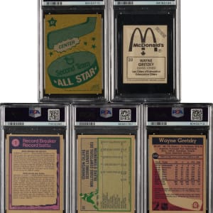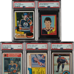 Collection of five 1980 to 1984 Topps and O-Pee-Chee hockey cards, featuring Edmonton Oilers hockey Hall of Famer Wayne Gretzky. Each card has been graded and encapsulated by PSA. This collection consists of the following: 1) 1980-1981 Topps #97 Wayne Gretzky AS (NM 7). 2) 1982-1983 McDonald's Stickers #22 Wayne Gretzky (NM 7). 3) 1982-1983 O-Pee-Chee #1 Wayne Gretzky RB (NM-MT 8). 4) 1983-1984 O-Pee-Chee #22 Wayne Gretzky (NM-MT 8). 5) 1984-1985 O-Pee-Chee #243 Wayne Gretzky (EX-MT 6). Total: 5 cards.