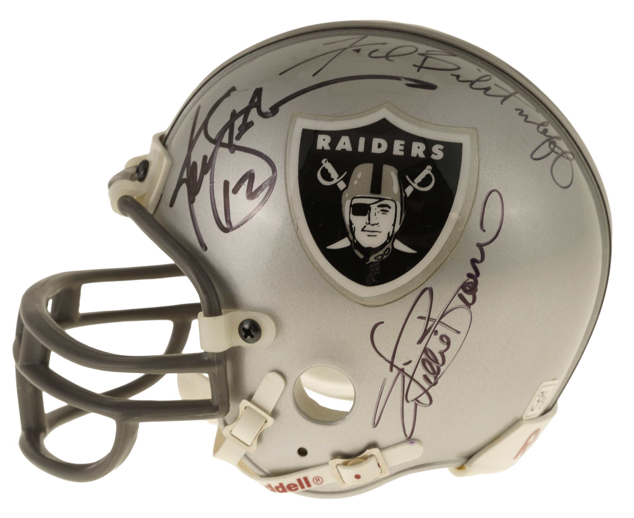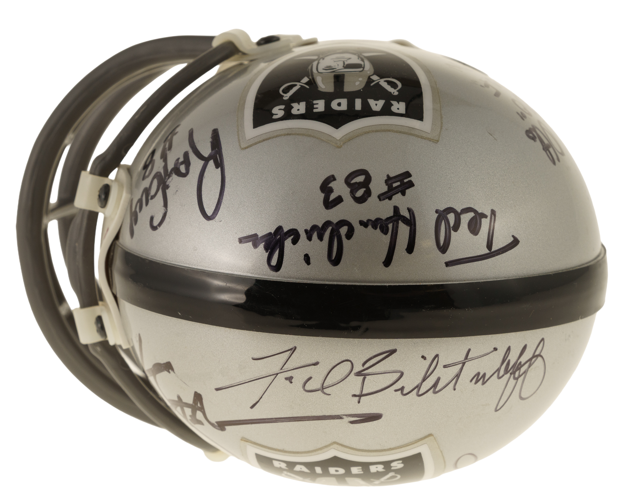 This mini helmet is signed in black ink by six Oakland Raiders football Hall of Famers: Fred Biletnikoff, Willie Brown, Ray Guy (#8), Ted Hendricks (#83), Jim Otto ("00" - HOF 1980), and Ken Stabler (12). Auction LOA from James Spence/JSA. The size/weight of this item requires that there will be an additional shipping charge for this lot.