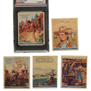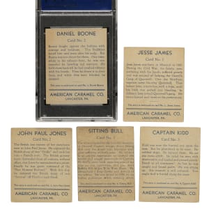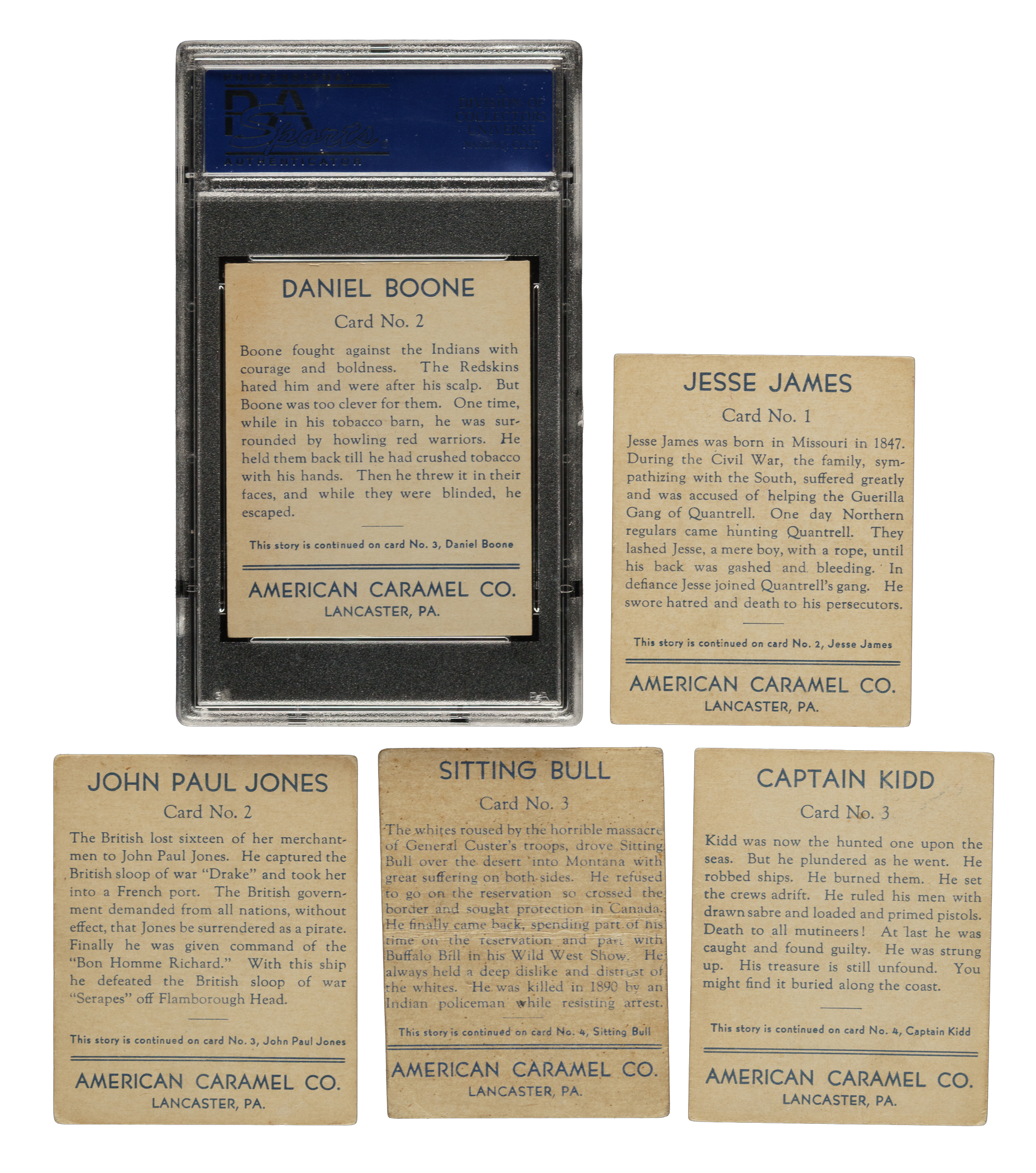 Collection of five 1930 R14 American Historical Characters cards. This collection consists of the following: #1 Jesse James (Fr), 2 The Drake Runs (Vg), 2 Daniel Boone (PSA EX 5), 3 Sitting Bull (Pr), and 3 Captain Kidd (Gd). Total: 5 cards.