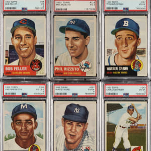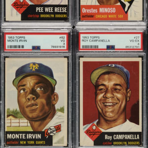 Presented is a very attractive and mostly mid-grade near-complete set (270 of 274 cards) of 1953 Topps, one of the most significant of all postwar baseball card issues. Missing the following four cards for completion: #1 Robinson, 82 Mantle, 220 Paige, and 244 Mays. Includes a duplicate of #243 Bernier. Condition is 11% Ex to Ex-Mt (including one Nr/Mt), 71% Vg to Vg-Ex, and 18% lesser. Ten cards have been professionally graded and encapsulated by PSA. Keys: #10 Burgess SP (Vg-Ex+), 27 Campanella (VG-EX 4), 37 Mathews (Vg), 41 Slaughter (Vg+), 43 McDougald SP (Vg-Ex+), 54 Feller (VG 3), 61 Wynn SP (Vg), 62 Irvin (VG 3), 66 Minoso (EX-MT 6), 76 Reese (VG-EX 4), 77 Mize (Vg-Ex+), 78 Schoendienst (Ex), 81 Black SP (Gd), 86 Martin SP (Fr), 87 Lopat SP (Vg+), 104 Berra (Fr), 114 Rizzuto (VG 3), 119 Sain SP (Vg), 138 Kell (Gd), 147 Spahn (VG-EX 4), 149 D. DiMaggio (Gd+), 151 Wilhelm SP (Vg), 162 Kluszewski SP (Ex-Mt), 185 (VG-EX 4), 191 Kiner (Fr), 207 Ford (VG-EX 4), 228 Newhouser (Vg+), 243 (VG-EX 4), 246 Face RC (Vg), 254 Roe (Gd), 258 Gilliam RC (Pr-Fr), 263 Podres RC SP (Vg-Ex), 264 Woodling (Gd+), 265 Jensen SP (Vg), 273 Haddix RC SP (Fr), and 280 Bolling RC SP (Vg). This is a very attractive mid-grade near-complete set (minus four) of one of card collecting's most popular issues. Total: 271 cards (near set of 270 plus one duplicate).