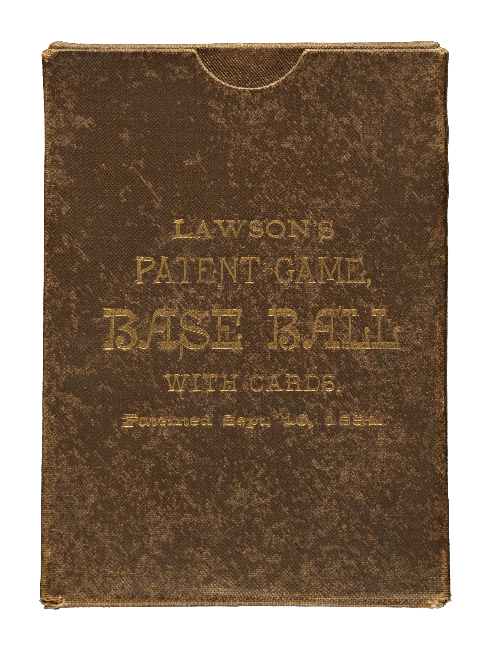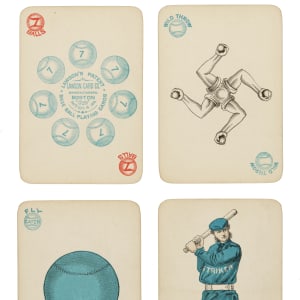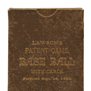 Issued in 1884 by the Lawson Card Company of Boston, Massachusetts, the Lawson's playing-card set features 36 cards with extremely striking baseball-related designs. The backs feature a very attractive baseball scene in blue and white. This is a rarely offered complete 36-card "deluxe" edition Lawson's set in its original box. The cards in the deluxe edition are identical to those in the standard-edition except that each card has beautiful gilt edges and the same very attractive baseball scene in brown and white, as opposed to blue and white. Instead of a thin cardboard box, the deluxe set is presented in a thicker brown cloth-covered cardboard box with game identification in gold lettering, and with matching interior cloth-covered sleeve. The cards display light, natural age toning along the edges, but otherwise they have very little handling wear and remain in Excellent or better condition. The set is also accompanied by the original instruction booklet explaining the rules of the game, which features a black-and-white woodcut of a batter on the cover, and two "value of cards" cards (Vg-Ex and Gd), which explain the scoring of the game. The 20-page instructions booklet is missing four pages (ends at page 16), with both covers detached. The original box displays as Very Good to Excellent with light-to-moderate handling wear. The gold lettering and the interior sleeve remain in Excellent condition. Total: 40 items (complete set of 36 cards, one rules booklet, original box, and two "value of cards" cards).