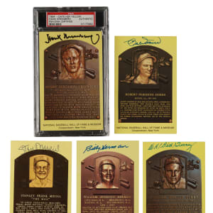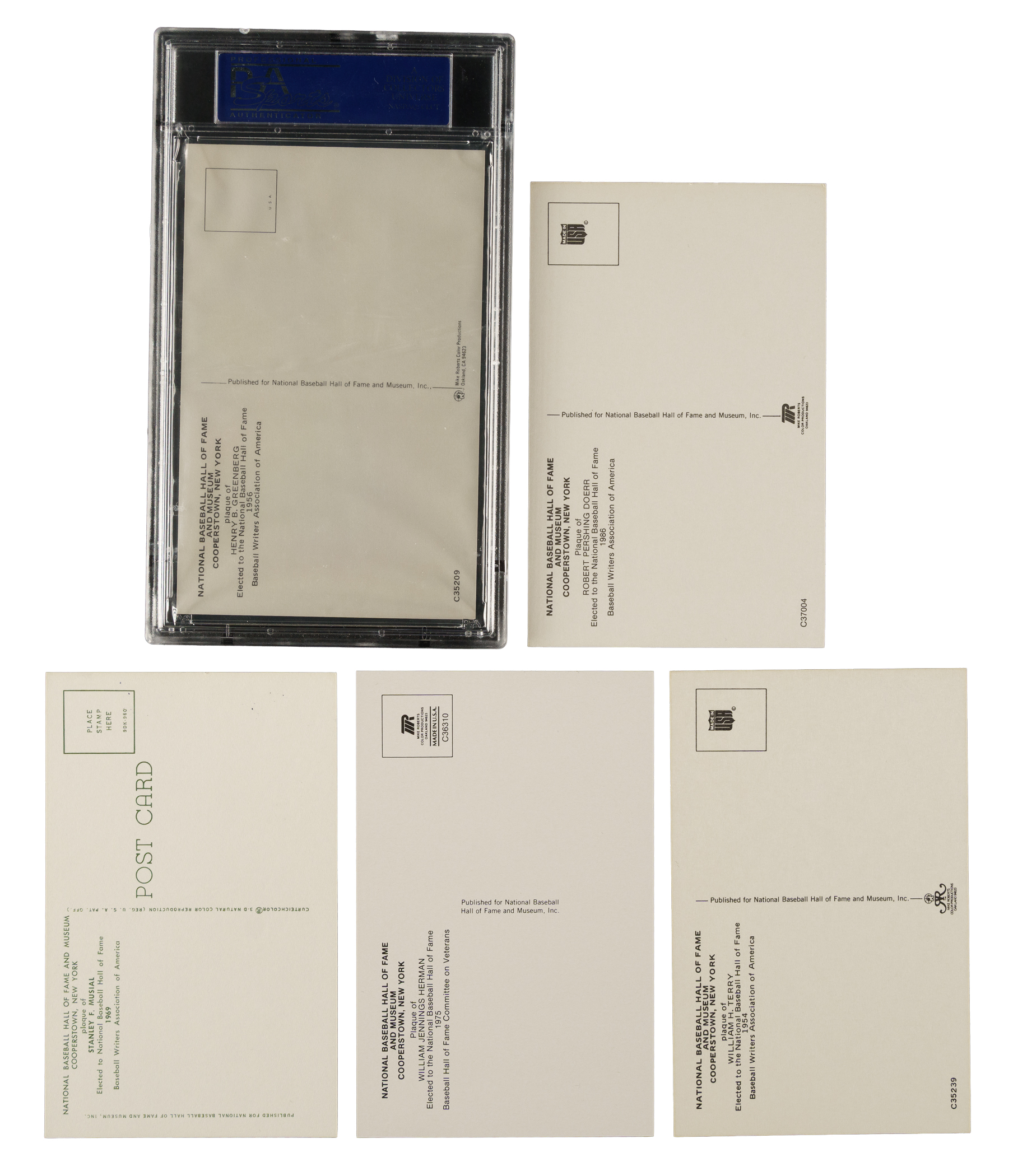 Collection of five signed yellow Hall of Fame postcards. This collection consists of the following: Doerr (Vg), Greenberg (PSA/DNA), Herman (Ex-Mt), Musial (erasure marks, otherwise Vg-Ex), and Terry (Vg-Ex). Total: 5 cards. Auction LOA from James Spence/JSA.