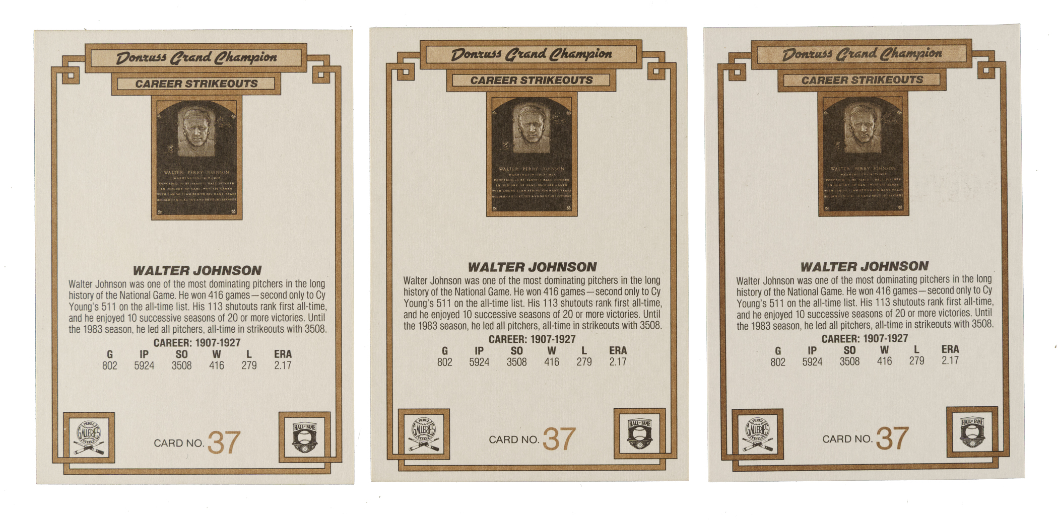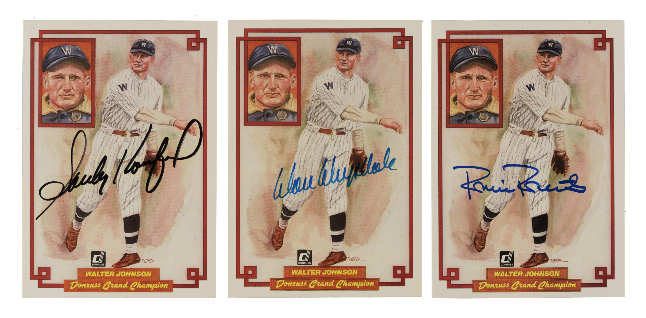Trio of signed 1984 Donruss Grand Champions cards, featuring Los Angeles Dodgers and Philadelphia Phillies Hall of Famers Sandy Koufax, Don Drysdale and Robin Roberts. This trio consists of the following signatures: Drysdale (Vg-Ex), Koufax (Vg-Ex) and Roberts (slight miscut, otherwise Ex-Mt). Total: 3 cards. Auction LOA from James Spence/JSA.