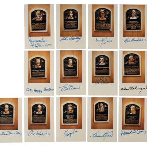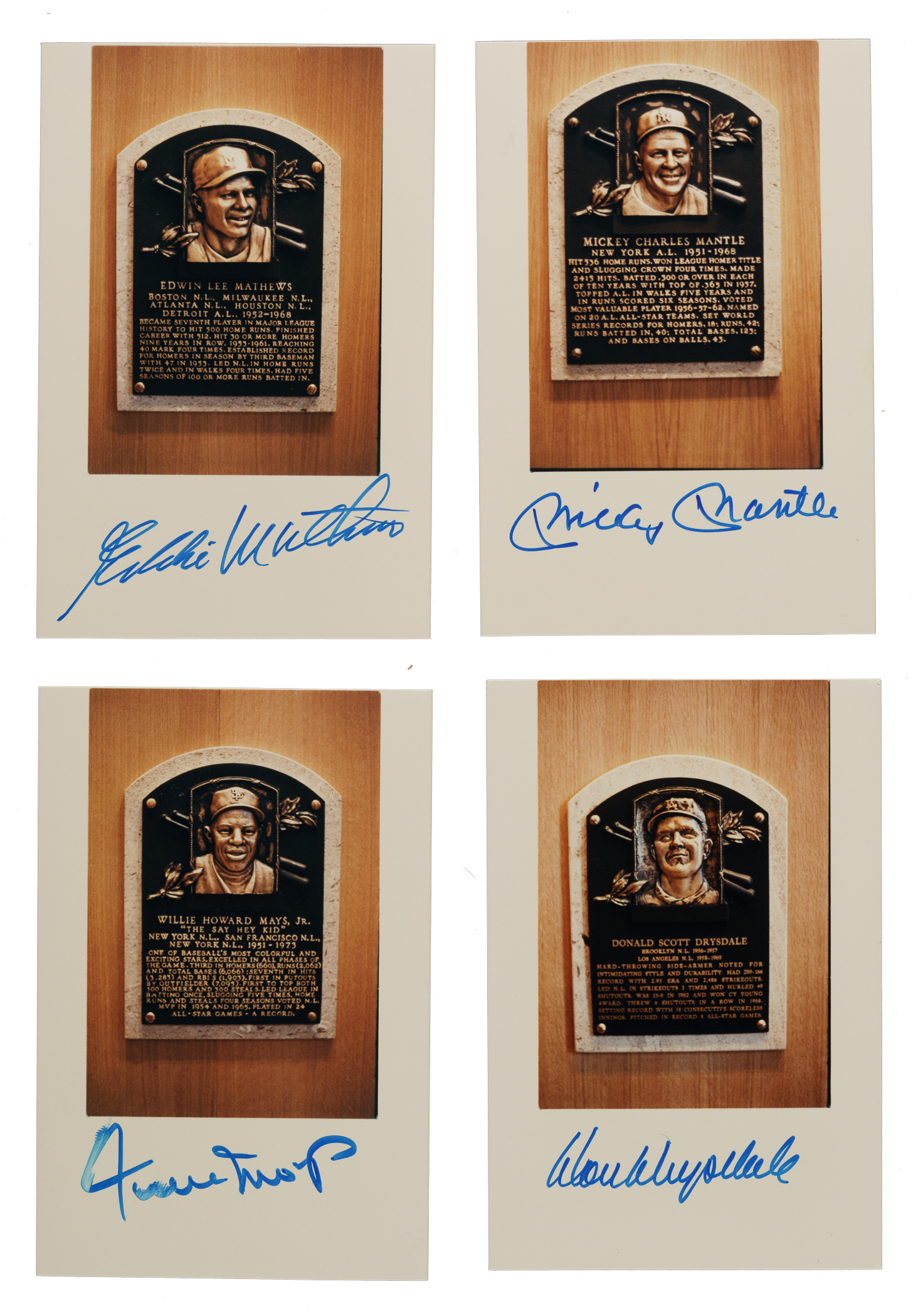 Collection of twenty signed photographs, featuring New York Yankees, Milwaukee Braves and San Francisco Giants Hall of Famers Mickey Mantle, Ed Mathews and Willie Mays. Total dimensions for each photograph 3-1/2 x 5-1/4 Inches. This collection consists of the following signatures: Appling, Banks, Boudreau, Brock, Chandler, Doerr, Drysdale, Feller, Gehringer, Irvin, Kaline, Kell, Killebrew, Mantle, Mathews, Mays, McCovey, Mize, B. Robinson, and Snider. Total: 20 cards. Auction LOA from James Spence/JSA.