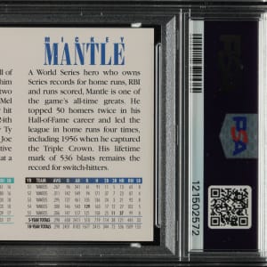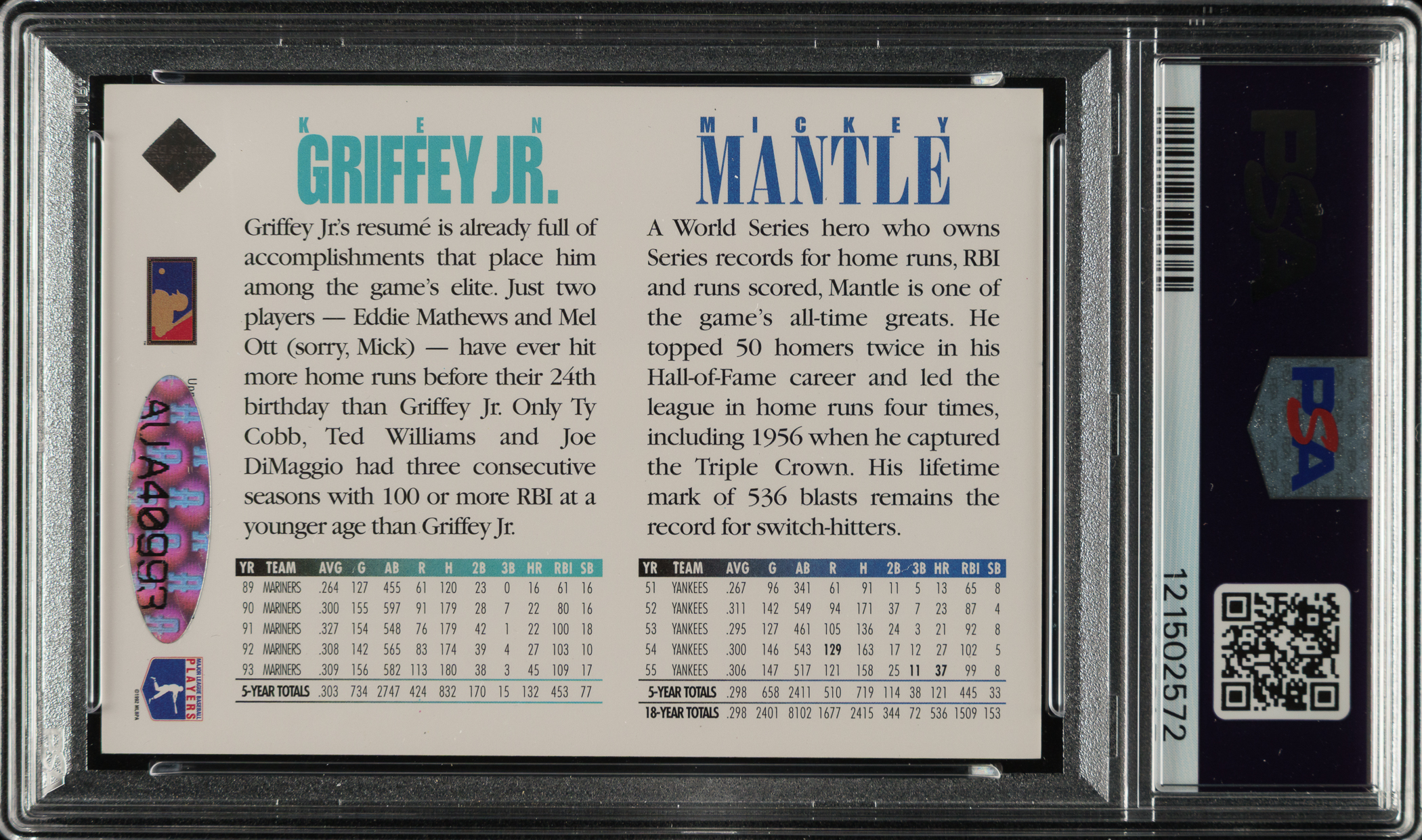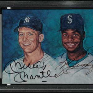 Graded NM 7 by PSA. Regarded as one of the toughest cards to pull from packs in 1994, this Upper Deck insert, which has been signed by two greats of the game in Mickey Mantle and Ken Griffey Jr., has often eluded collectors. Three variations of this card were manufactured and inserted into packs: one signed only by Mantle, one signed only by Griffey Jr., and one signed by both. All three have become iconic in the hobby, with the offered dual-signed version commanding the most respect among collectors. In addition to being noted as one of the earlier pack-pulled autographed cards to hit the market, the unique artwork is also admired by collectors. The concept was innovative and was produced not only during Griffey Jr.'s rise to fame but also just one year prior to Mantle's death. Both players have neatly written their names in black ink across the front. This example has been encapsulated by PSA/DNA with the signatures grading NM-MT 8. Upper Deck has placed an autograph certification sticker on the reverse of the card that reads "AUA40993." This card would make a worthy addition to any Mickey Mantle, Ken Griffey Jr., or modern card collection.
