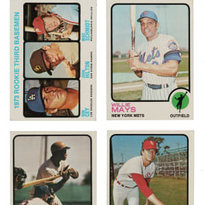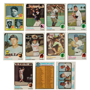 Presented is a complete set of the 1973 Topps series consisting of 660 different cards. The rookie cards of Hall of Famers Mike Schmidt and Rich Gossage, as well as the final cards of Roberto Clemente and Willie Mays, highlight the 1973 Topps issue, one of the most popular sets of the 1970s. Condition is 40% Nr/Mt to Nr/Mt-Mt (including a few Mint), 47% Ex to Ex-Mt, and 13% Vg to Vg-Ex. Keys: #1 Ruth/Mays/Aaron (Ex), 50 Clemente (Vg-Ex), 100 Aaron (Ex+), 130 Rose (30/70 L/R, otherwise Nr/Mt-Mt), 174 Gossage RC (Vg-Ex+), 193 Fisk (Vg-Ex), 220 Ryan (Vg+), 280 Kaline (Ex due to centering), 305 Mays (Ex), 380 Bench (measures narrow, otherwise Ex-Mt), 588 Checklist (Vg-Ex), 614 Evans RC (30/70 L/R, otherwise Nr/Mt-Mt), and 615 Schmidt RC (Vg-Ex+). This is a very attractive mid- to high-grade 1973 Topps complete set with numerous highlights. Total: 660 cards.