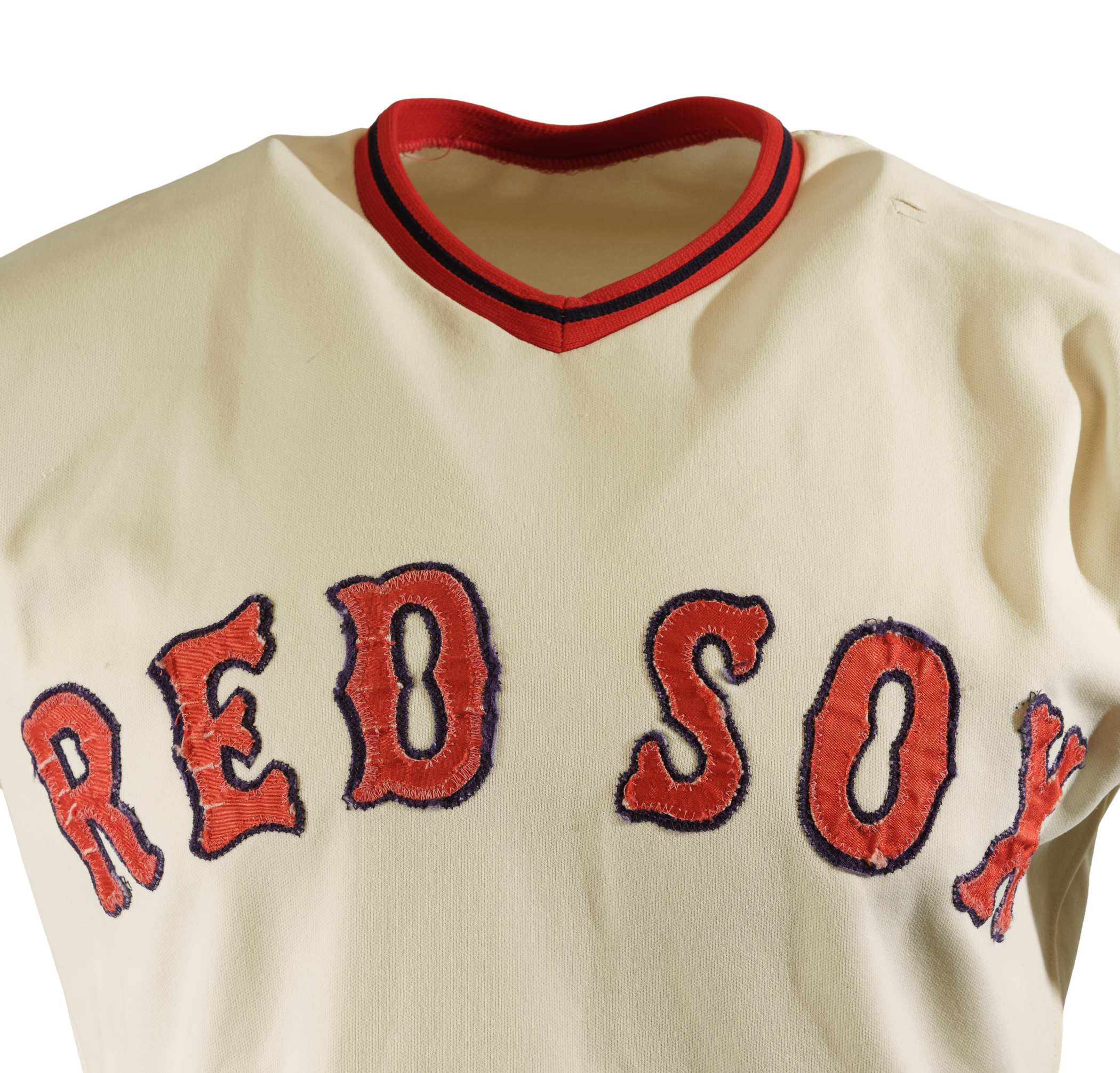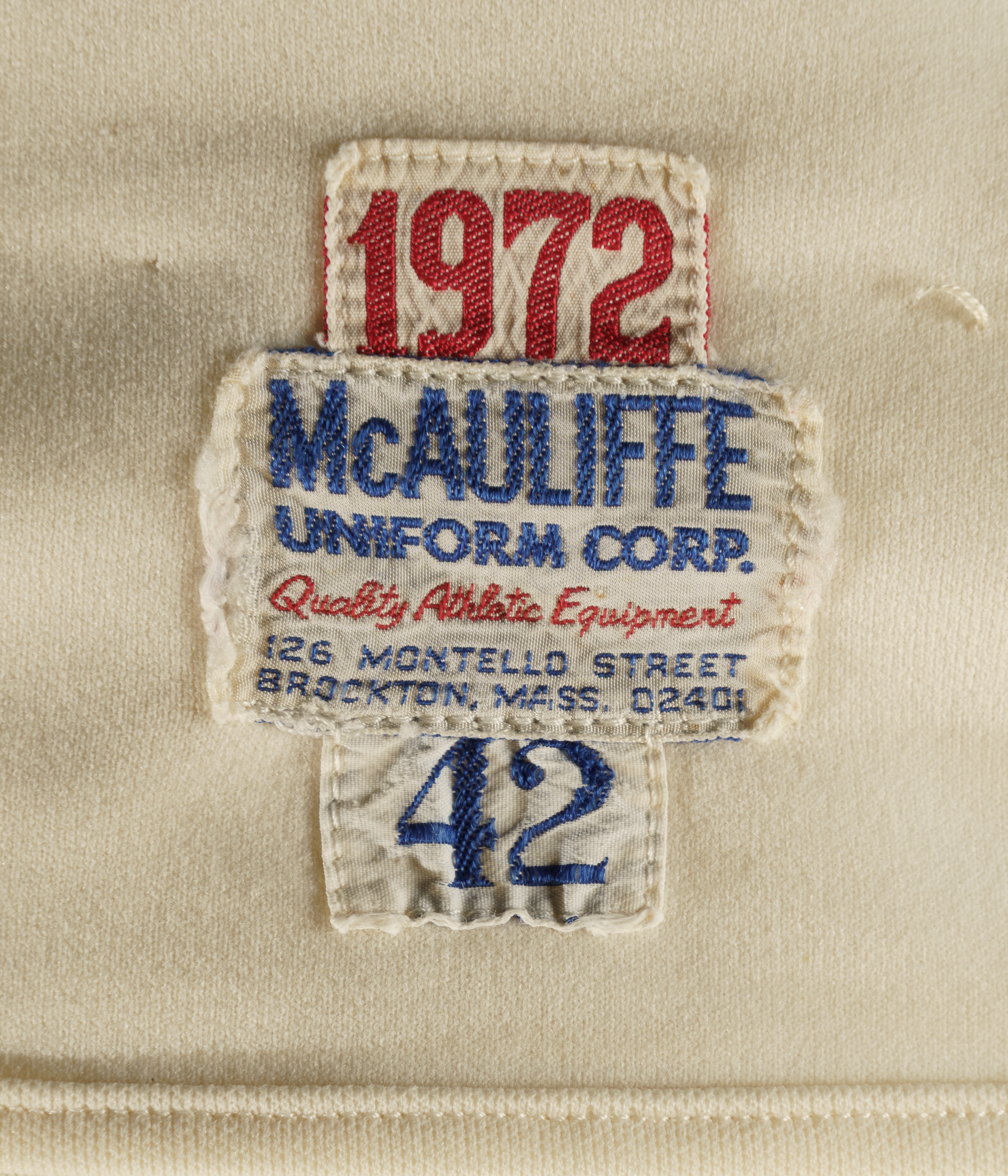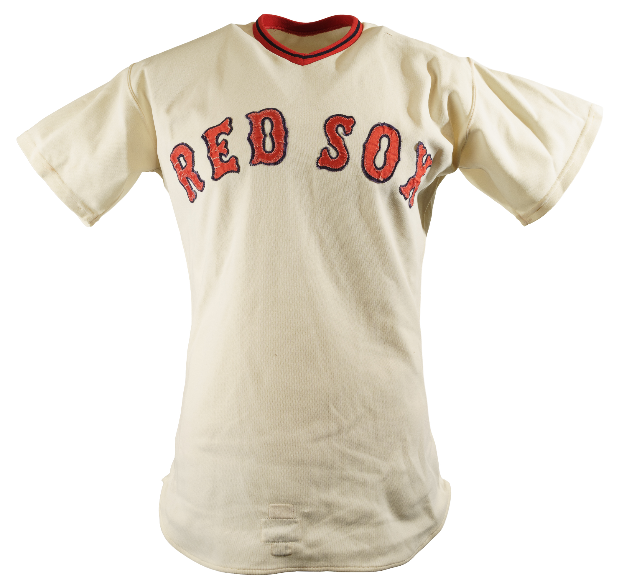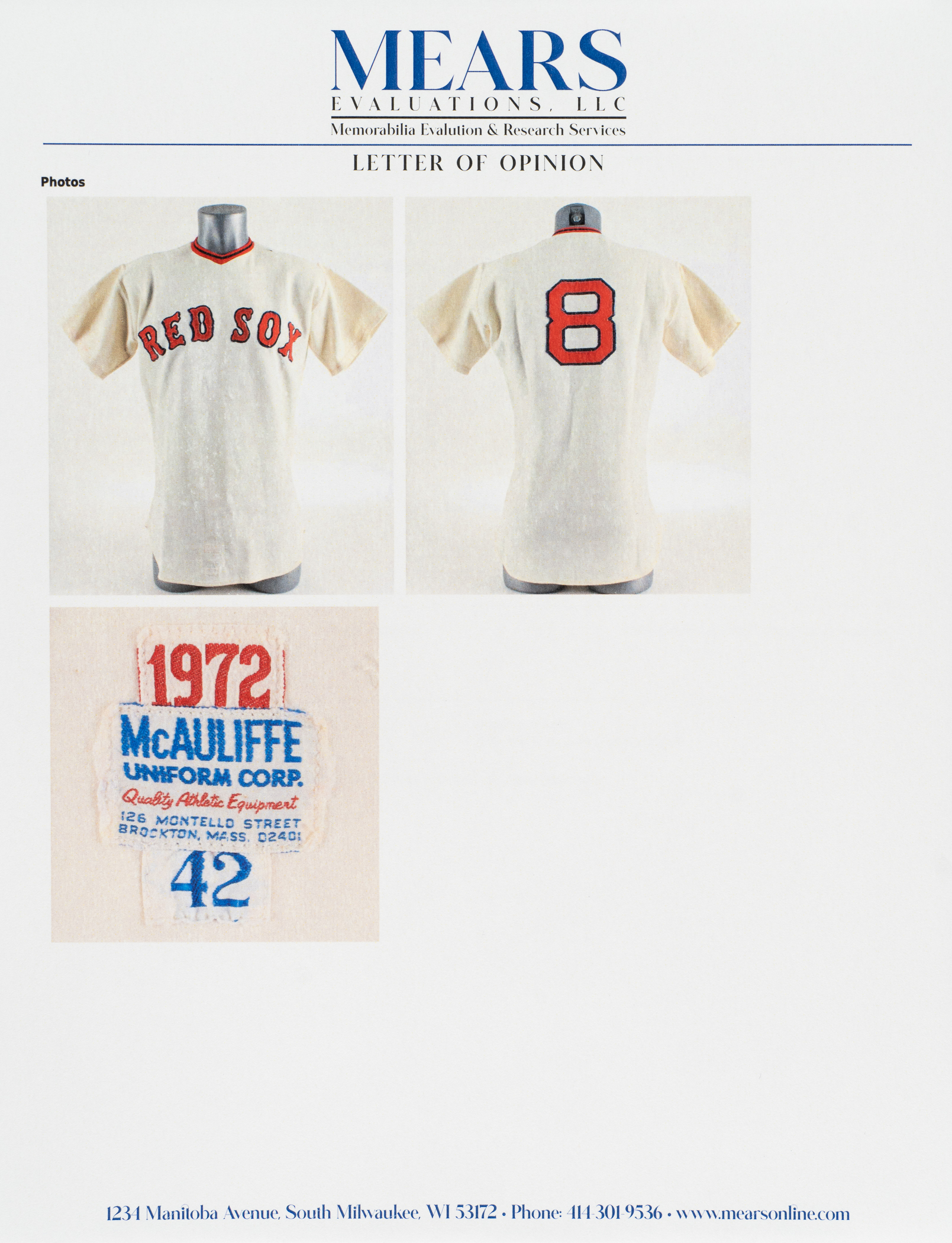 Boston Red Sox home jersey worn by Hall of Fame outfielder Carl Yastrzemski during the 1972 season. Graded A9 by MEARS. The white knit jersey is lettered "Red Sox" across the front and features the number "8" on the reverse. All letters and numerals are appliquéd in red on blue tackle twill. Located on the interior front tail are a "1972" year tag, a "McAuliffe" label, and a "42" size tag. The jersey, which is completely original, is unaltered and displays heavy use. This shirt originated from the family member of a Boston Red Sox player. One of the greatest players in Red Sox history, Yastrzemski is one of only a few players in all of baseball to amass over 400 home runs and 3,000 hits. Among his many other individual accomplishments and awards are three batting titles, a home run title, a Triple Crown, an MVP Award and seven Gold Glove Awards. Today, his number "8" is among the few ever retired by the Red Sox. He was elected to the Hall of Fame in 1989. Graded A9 by MEARS (base grade of 10, with 1 point deducted for thread remnants and fading to twill). Full LOA from MEARS.