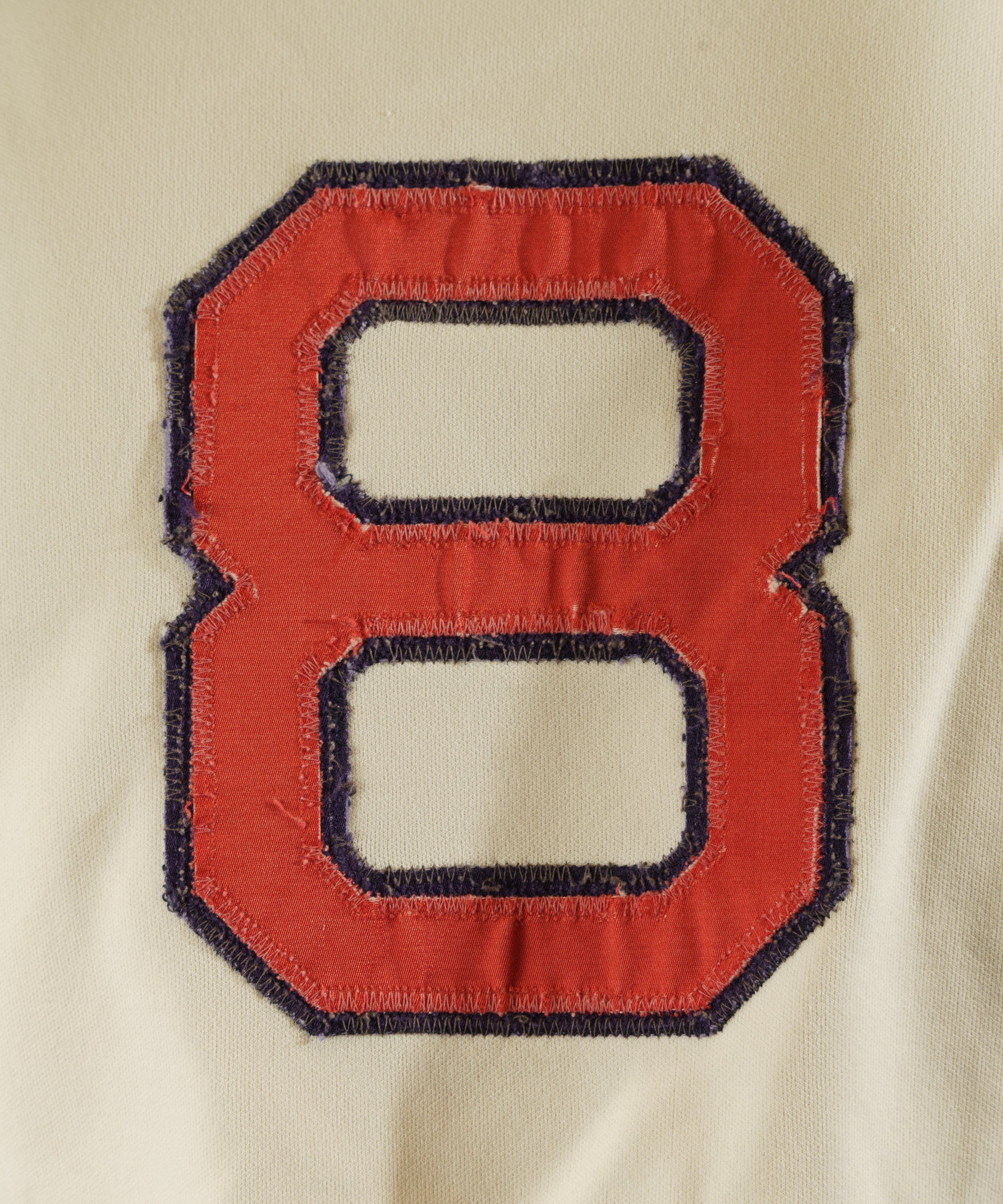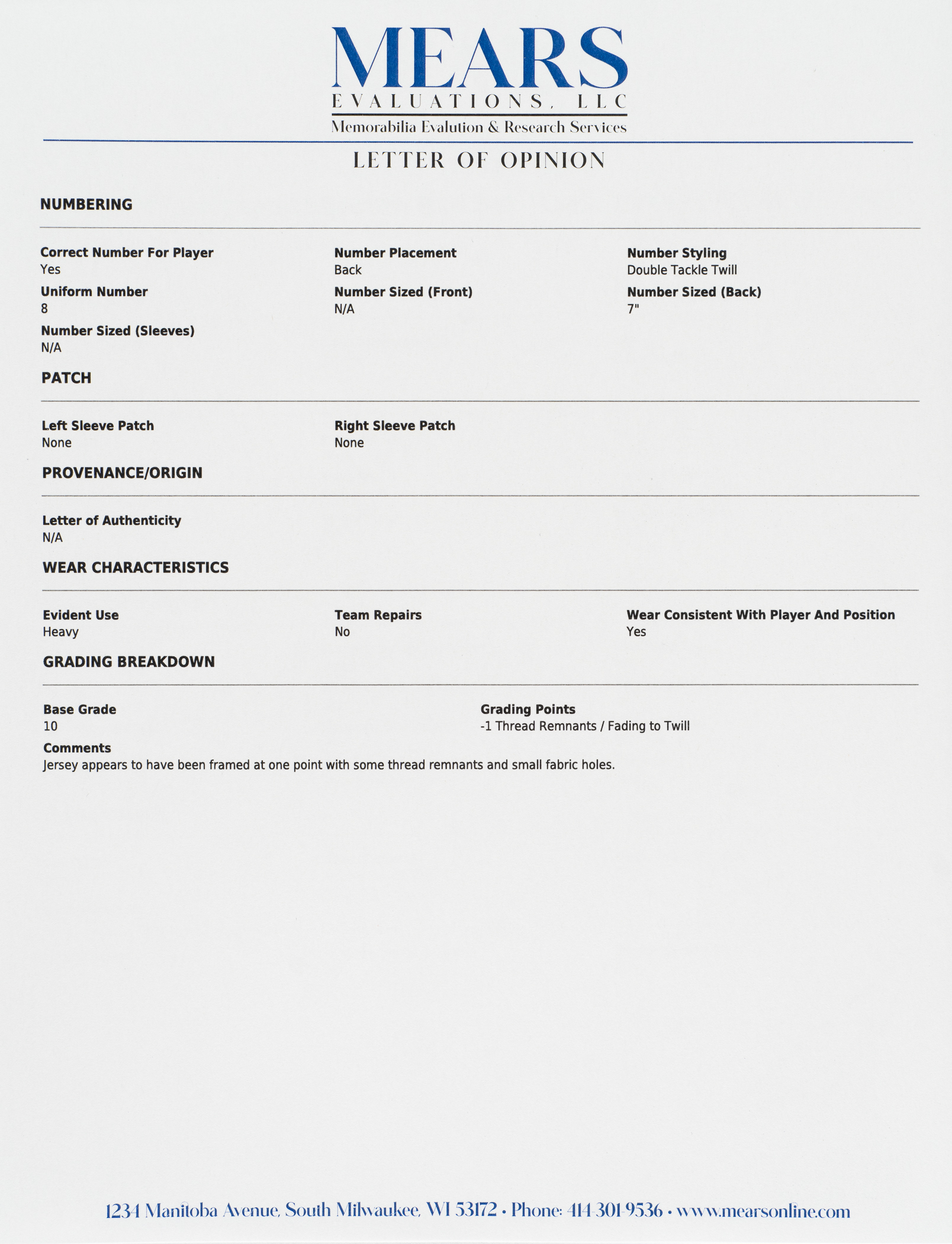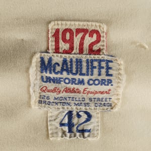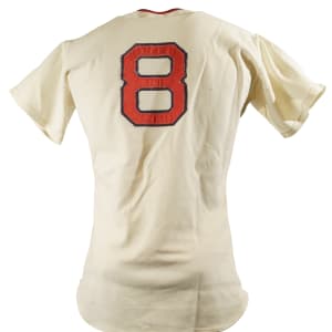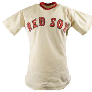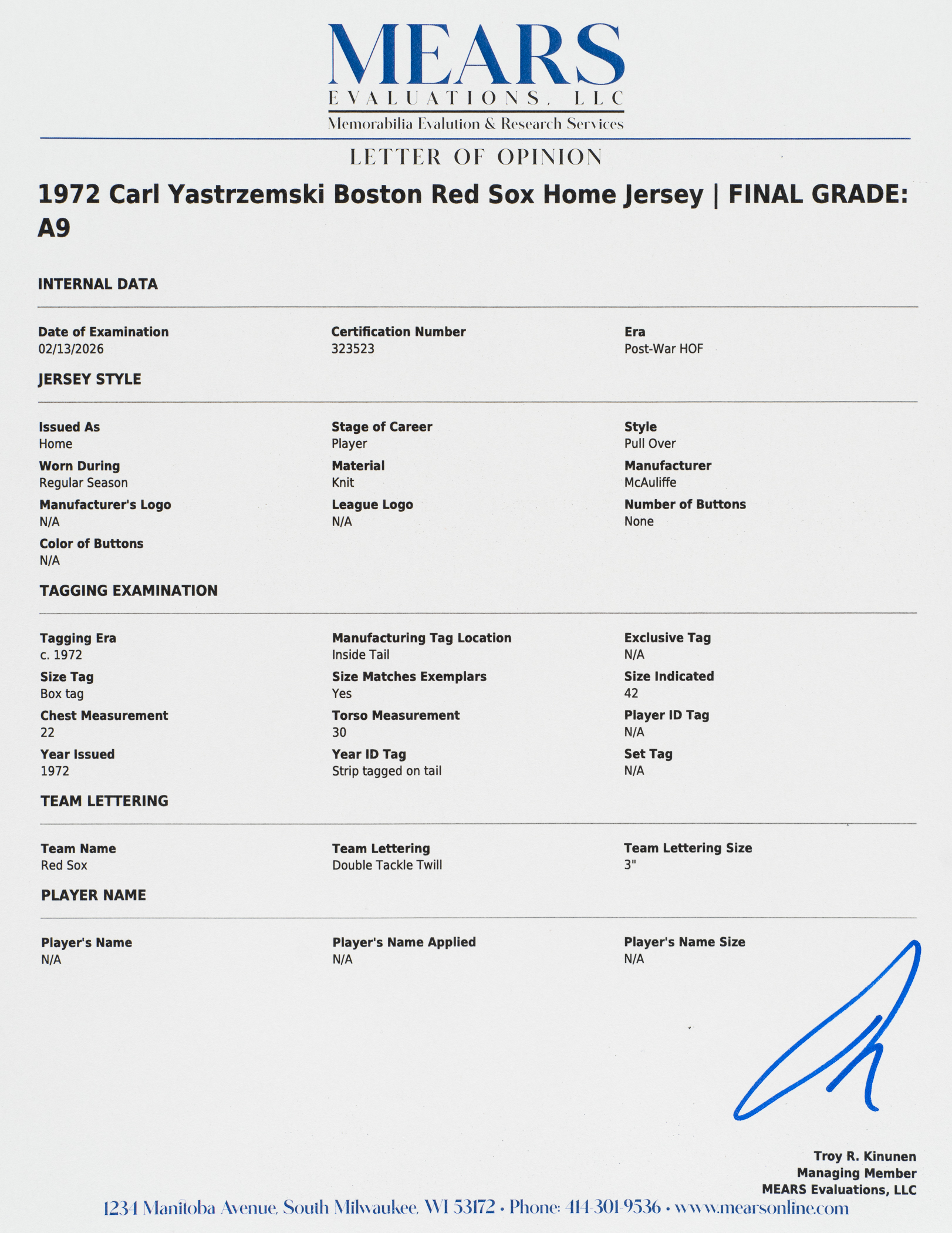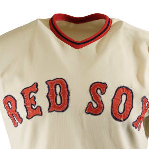 Boston Red Sox home jersey worn by Hall of Fame outfielder Carl Yastrzemski during the 1972 season. Graded A9 by MEARS. The white knit jersey is lettered "Red Sox" across the front and features the number "8" on the reverse. All letters and numerals are appliquéd in red on blue tackle twill. Located on the interior front tail are a "1972" year tag, a "McAuliffe" label, and a "42" size tag. The jersey, which is completely original, is unaltered and displays heavy use. This shirt originated from the family member of a Boston Red Sox player. One of the greatest players in Red Sox history, Yastrzemski is one of only a few players in all of baseball to amass over 400 home runs and 3,000 hits. Among his many other individual accomplishments and awards are three batting titles, a home run title, a Triple Crown, an MVP Award and seven Gold Glove Awards. Today, his number "8" is among the few ever retired by the Red Sox. He was elected to the Hall of Fame in 1989. Graded A9 by MEARS (base grade of 10, with 1 point deducted for thread remnants and fading to twill). Full LOA from MEARS.