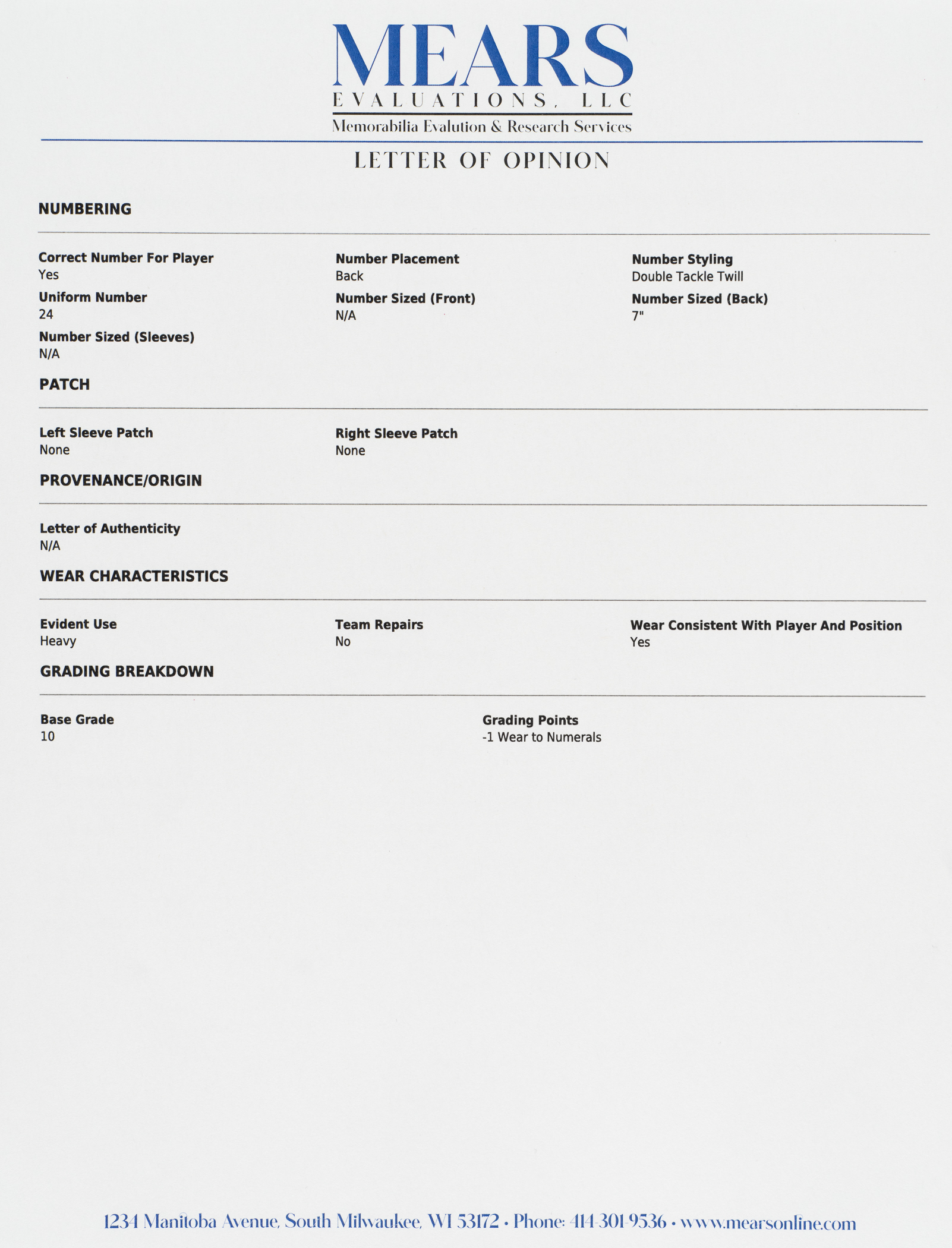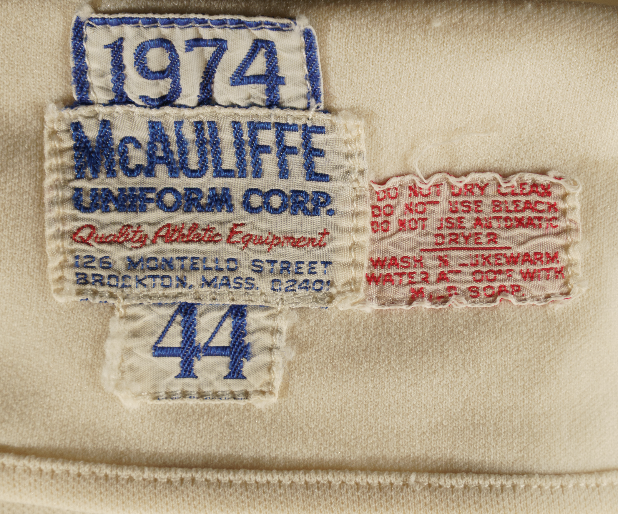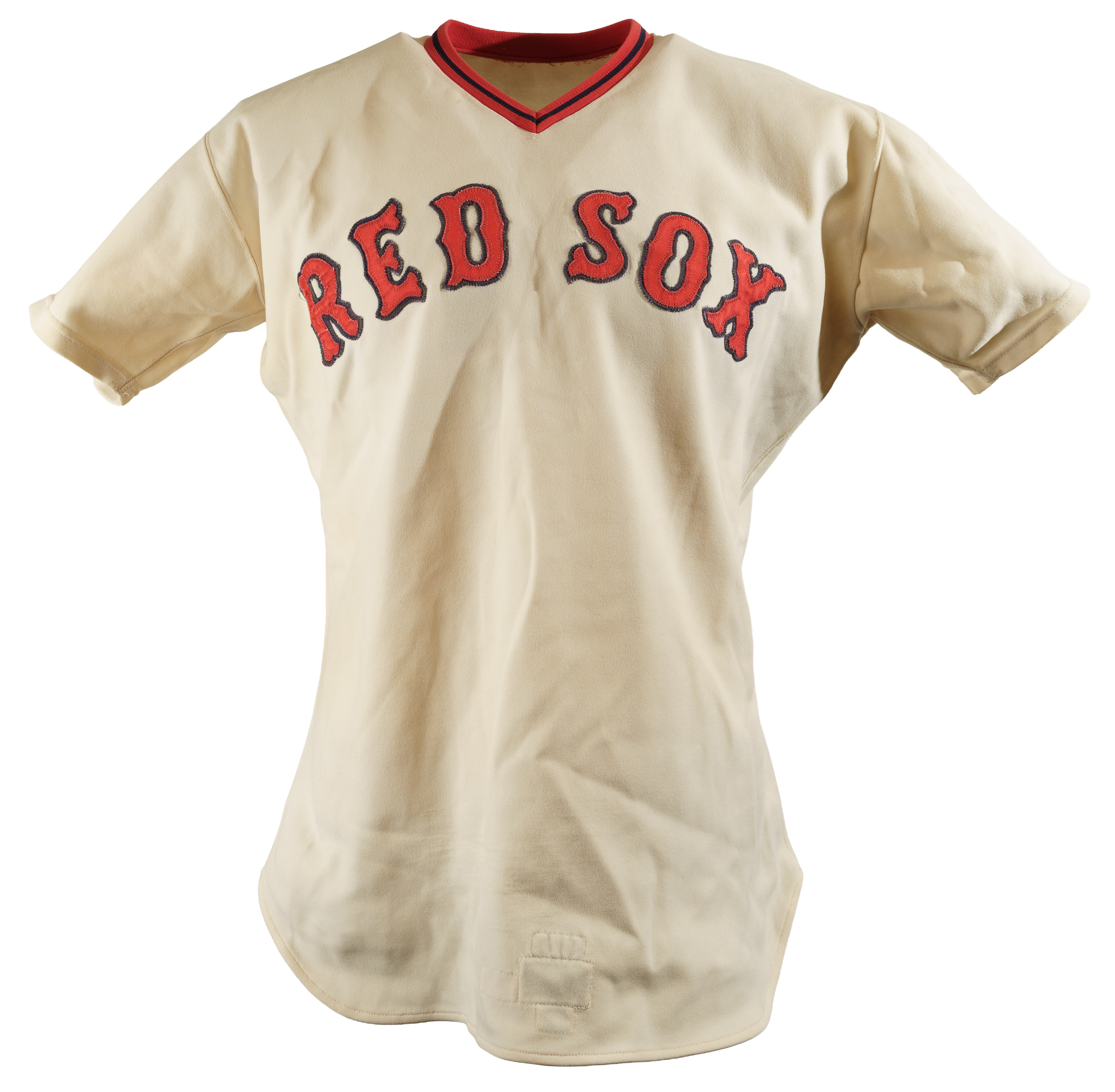 Boston Red Sox home jersey worn by star outfielder Dwight Evans during the 1974 season. Graded A9 by MEARS. The white knit jersey is lettered "Red Sox" across the front and features the number "24" on the reverse. All letters and numerals are appliquéd in red on blue tackle twill. Located on the interior front tail are a "1974" year tag, a "McAuliffe" label, a "44" size tag, and a laundry tag. The jersey, which is completely original, is unaltered and displays heavy use. This shirt originated from the family member of a Boston Red Sox player. Evans played in 133 games with Boston in 1974, batting .281 with 10 home runs and 70 RBI in 463 at bats. Evans led the American League in home runs in 1981 and batted a career high .305 in 1987. He retired after the 1991 season with .272 lifetime average and 385 home runs. Graded A9 by MEARS (base grade of 10, with 1 point deducted for wear to the numerals). Full LOA from MEARS.