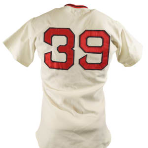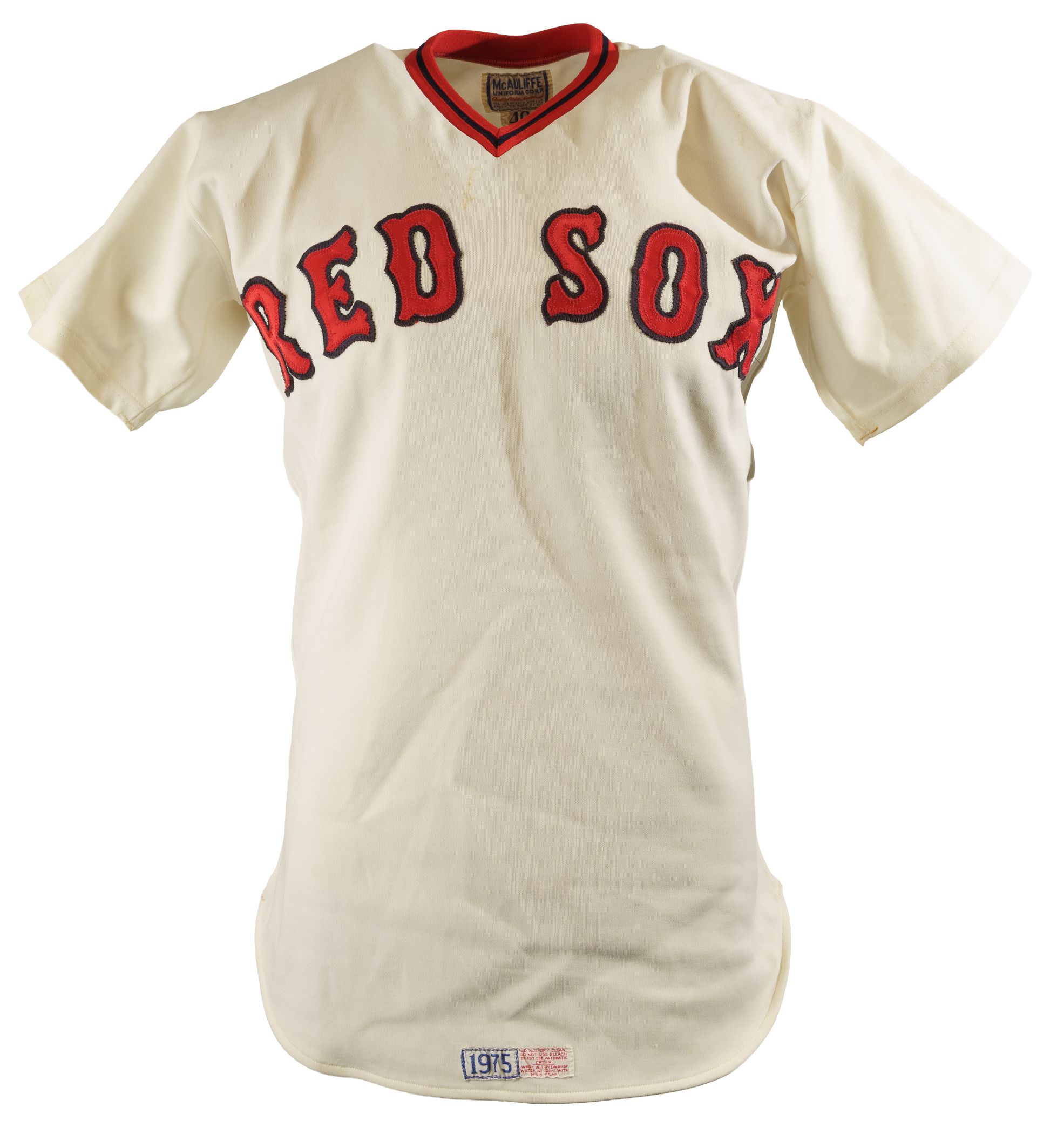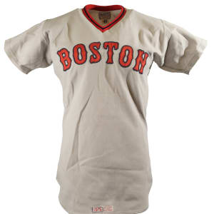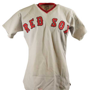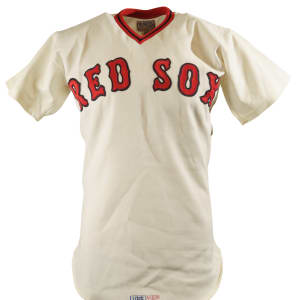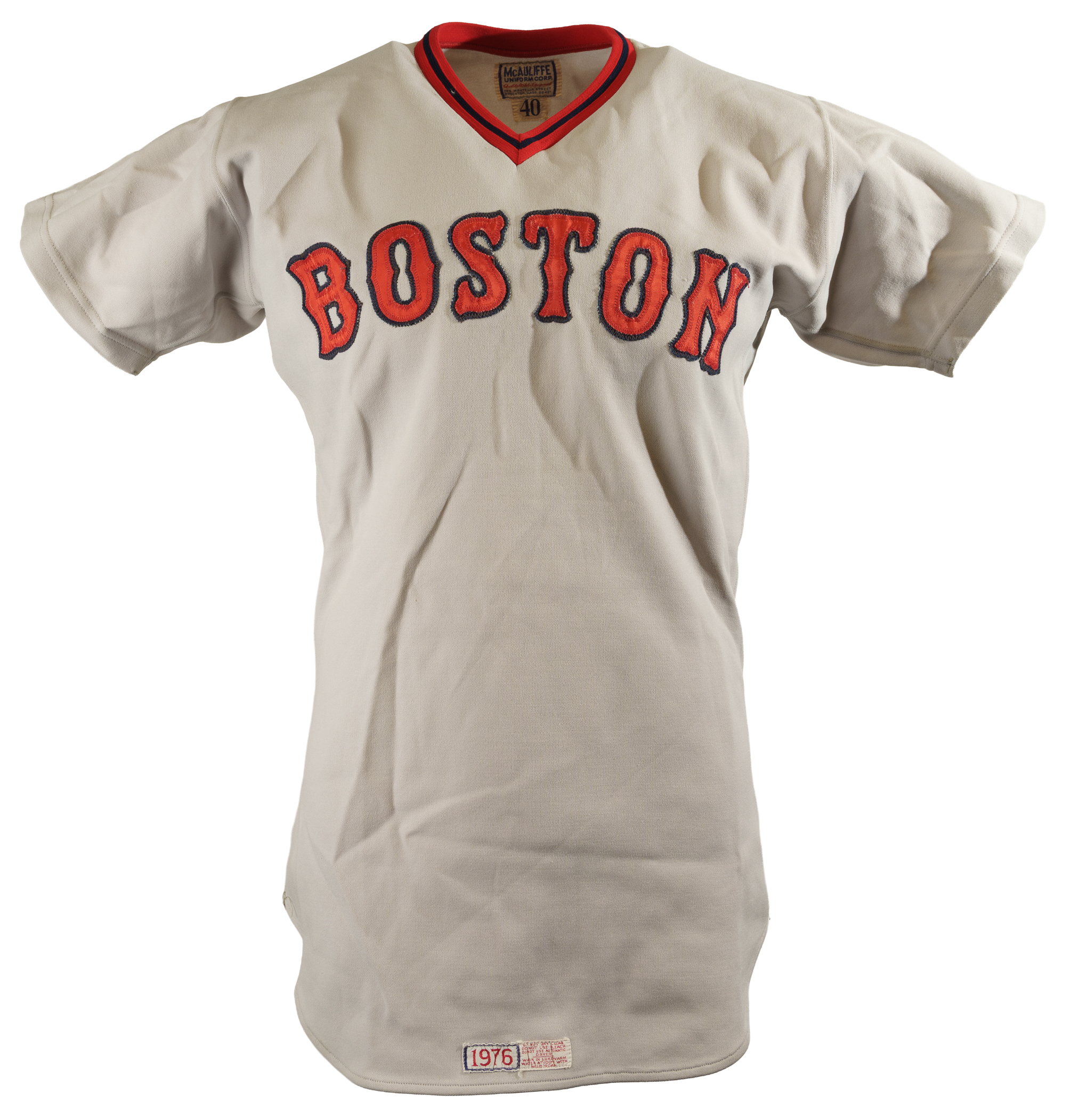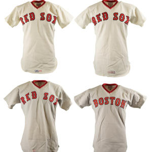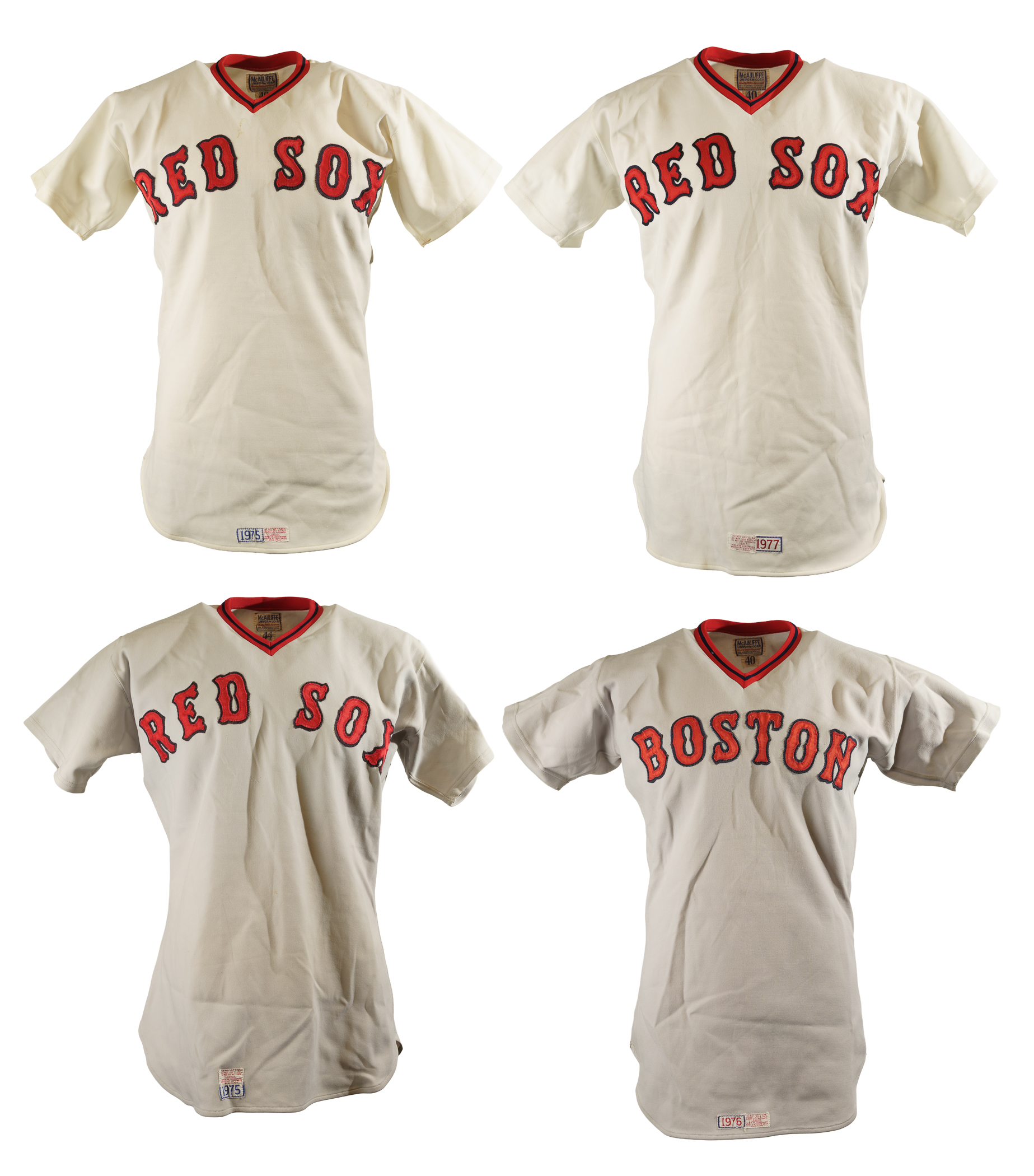 Collection of four Boston Red Sox game-used jerseys (two home and two road), dating from the 1970s, all of which have the unique provenance of having originated from the family member of a Boston Red Sox player. The jerseys offered here are the following: 1) 1975 Tim Blackwell Red Sox home jersey. The white knit home jersey is lettered "Red Sox" on the front and features the number "39" on the reverse. All letters and numerals are appliquéd in red on blue tackle twill. Both a "McAuliffe" label and "40" size tag appear in the collar. A "1975" year tag and laundry tag are located on the exterior center front tail. The jersey, which is completely original, is unaltered and displays light use. 2) 1975 Dick Drago Red Sox road jersey. The gray knit road jersey is lettered "Red Sox" on the front and features the number "41" on the reverse. All letters and numerals are appliquéd in red on blue tackle twill. Both a "McAuliffe" label and "44" size tag appear in the collar. A "1975" year tag and laundry tag are located on the exterior center front tail. The jersey, which is completely original, is unaltered and displays light to moderate use, including scattered staining on the reverse. 3) 1976 Bob Heise Red Sox road jersey. The gray knit road jersey is lettered "Boston" on the front and features the number "12" on the reverse. All letters and numerals are appliquéd in red on blue tackle twill. Both a "McAuliffe" label and "40" size tag appear in the collar. A "1976" year tag and laundry tag are located on the exterior center front tail. The jersey, which is completely original, is unaltered and displays light use. 4) 1977 Bob Montgomery Red Sox home jersey. The white knit home jersey is lettered "Red Sox" on the front and features the number "10" on the reverse. All letters and numerals are appliquéd in red on blue tackle twill. Both a "McAuliffe" label and "40" size tag appear in the collar. A "1977" year tag and laundry tag are located on the exterior center front tail. The jersey, which is completely original, is unaltered and displays light use. Total: 4 jerseys.