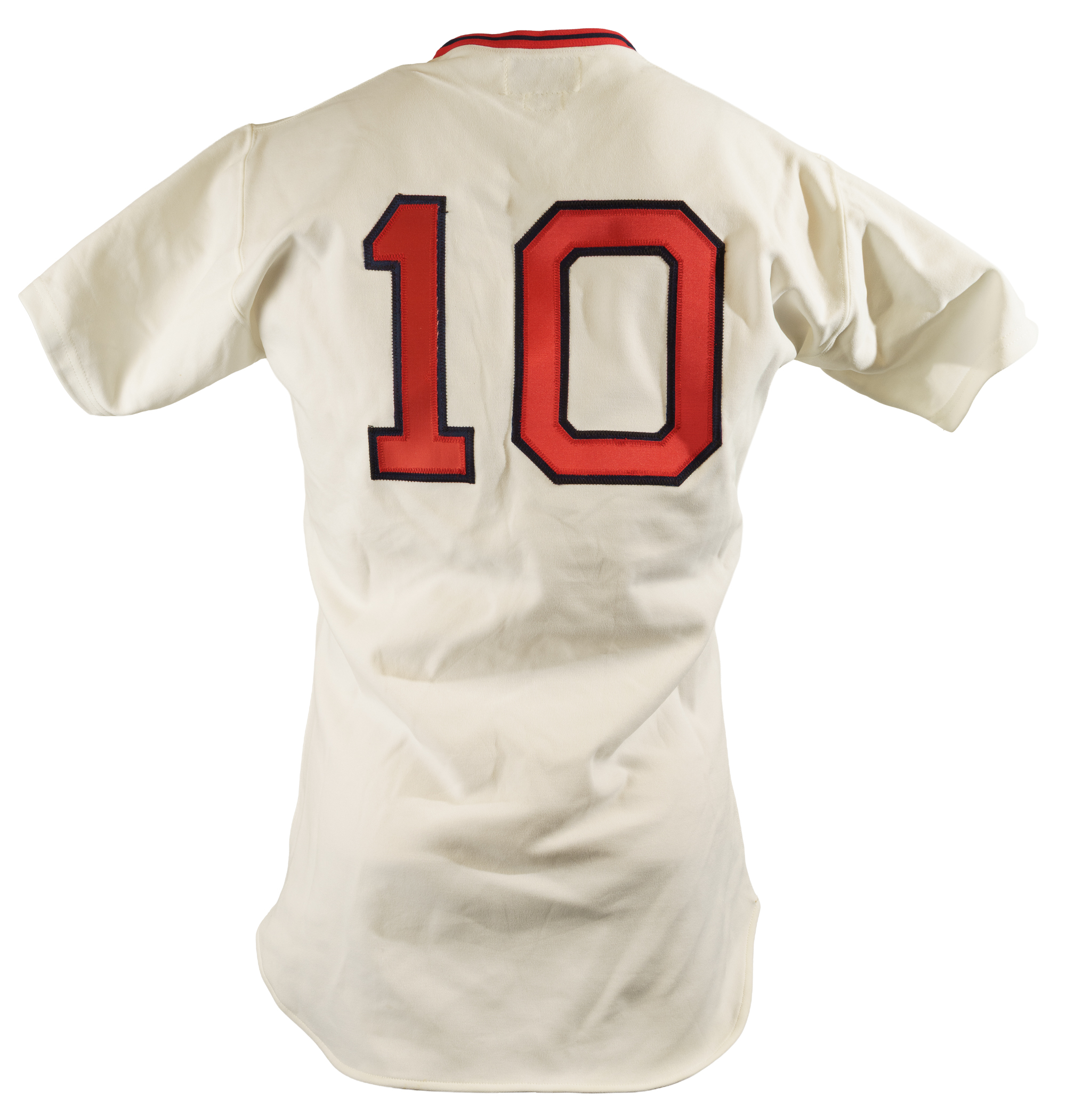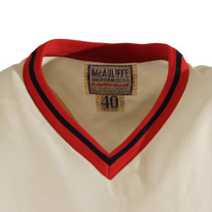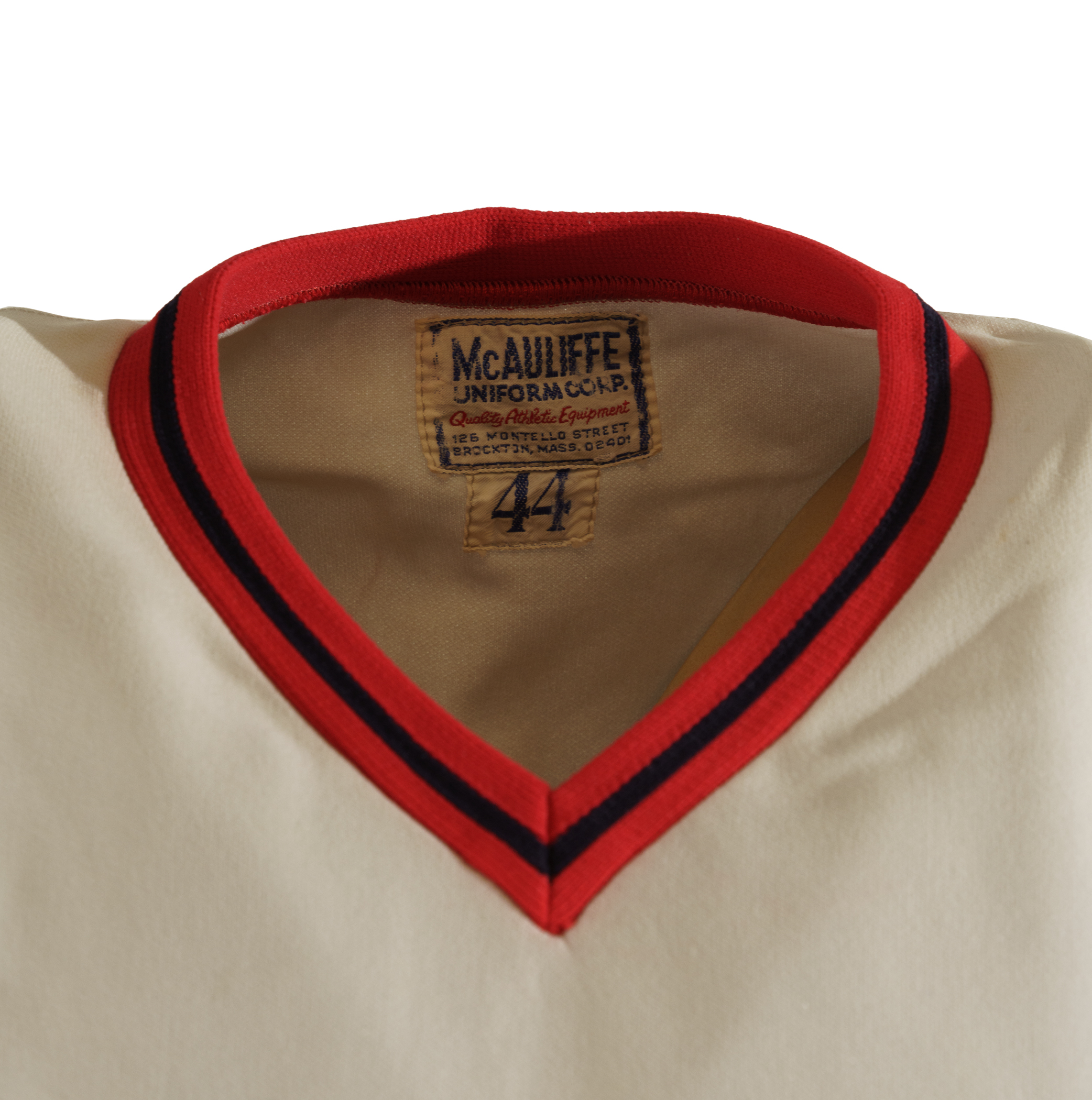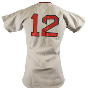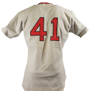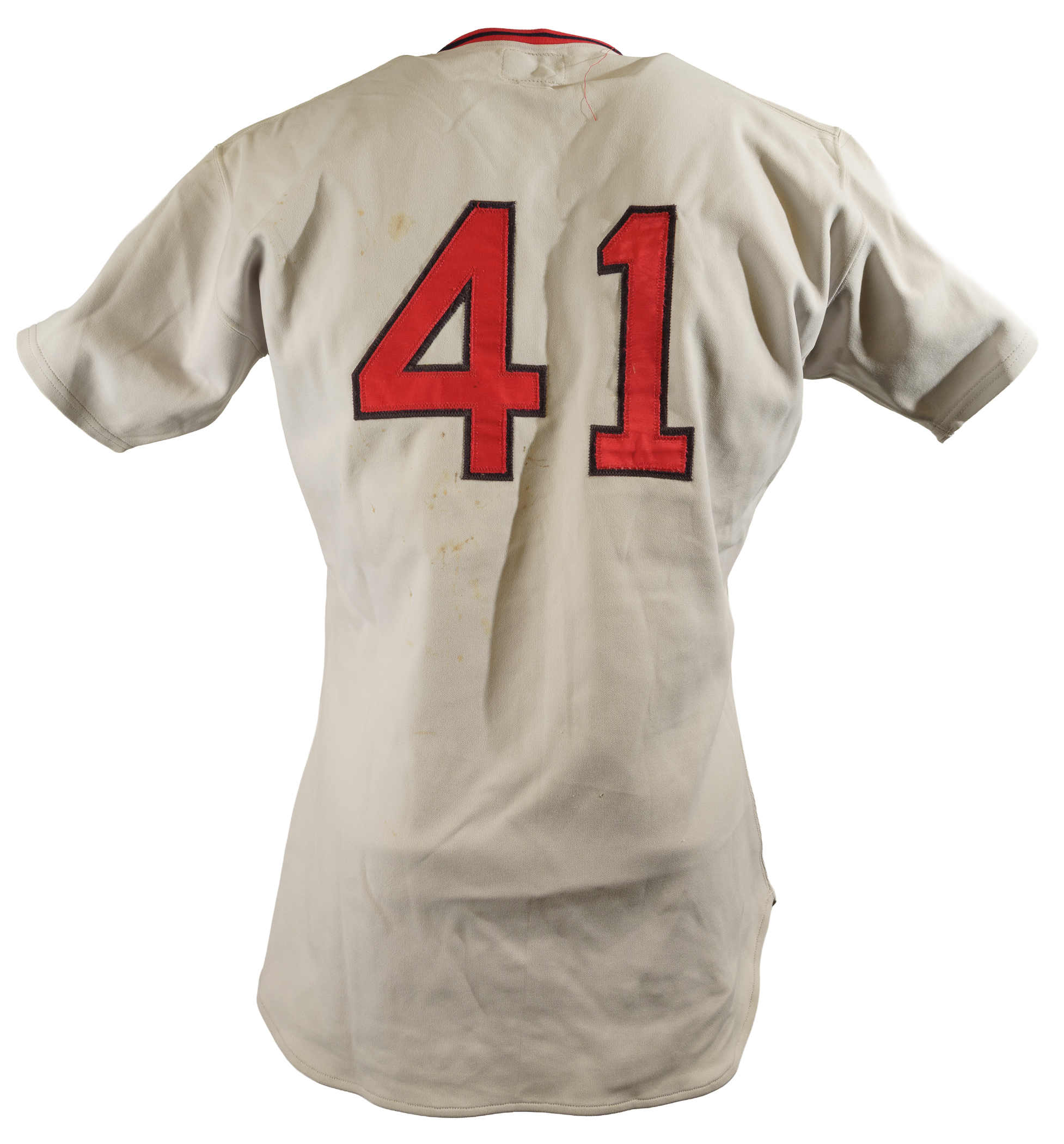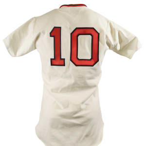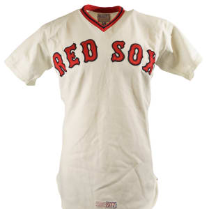 Collection of four Boston Red Sox game-used jerseys (two home and two road), dating from the 1970s, all of which have the unique provenance of having originated from the family member of a Boston Red Sox player. The jerseys offered here are the following: 1) 1975 Tim Blackwell Red Sox home jersey. The white knit home jersey is lettered "Red Sox" on the front and features the number "39" on the reverse. All letters and numerals are appliquéd in red on blue tackle twill. Both a "McAuliffe" label and "40" size tag appear in the collar. A "1975" year tag and laundry tag are located on the exterior center front tail. The jersey, which is completely original, is unaltered and displays light use. 2) 1975 Dick Drago Red Sox road jersey. The gray knit road jersey is lettered "Red Sox" on the front and features the number "41" on the reverse. All letters and numerals are appliquéd in red on blue tackle twill. Both a "McAuliffe" label and "44" size tag appear in the collar. A "1975" year tag and laundry tag are located on the exterior center front tail. The jersey, which is completely original, is unaltered and displays light to moderate use, including scattered staining on the reverse. 3) 1976 Bob Heise Red Sox road jersey. The gray knit road jersey is lettered "Boston" on the front and features the number "12" on the reverse. All letters and numerals are appliquéd in red on blue tackle twill. Both a "McAuliffe" label and "40" size tag appear in the collar. A "1976" year tag and laundry tag are located on the exterior center front tail. The jersey, which is completely original, is unaltered and displays light use. 4) 1977 Bob Montgomery Red Sox home jersey. The white knit home jersey is lettered "Red Sox" on the front and features the number "10" on the reverse. All letters and numerals are appliquéd in red on blue tackle twill. Both a "McAuliffe" label and "40" size tag appear in the collar. A "1977" year tag and laundry tag are located on the exterior center front tail. The jersey, which is completely original, is unaltered and displays light use. Total: 4 jerseys.