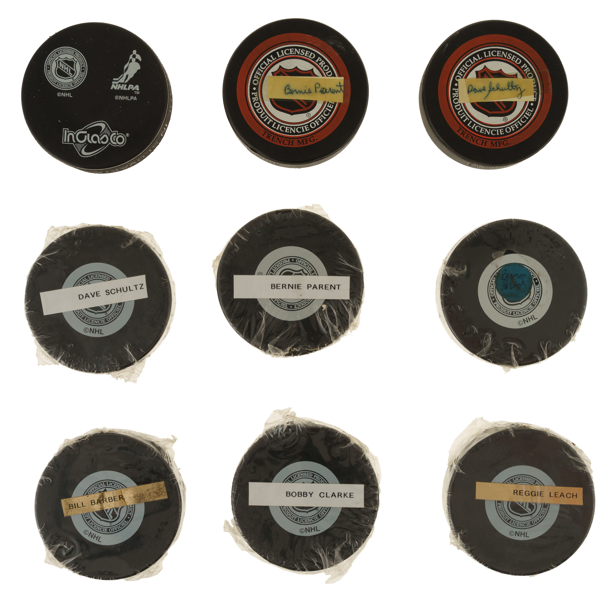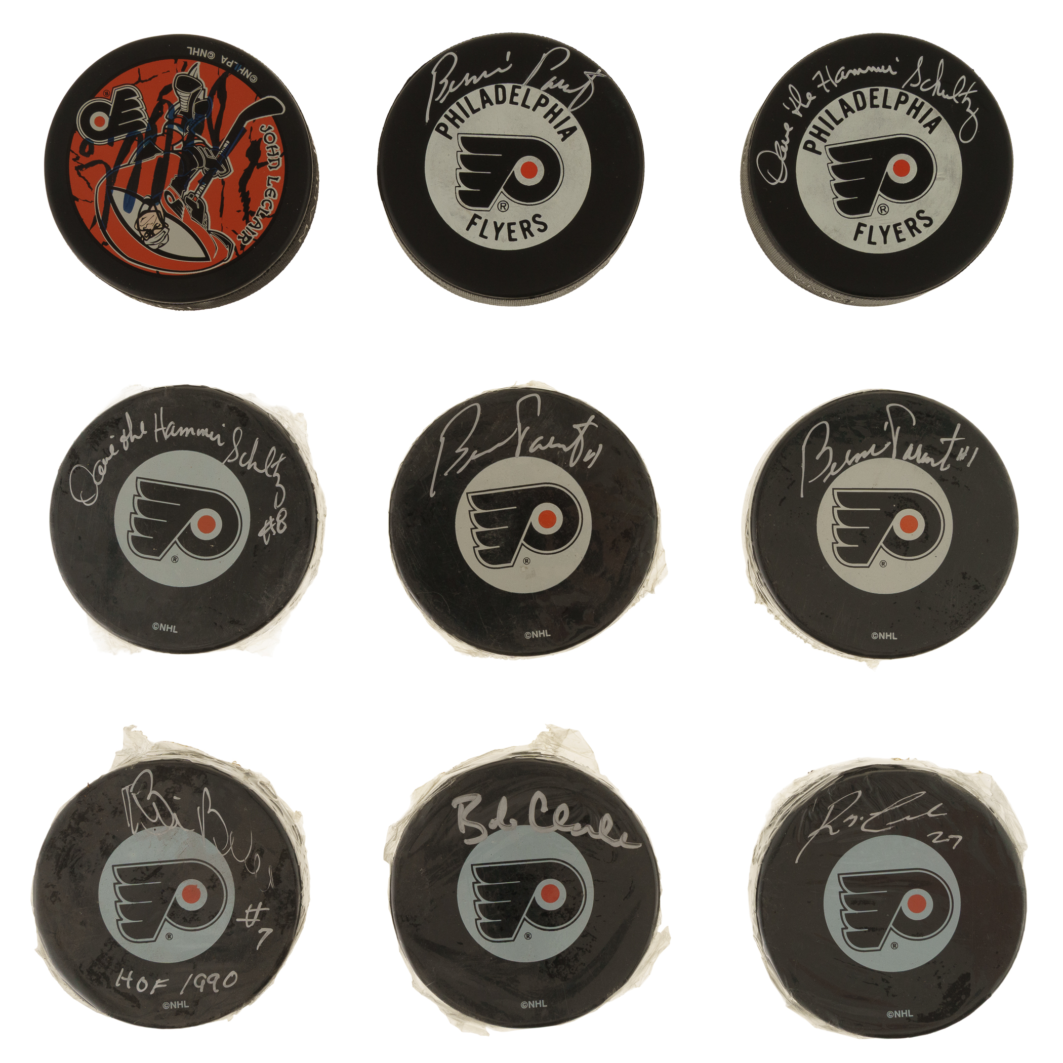 Collection of nine signed hockey pucks featuring legendary Hall of Famers and stars from the Philadelphia Flyers. This collection consists of the following: Bill Barber (#7 - HOF 1990), Bobby Clarke, Reggie Leach (27), John LeClair (10), three Bernie Parent (two with #1), and two Dave Schultz ("The Hamer," one with #8). Total: 9 signed pucks. Auction LOA from James Spence/JSA. The size/weight of this item requires that there will be an additional shipping charge for this lot.