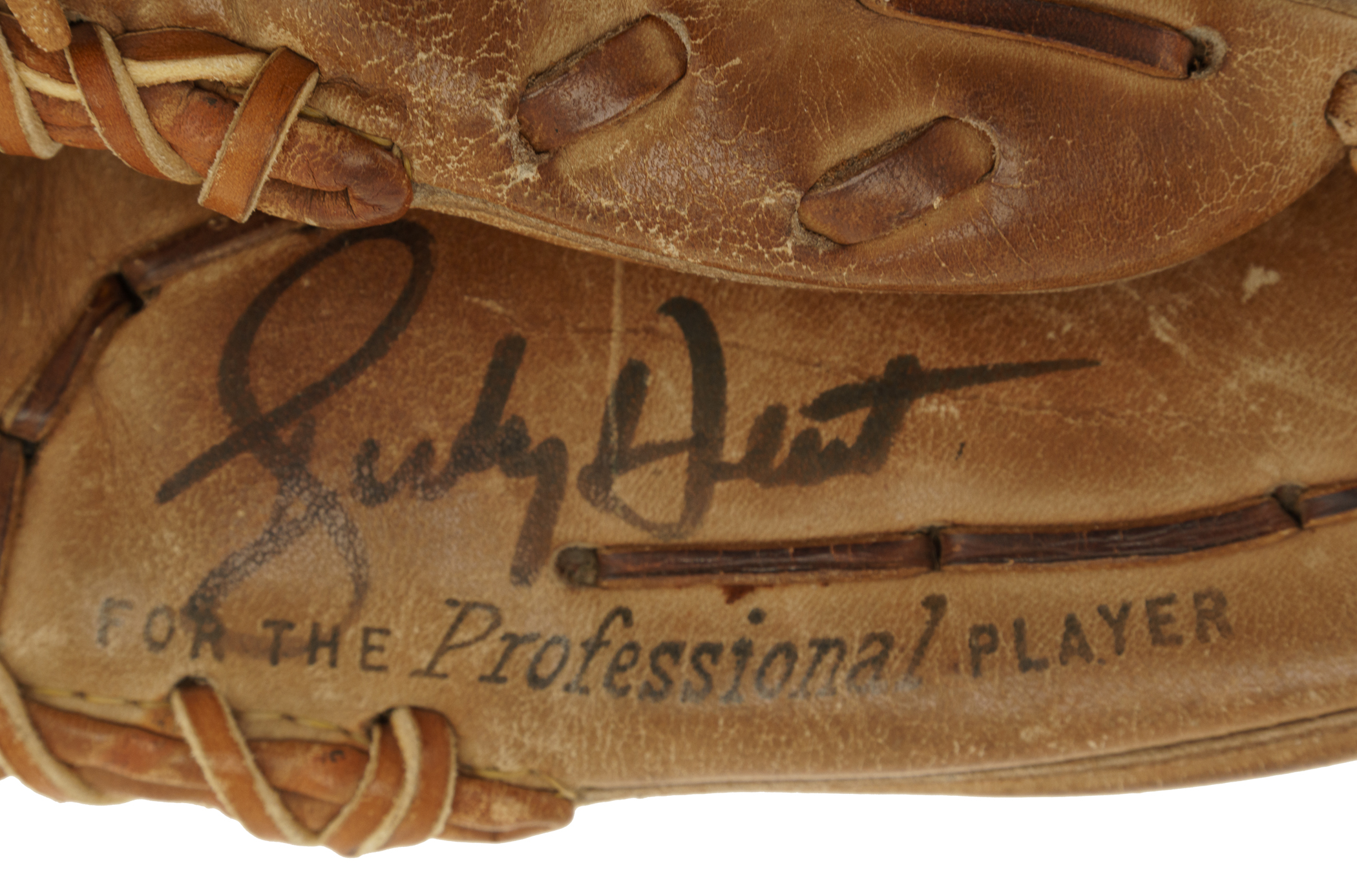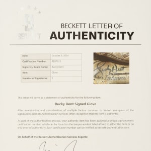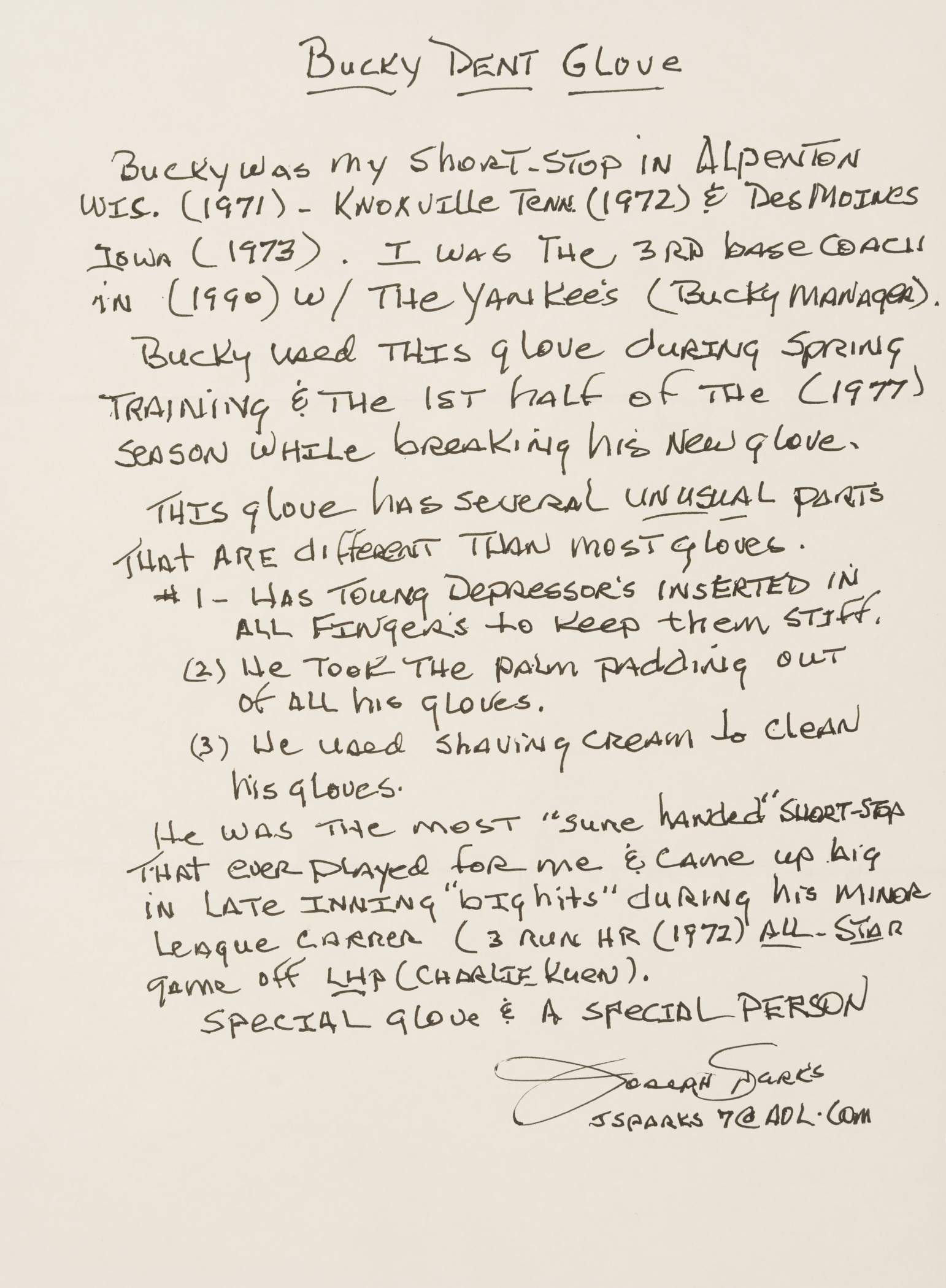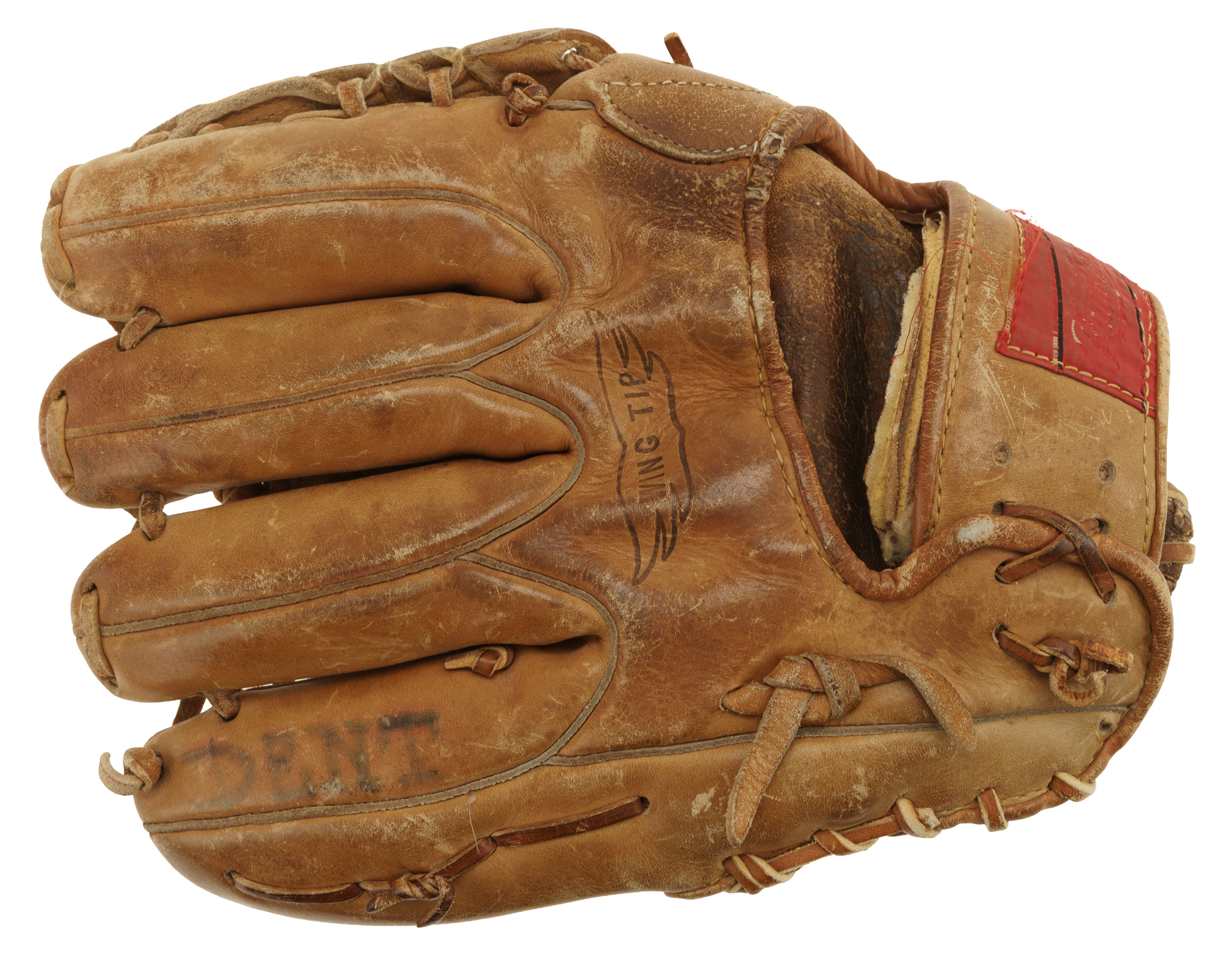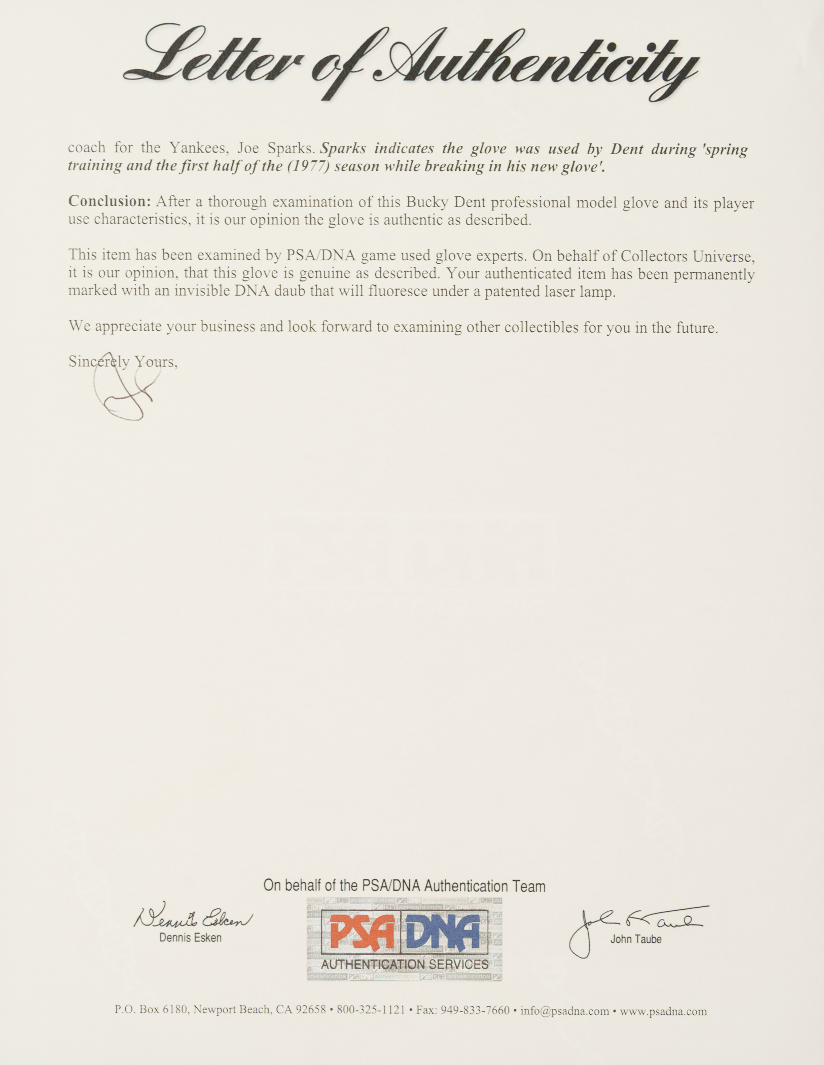 Rawlings right-handed fielder's glove, game-used by Bucky Dent during the 1974 season as a member of the Chicago White Sox. The glove, which displays outstanding game use, is constructed of Rawlings top-grade tanned steer hide bound with tanned rawhide laces and nylon stitches. The heel has been re-laced. Dent later signed the glove in black marker along the pinky sleeve. Dent's number "20" is written on the back of the glove at the base of the web. Accompanied by an LOA from Joe Sparks, who was Dent's minor league coach and served on Dent's 1990 coaching staff when he was the manager of the New York Yankees. Per Sparks, "Bucky used this glove during spring training and the first half of the 1977 season while breaking [in] his new glove." Full LOA from noted glove expert Dennis Esken of PSA/DNA. Full LOA from Steve Grad and Brian Sobrero/Beckett Authentication Services (signature only).