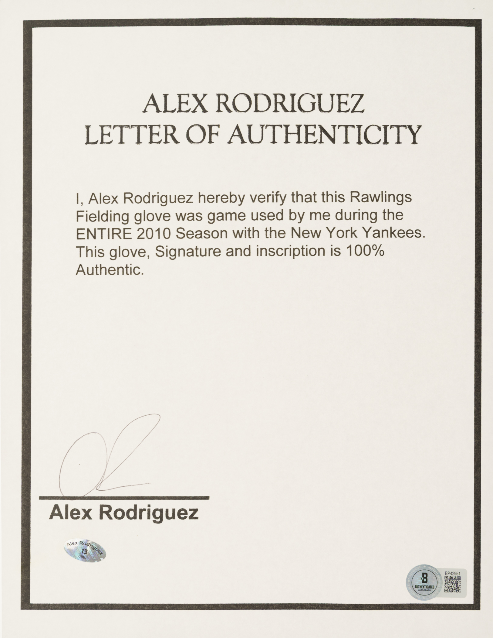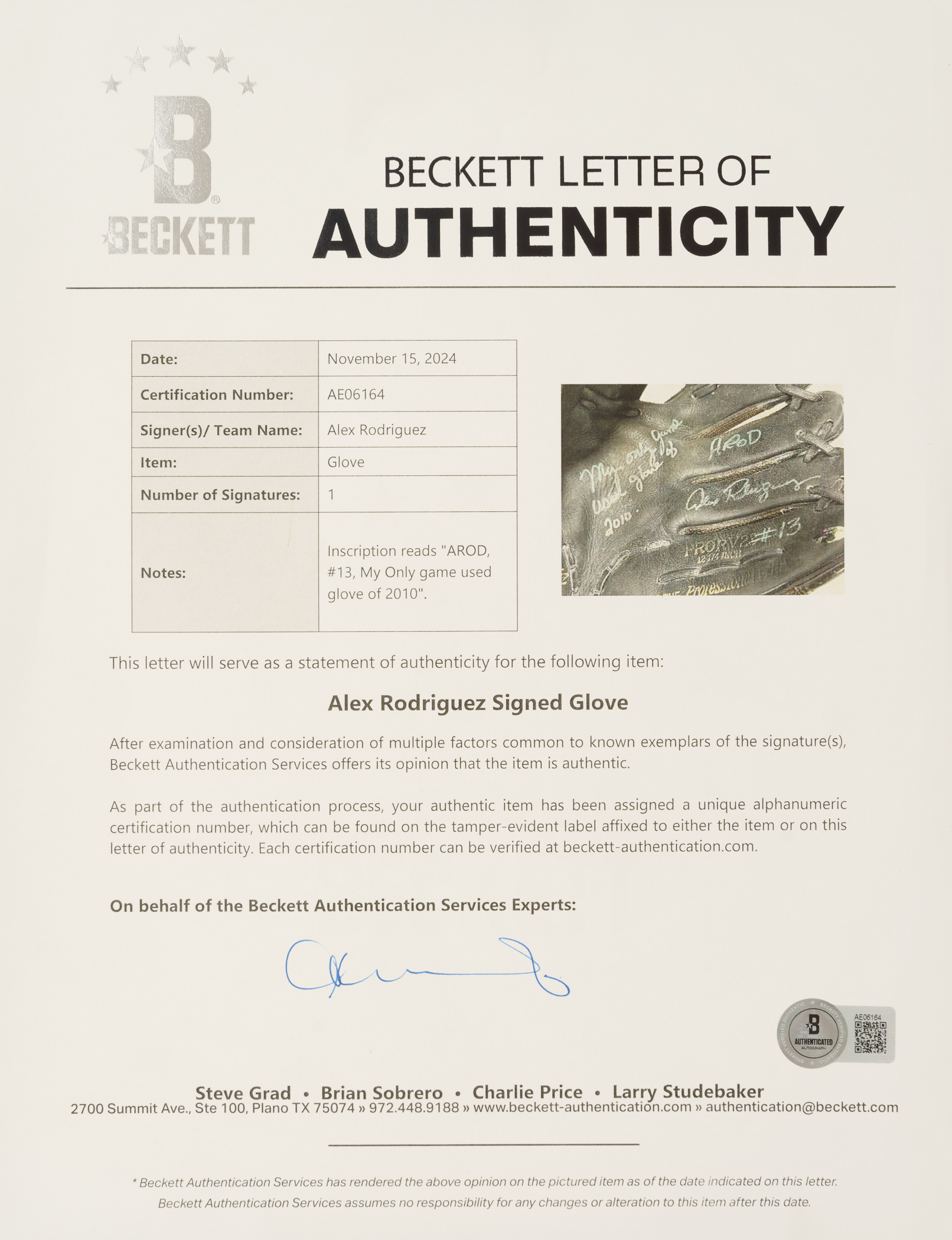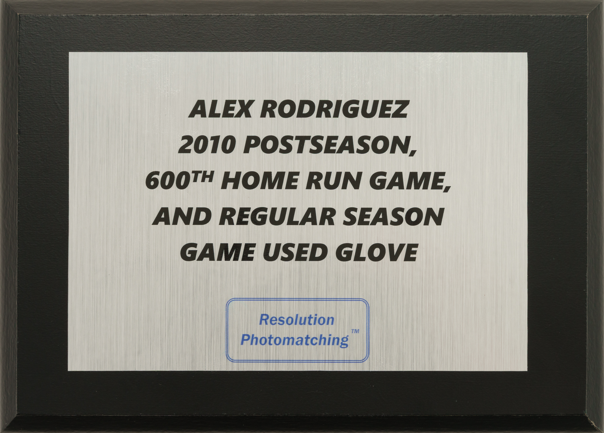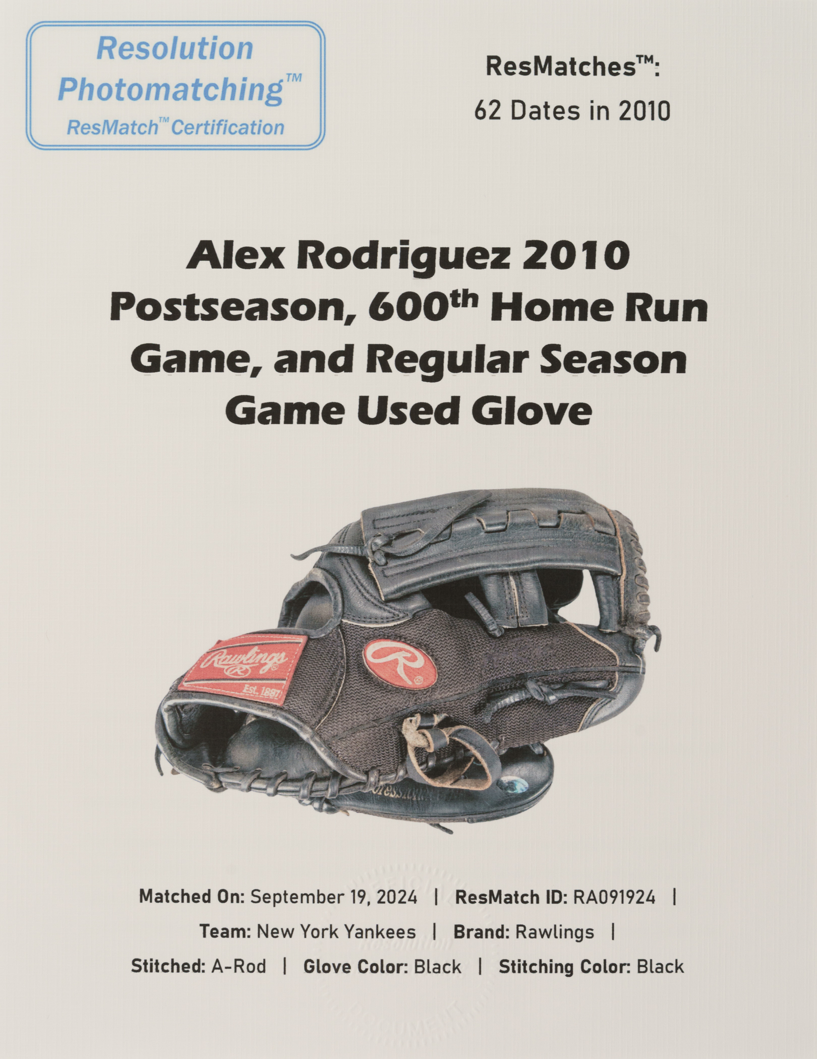 Rawlings right-handed fielder's glove, model "PRO RV23," used by New York Yankees superstar Alex Rodriguez during the 2010 MLB season. Accompanied by an LOA from Resolution Photomatching, which has conclusively matched the glove to one used by Rodriguez during 62 games (53 regular season and nine postseason) during the 2010 season. This glove was most notably worn by Rodriguez on August 4, 2010, when he hit his 600th career home run in a home game against the Toronto Blue Jays. Rodriguez has signed the glove "Alex Rodriguez/ARod, #13/My only game used glove of 2010" in silver paint pen along the palm and fingers. The glove displays heavy wear, with all of the lacing intact and several dirt stains. A 14-time All-Star and three-time American League MVP, Rodriguez currently sits fifth on the all-time home-run list with 696, trailing only Barry Bonds, Hank Aaron, Babe Ruth, and Albert Pujols in that category. He also ranks fourth all-time on the career RBI list (2,086) and is one of only seven players in history to have amassed over 500 home runs and 3,000 hits. Full LOA from Steve Grad and Brian Sobrero/Beckett Authentication Services (signature only).