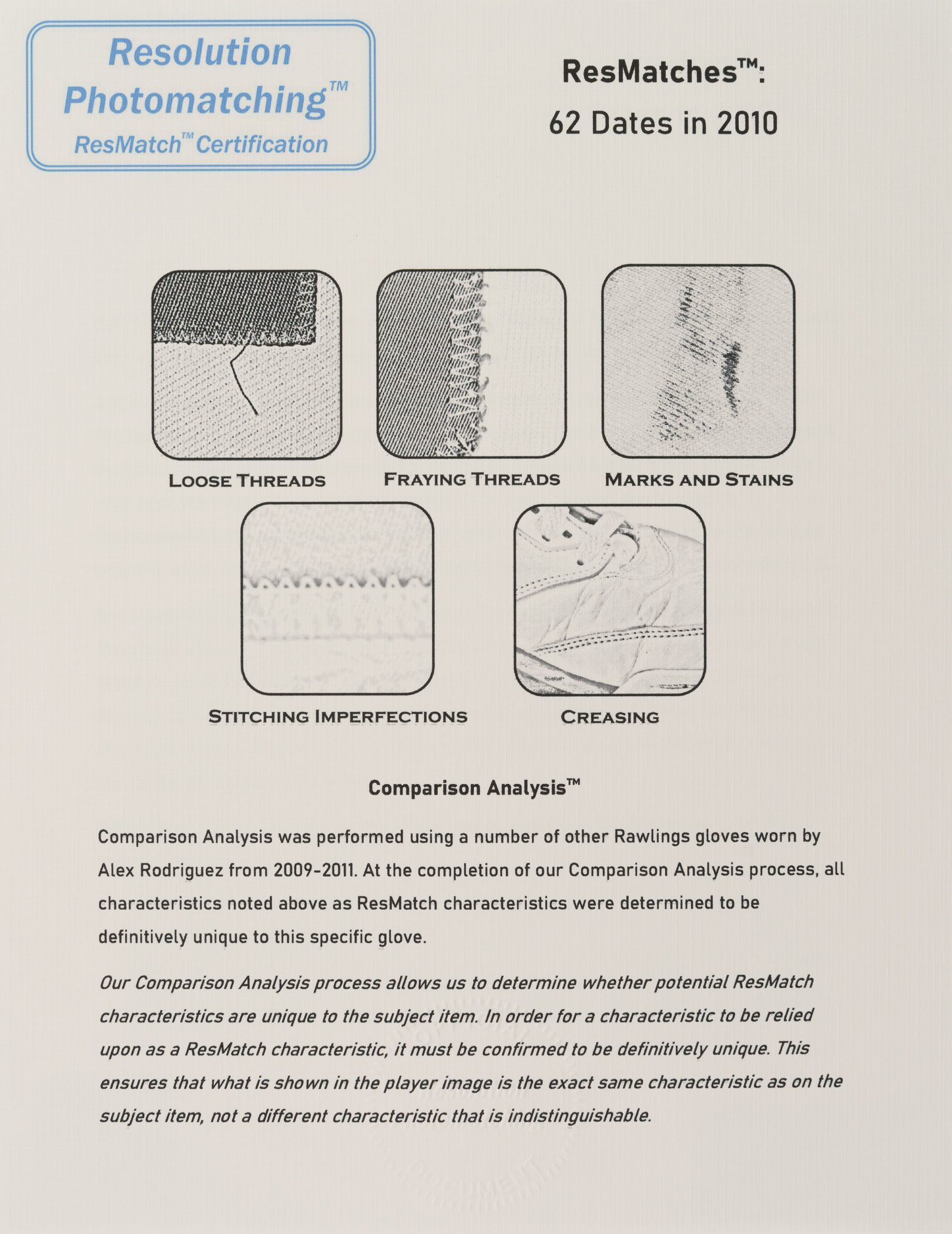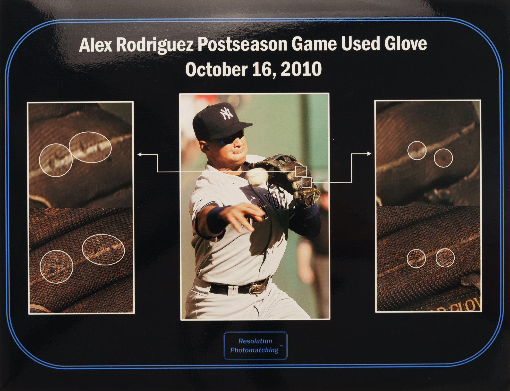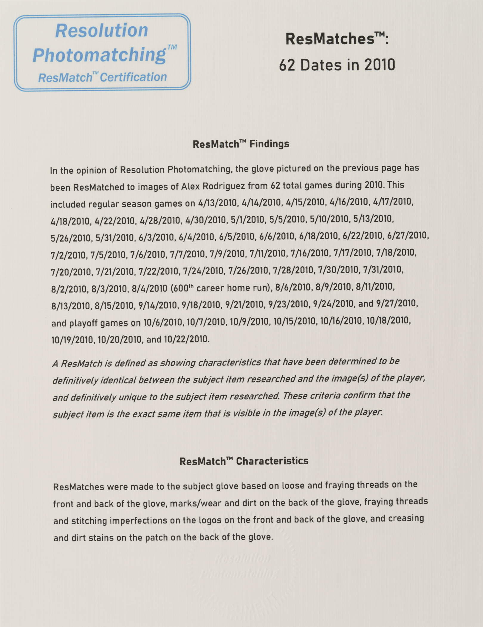 Rawlings right-handed fielder's glove, model "PRO RV23," used by New York Yankees superstar Alex Rodriguez during the 2010 MLB season. Accompanied by an LOA from Resolution Photomatching, which has conclusively matched the glove to one used by Rodriguez during 62 games (53 regular season and nine postseason) during the 2010 season. This glove was most notably worn by Rodriguez on August 4, 2010, when he hit his 600th career home run in a home game against the Toronto Blue Jays. Rodriguez has signed the glove "Alex Rodriguez/ARod, #13/My only game used glove of 2010" in silver paint pen along the palm and fingers. The glove displays heavy wear, with all of the lacing intact and several dirt stains. A 14-time All-Star and three-time American League MVP, Rodriguez currently sits fifth on the all-time home-run list with 696, trailing only Barry Bonds, Hank Aaron, Babe Ruth, and Albert Pujols in that category. He also ranks fourth all-time on the career RBI list (2,086) and is one of only seven players in history to have amassed over 500 home runs and 3,000 hits. Full LOA from Steve Grad and Brian Sobrero/Beckett Authentication Services (signature only).