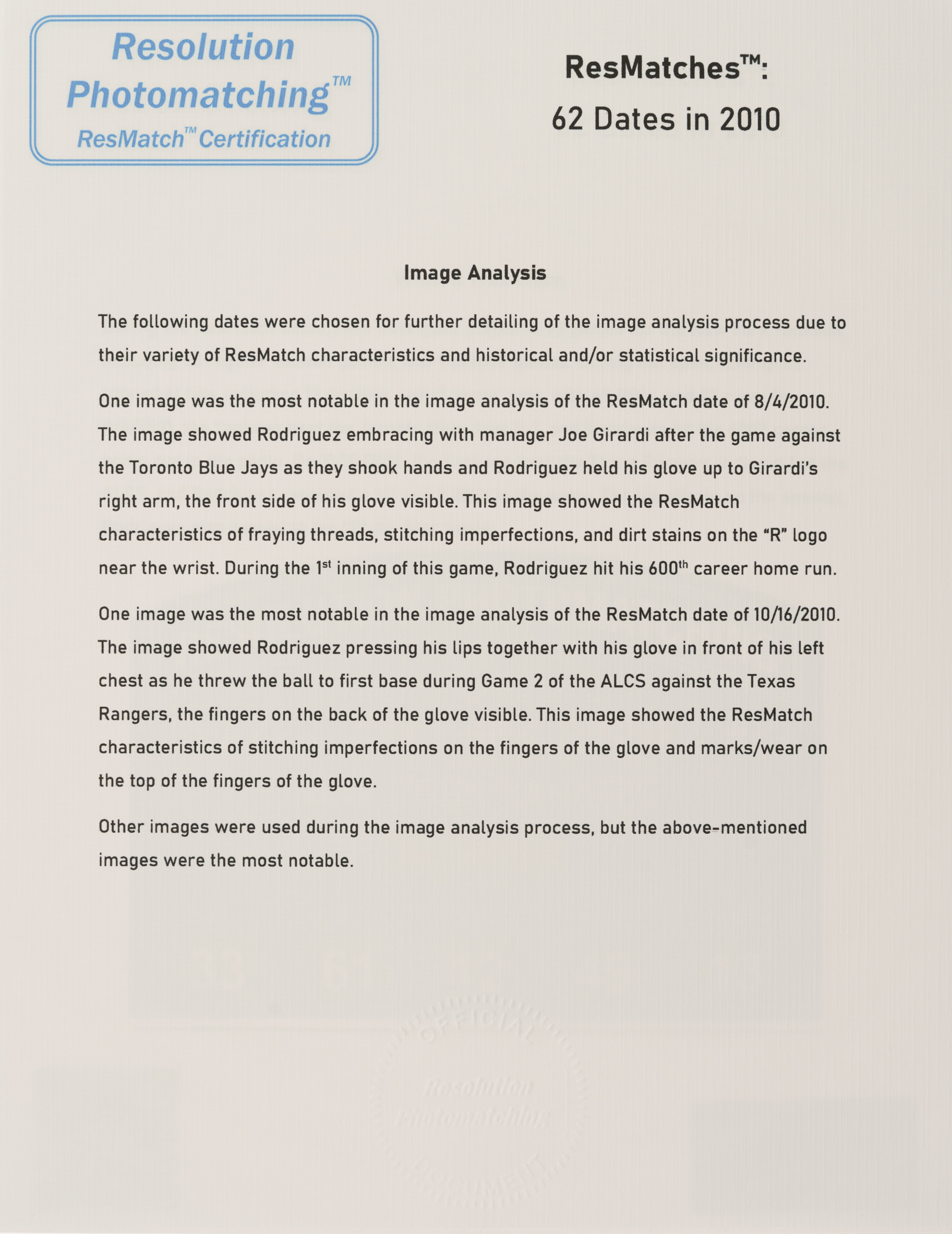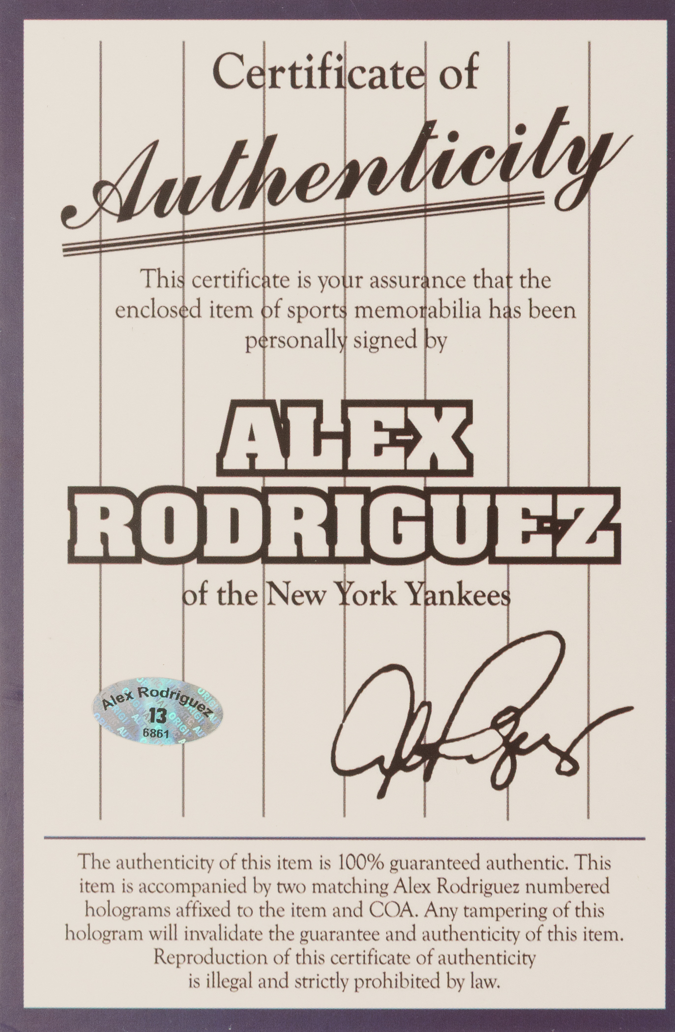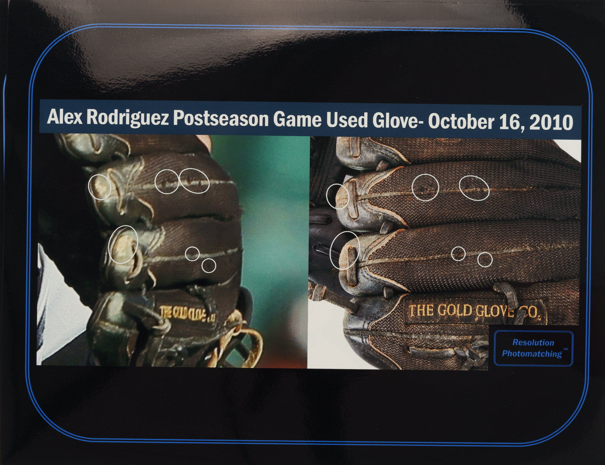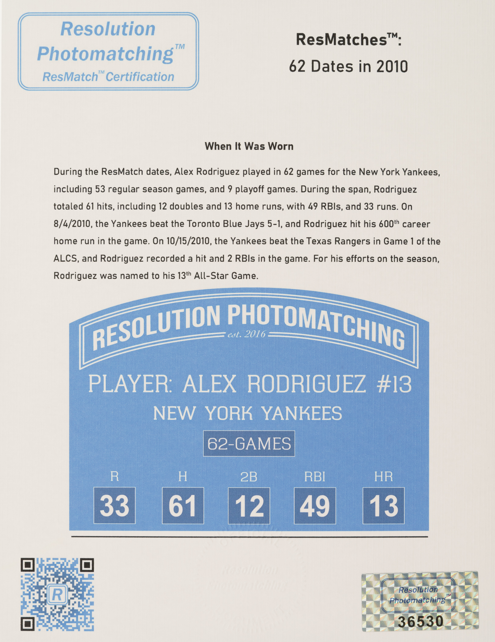 Rawlings right-handed fielder's glove, model "PRO RV23," used by New York Yankees superstar Alex Rodriguez during the 2010 MLB season. Accompanied by an LOA from Resolution Photomatching, which has conclusively matched the glove to one used by Rodriguez during 62 games (53 regular season and nine postseason) during the 2010 season. This glove was most notably worn by Rodriguez on August 4, 2010, when he hit his 600th career home run in a home game against the Toronto Blue Jays. Rodriguez has signed the glove "Alex Rodriguez/ARod, #13/My only game used glove of 2010" in silver paint pen along the palm and fingers. The glove displays heavy wear, with all of the lacing intact and several dirt stains. A 14-time All-Star and three-time American League MVP, Rodriguez currently sits fifth on the all-time home-run list with 696, trailing only Barry Bonds, Hank Aaron, Babe Ruth, and Albert Pujols in that category. He also ranks fourth all-time on the career RBI list (2,086) and is one of only seven players in history to have amassed over 500 home runs and 3,000 hits. Full LOA from Steve Grad and Brian Sobrero/Beckett Authentication Services (signature only).