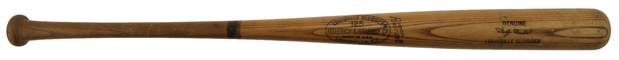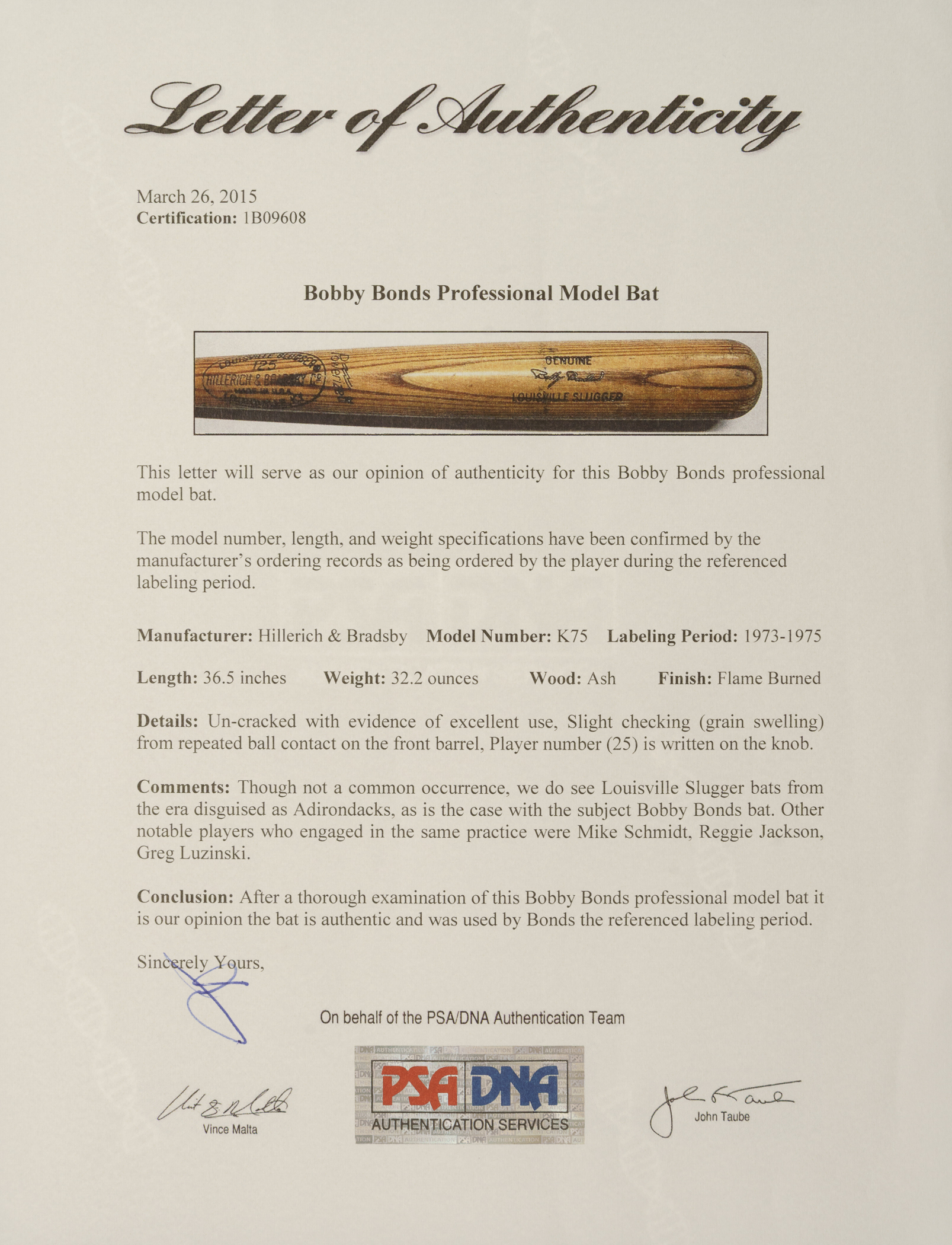 Bobby Bonds H&B signature-model "K75" bat dating from the 1973-1975 manufacturing period. PSA/DNA has described the bat as "authentic and was used by Bonds during the reference labeling period. Bonds' number is scripted in black marker on the knob. Per PSA/DNA, the "bat is uncracked with evidence of excellent use, slight checking (grain swelling) from repeated ball contact on the front barrel." PSA/DNA has also noted the bat is "disguised" as an Adirondack. This is due to the painted black ring on the upper handle. The black ring is a defining characteristic of Adirondack bats. A three-time All-Star and gold glove winner, Bonds retired in 1981 with 332 home runs and a .268 lifetime batting average. Length: 36.5 inches. Weight: 32.2 ounces. Full LOA from John Taube of PSA/DNA. The size/weight of this item requires that there will be an additional shipping charge for this lot.