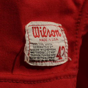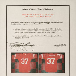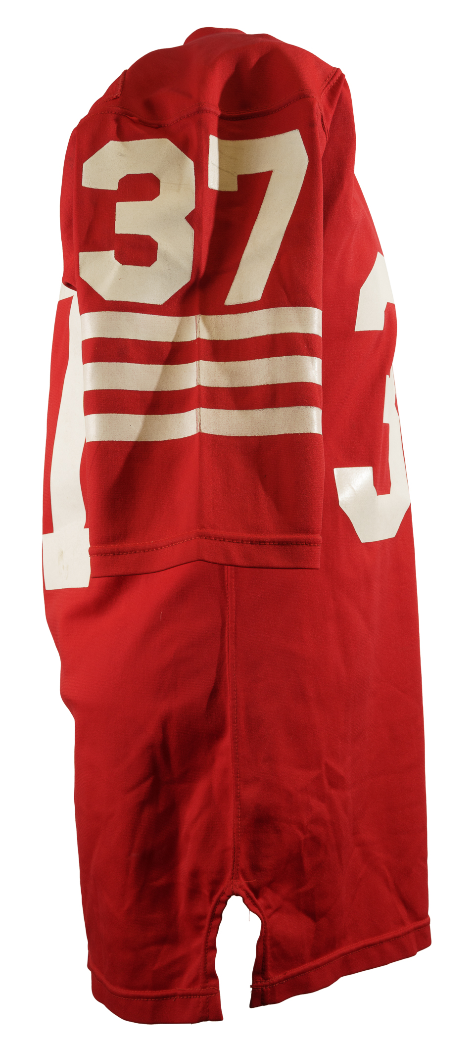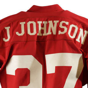 San Francisco 49ers home jersey worn by Hall of Fame cornerback Jimmy Johnson during the 1975 season. The red mesh jersey has the number “37" on the front, reverse, and sleeves. “Johnson” is lettered upon a red-mesh nameplate on the reverse. All letters are appliquéd in white tackle twill. The numbers have been applied by means of a heat-transfer process. A Wilson label, bearing the size designation "42," appears on the left front tail. The jersey is original as issued, with no alterations, and displays moderate wear, including numerous stains on the numbers. There are a few tiny holes along the lower portion of the front noted for accuracy. A first-round pick out of UCLA, Johnson spent his entire career (1961-1976) with the 49ers, where he became one of the NFL's first shutdown corners. Despite teams rarely throwing his way, Johnson finished his career with 47 interceptions. A four-time All-Pro, five-time Pro-Bowler, and a member of the NFL's 1970s All-Decade Team, he was elected to the Hall of Fame in 1994. Accompanied by a signed letter of provenance from Johnson.