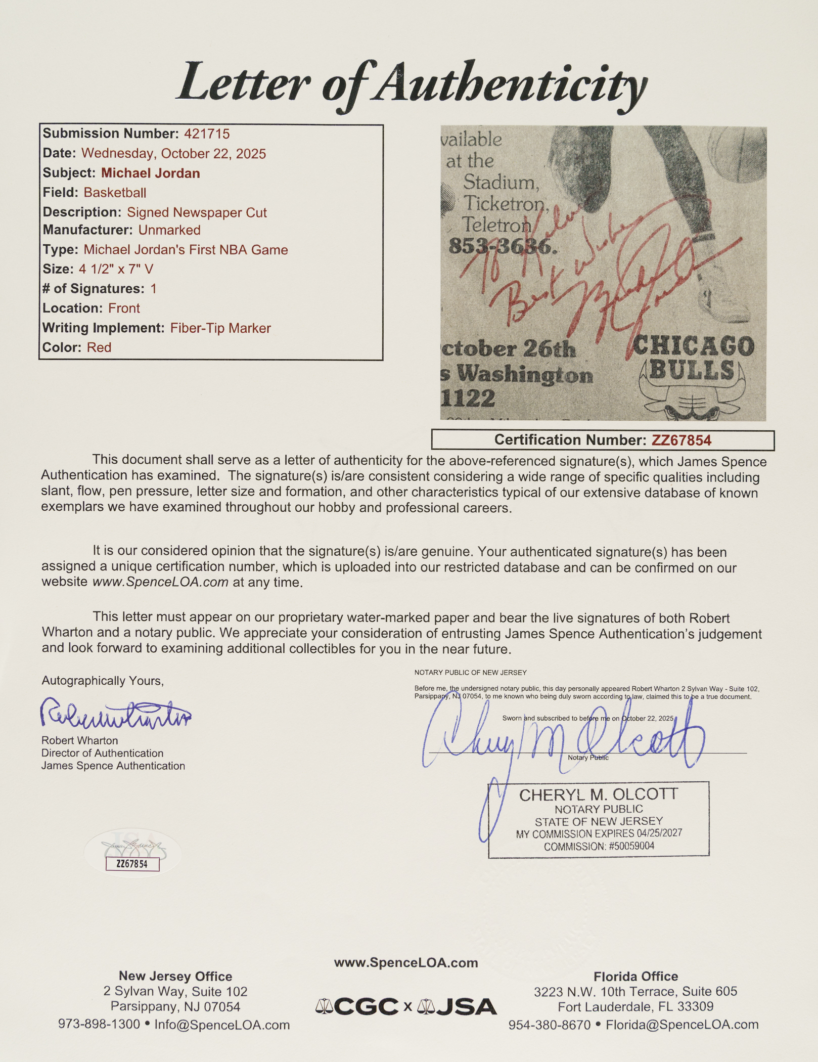 Newspaper cut signed in red ink by Michael Jordan. A personalized inscription accompanies the signature. The cut (4-3/8 x 7 inches) has a tear along the bottom edge and is in Very Good condition overall. Full LOA from James Spence/JSA.