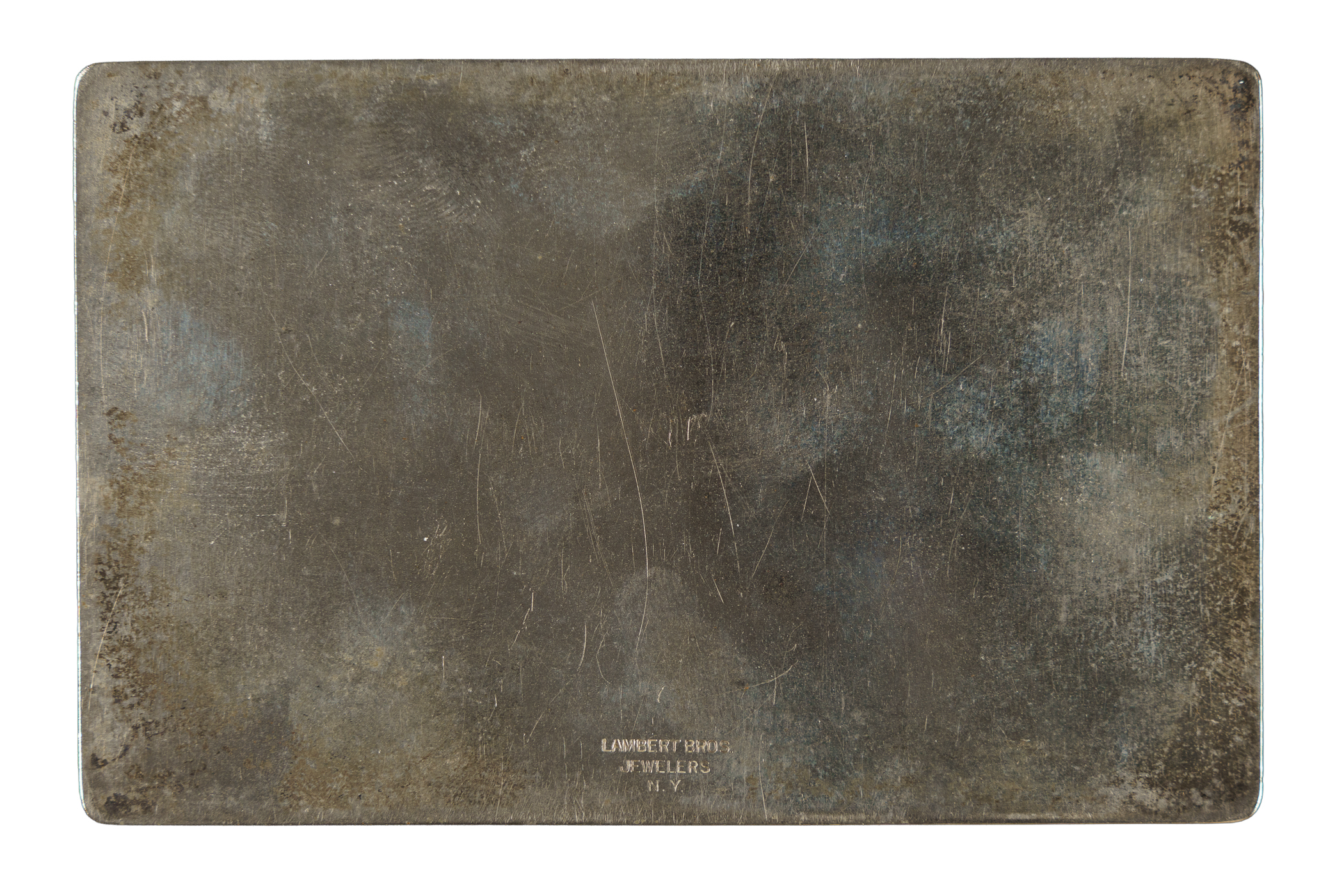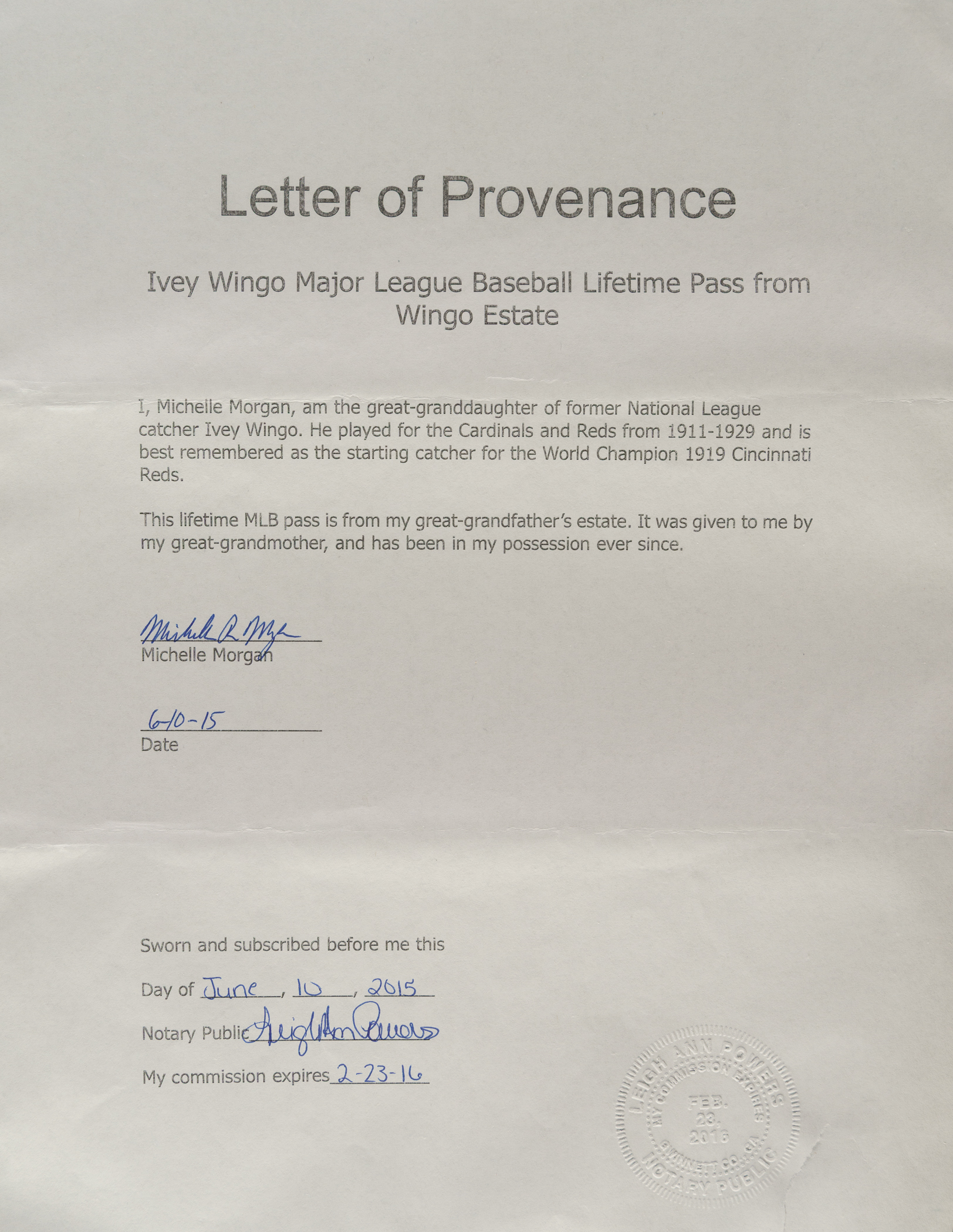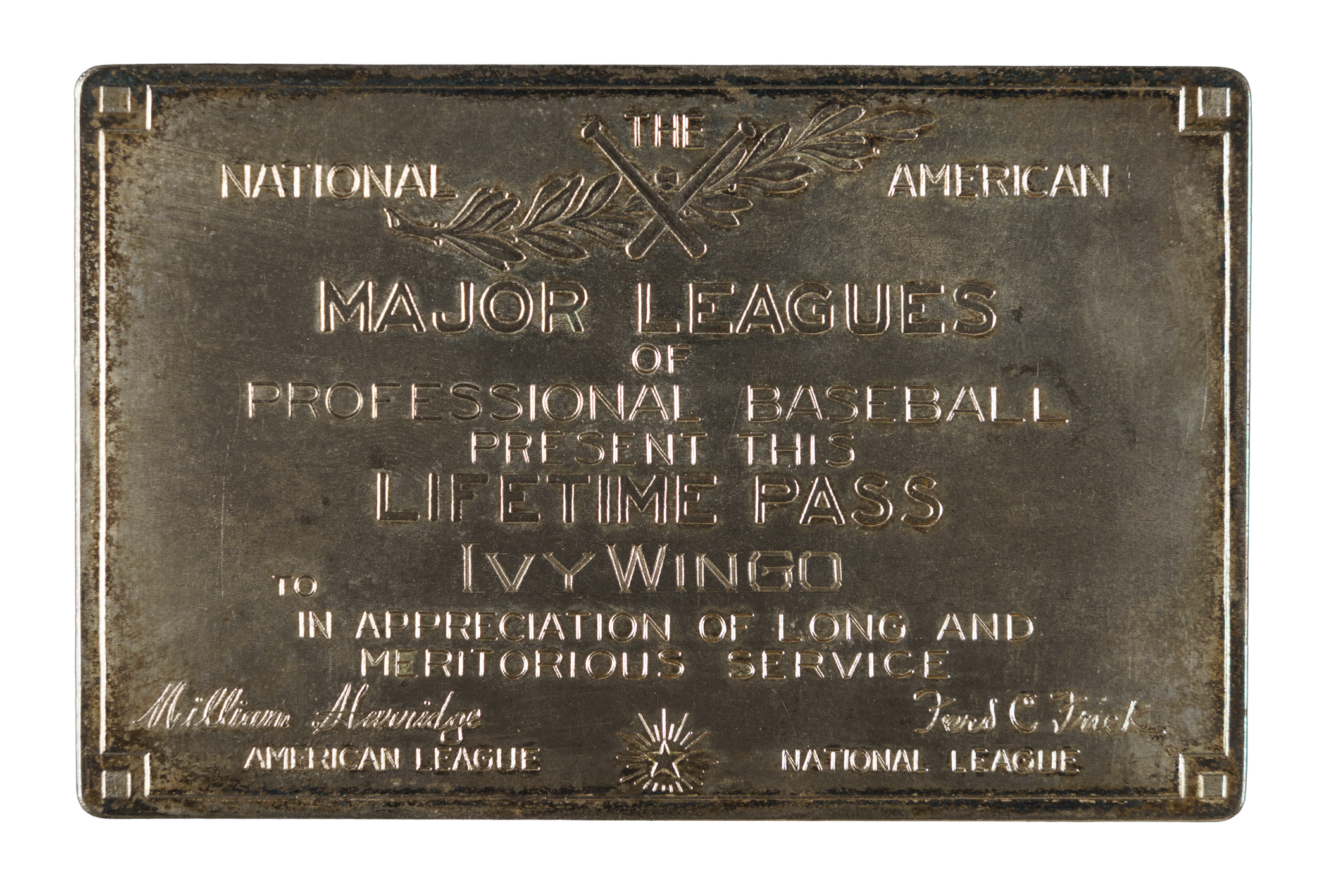 Lifetime silver pass issued by Major League Baseball to former St. Louis Cardinals and Cincinnati Reds catcher Ivey Wingo. The pass reads "The National American Major Leagues of Professional Baseball Present This Lifetime Pass to Ivy (sic) Wingo In Appreciation of Long And Meritorious Service." The facsimile signatures of both American League President William Harridge and National League President Ford Frick appear along the base. All of the text is in relief, with the exception of Wingo’s name, which has been engraved. Produced by "Lambert Bros. Jewelers. N. Y." as noted on the reverse. The pass is accompanied by its original presentation box, which has "Lambert Brothers/Jewelers/New York" printed on the lid. Also included with the box is the original presentation card bearing the names of both Frick and Harridge, as well as a second card with just Frick's name printed. Together with a letter of provenance from the Wingo family. Lifetime silver passes are scarce. While we do not know the precise year that the practice of issuing lifetime silver passes ended, it appears to have been in the 1950s (Clem Labine's lifetime pass, issued in 1959 and which REA sold in its April 2015 auction, was not silver). Wingo retired in 1929, and Frick ended his tenure as National League president in 1951, so this pass was issued sometime during that time span. The pass (4.25 x 2.75 inches) has light tarnishing.