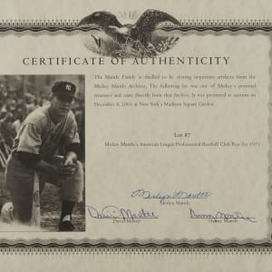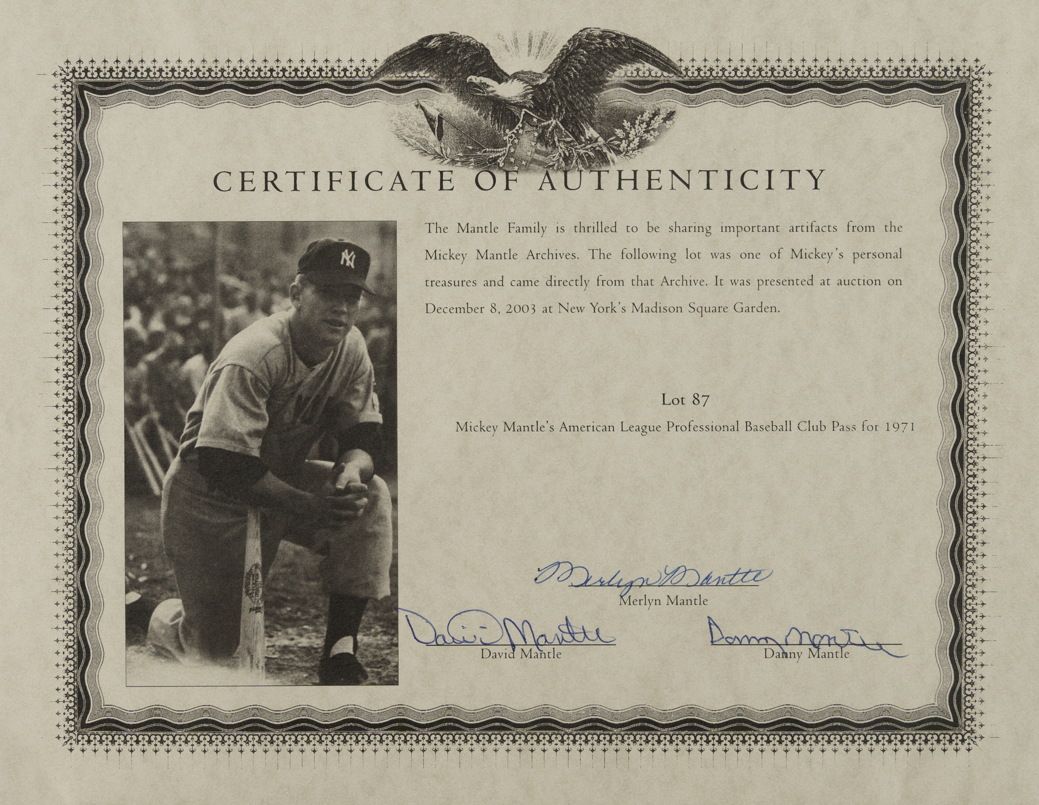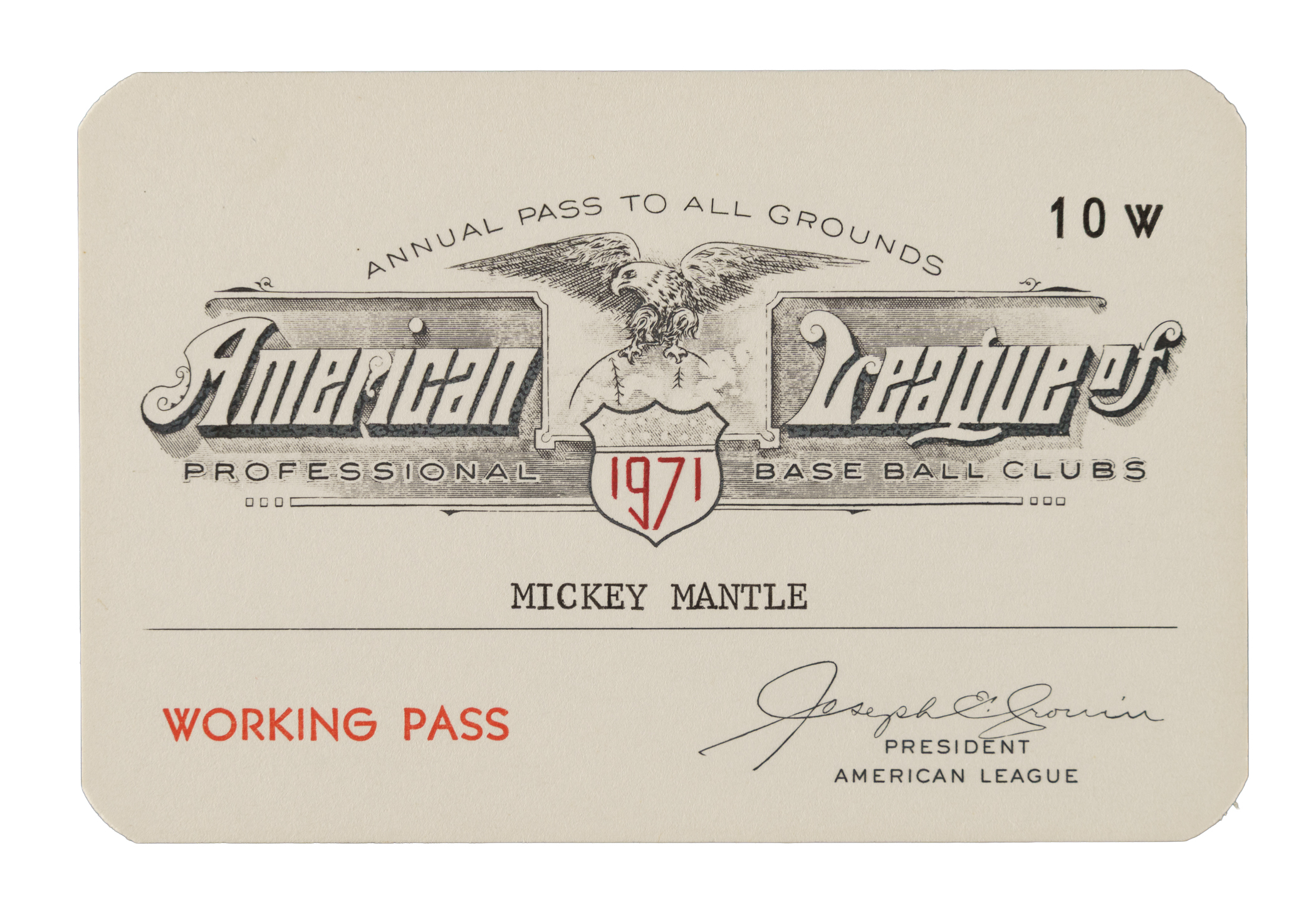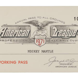 American League season pass issued to Mickey Mantle in 1971. The paper pass, which is labeled a "Working Pass," granted Mantle access to "All Grounds" for the 1971 season. Mantle's name is typed on the front and the facsimile signature of American League president Joe Cronin appears in the lower right corner. 4.25 x 2.75 inches. Near Mint condition. This pass was originally purchased at the special Mickey Mantle auction conducted by Guernsey's on December 8, 2003, at Madison Square Garden in New York City. The pass is accompanied by a COA signed by Mantle's wife and two sons.