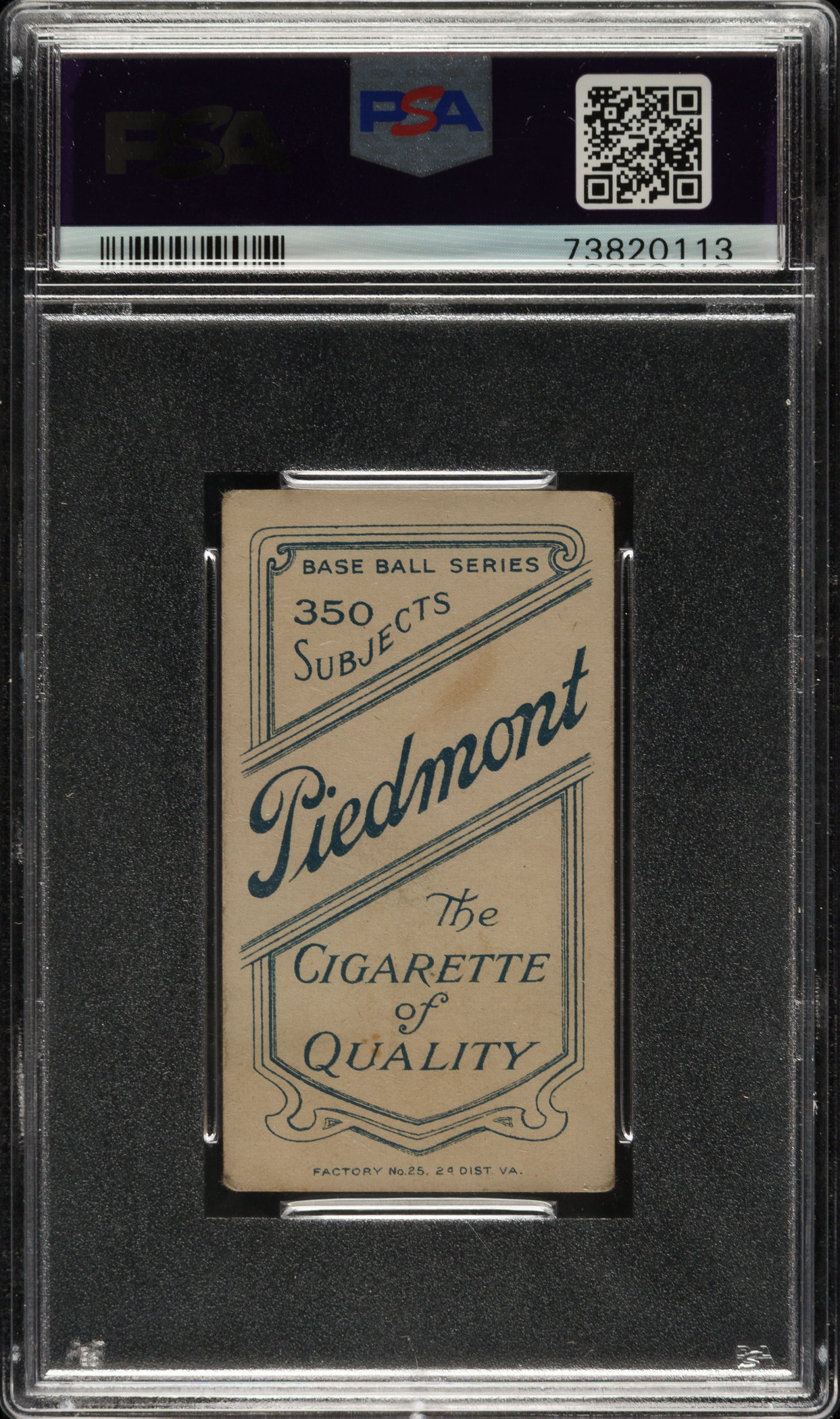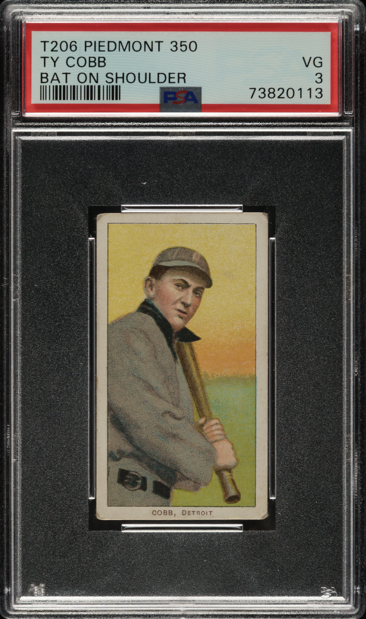 Graded VG 3 by PSA. Strong mid-grade example of this classic tobacco card of Detroit Tigers Hall of Famer Ty Cobb from the T206 White Borders series. The T206 Ty Cobb bat-on-shoulder pose is one of the key cards in the set. This well-centered card has bright colors, excellent registration, and honest corner wear. A small spot of staining is visible on the Piedmont 350/25 advertising reverse.
