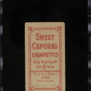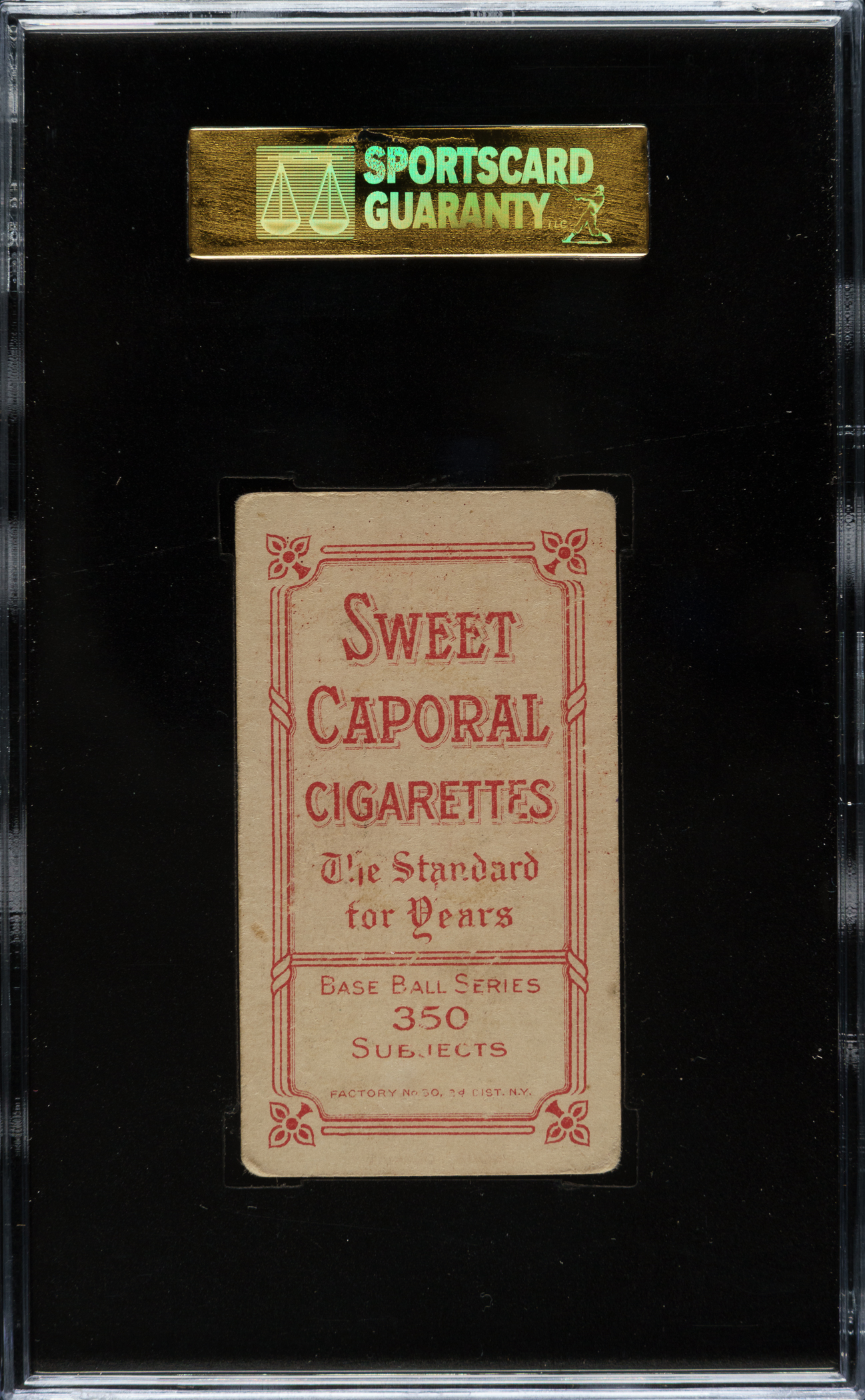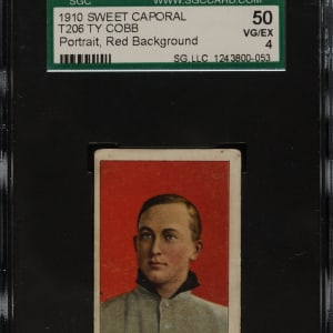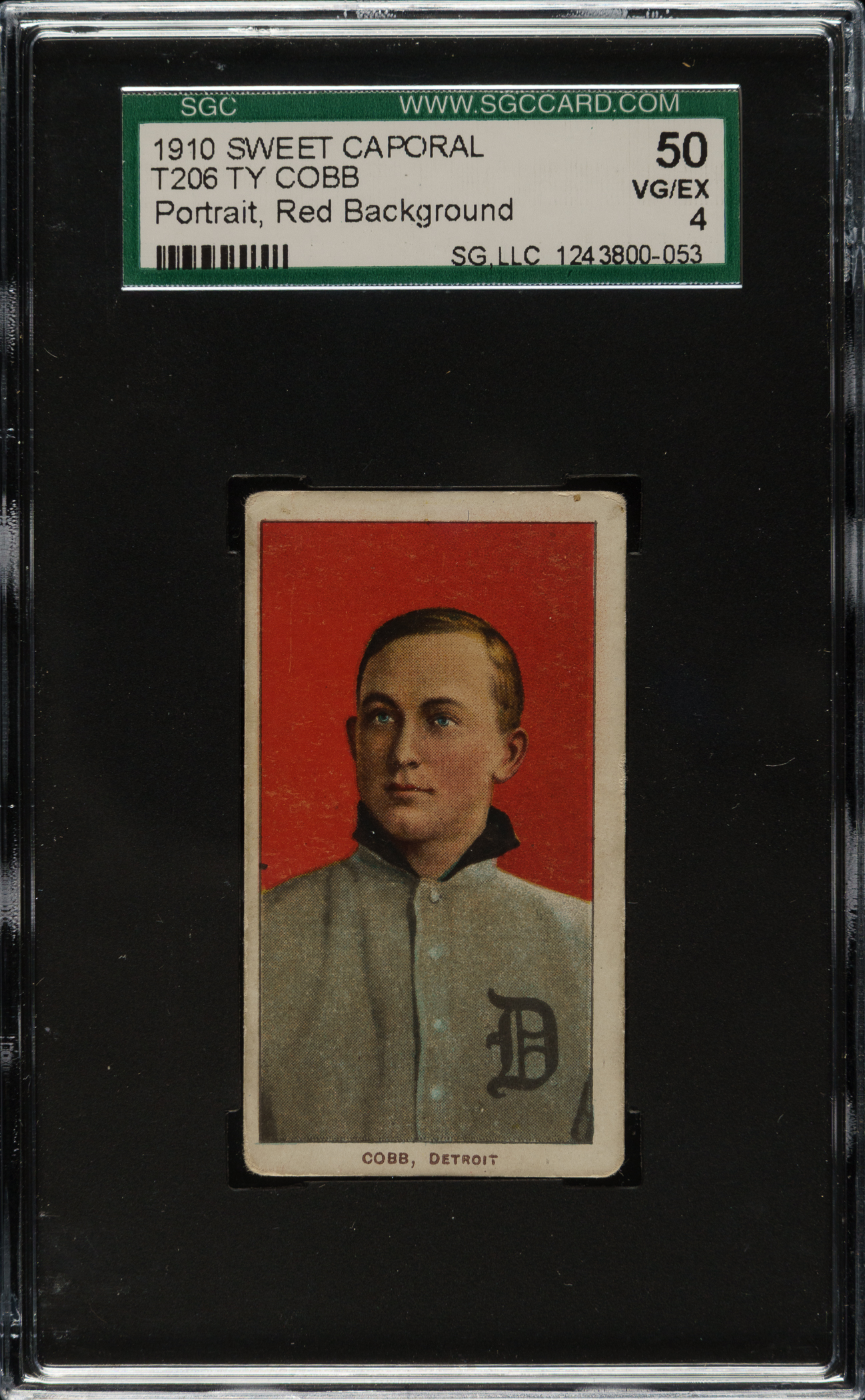 Graded VG/EX 50 by SGC. Mid-grade example of one of Detroit Tigers Hall of Famer Ty Cobb's iconic cards. The red-background pose has long been considered one of the classics of the T206 set and of all vintage cards. This card features a brilliant red background, outstanding registration, and moderate corner wear. Boldly printed Sweet Caporal 350/30 advertising reverse. The red-background Cobb portrait is one of the key cards of the set, and this example would be a highlight in any high-quality T206, Hall of Famer, or Ty Cobb card collection.
