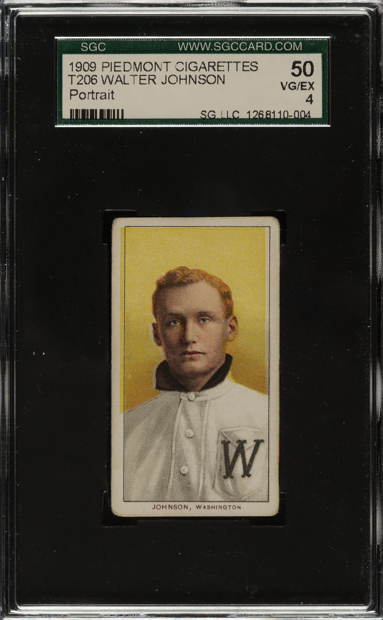 Graded VG/EX 4 by SGC. Attractive mid-grade example of Washington Senators Hall of Famer Walter Johnson (portrait) from the classic T206 White Border set. This well-centered card has a bright yellow background, outstanding registration, and even corner wear. The Piedmont 150 advertising reverse is boldly printed.