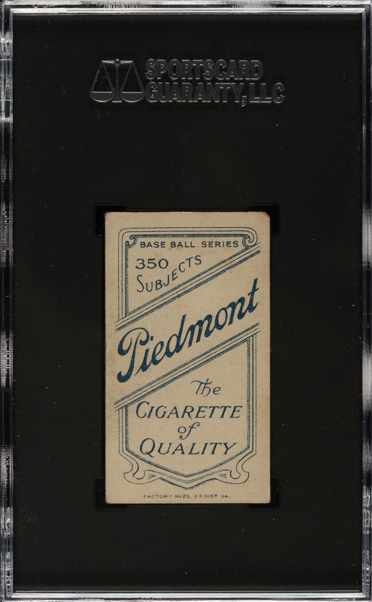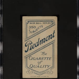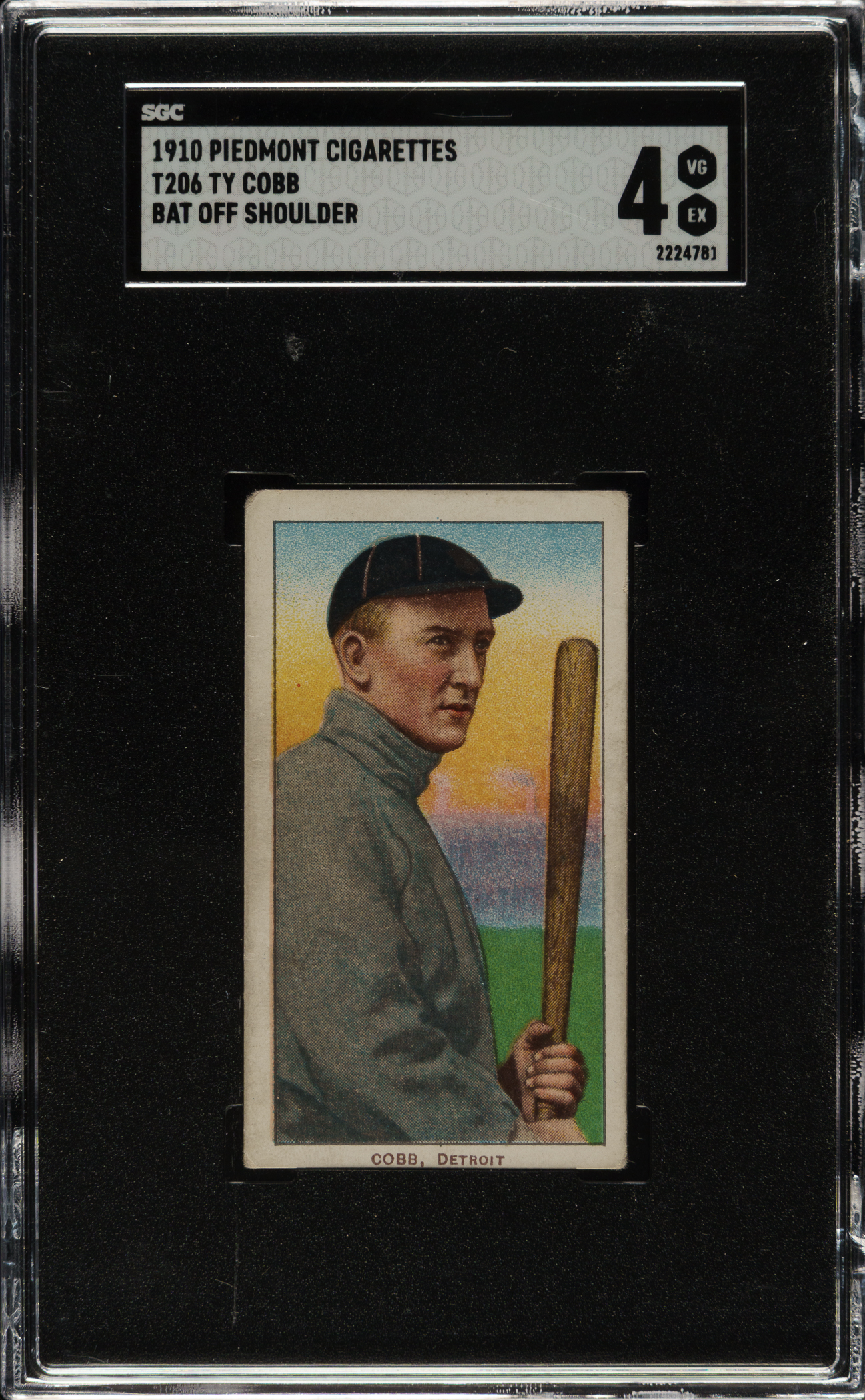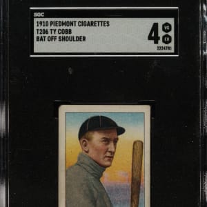 Graded VG/EX 4 by SGC. Beautiful mid-grade example of this classic tobacco card of Detroit Tigers Hall of Famer Ty Cobb. The T206 Ty Cobb bat-off-shoulder pose is one of the key cards in the set. The offered card has vibrant colors, outstanding registration, and honest corner wear. The Piedmont 350 advertising reverse is boldly printed.