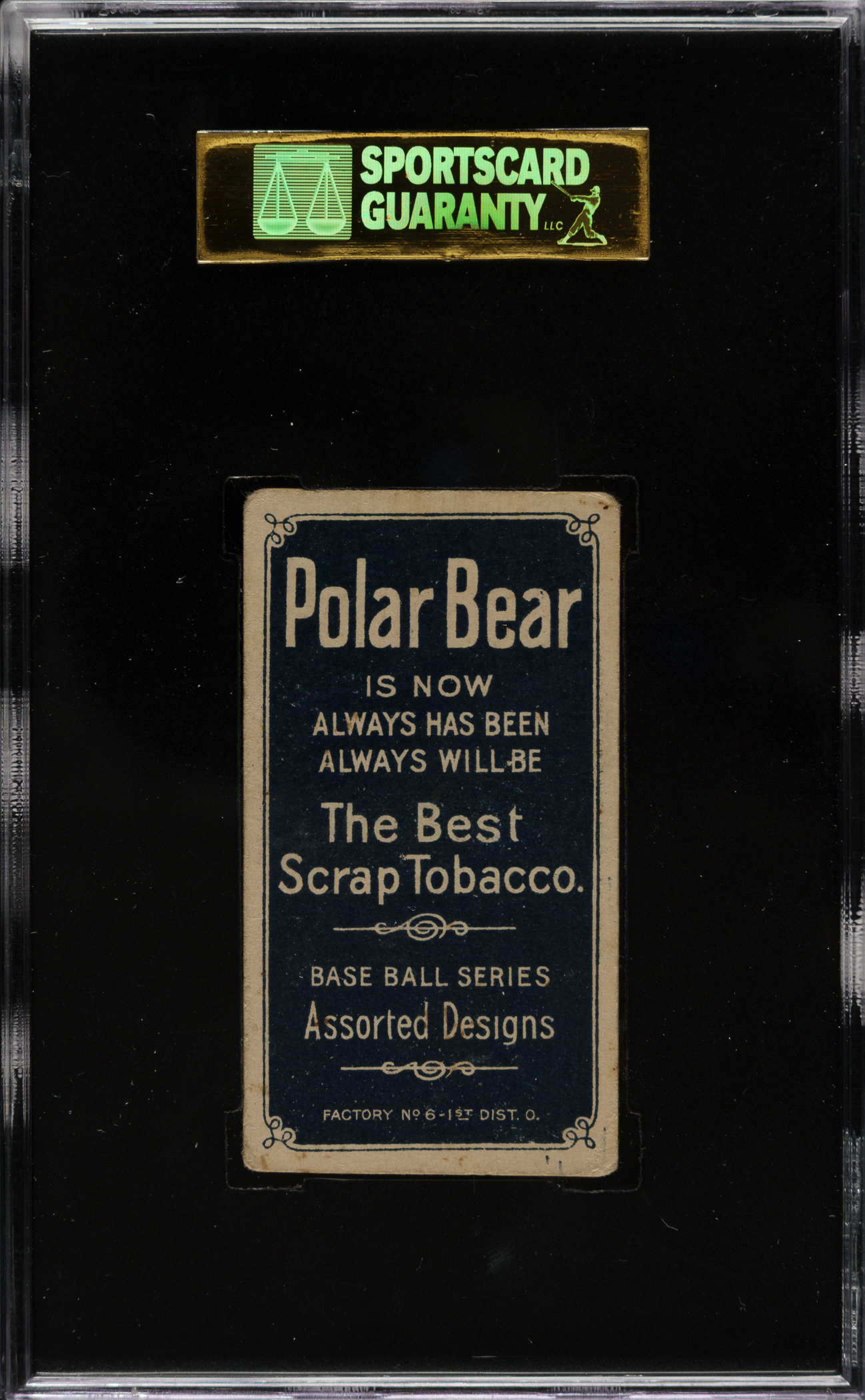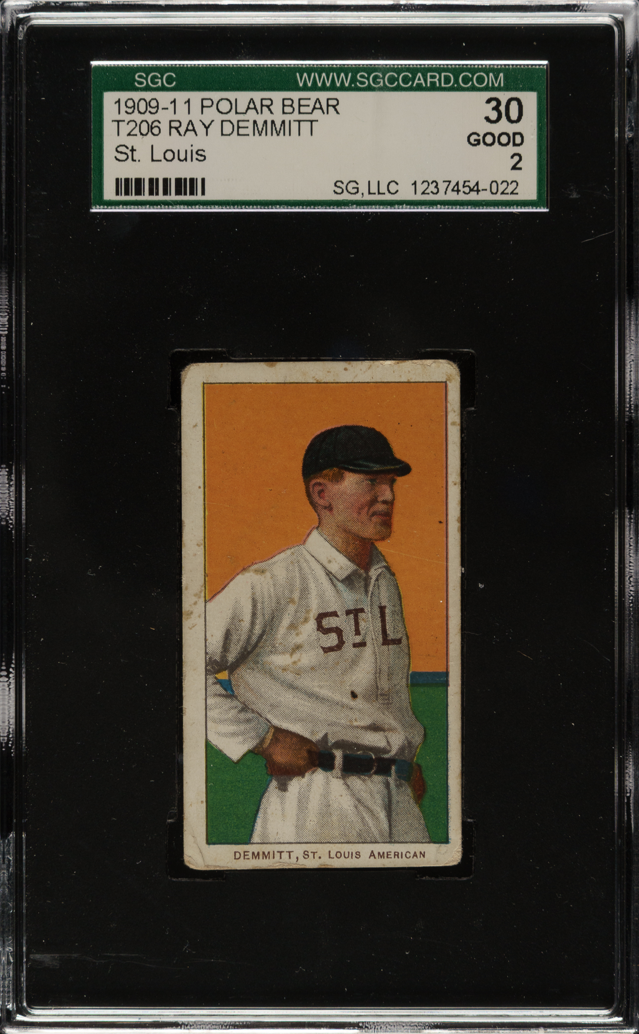 Graded GOOD 30 by SGC. Appealing example of the rare T206 Ray Demmitt card, St. Louis Browns, variation. Polar Bear was the only company to issue this variation, no doubt contributing to its significant rarity. T206 cards issued with Polar Bear tobacco were not well protected from the accompanying product, so most Demmitts have significant condition problems, including at least some tobacco staining. This example has bold colors, outstanding registration, moderate corner wear, and light tobacco staining on the front. The Polar Bear reverse is boldly printed.