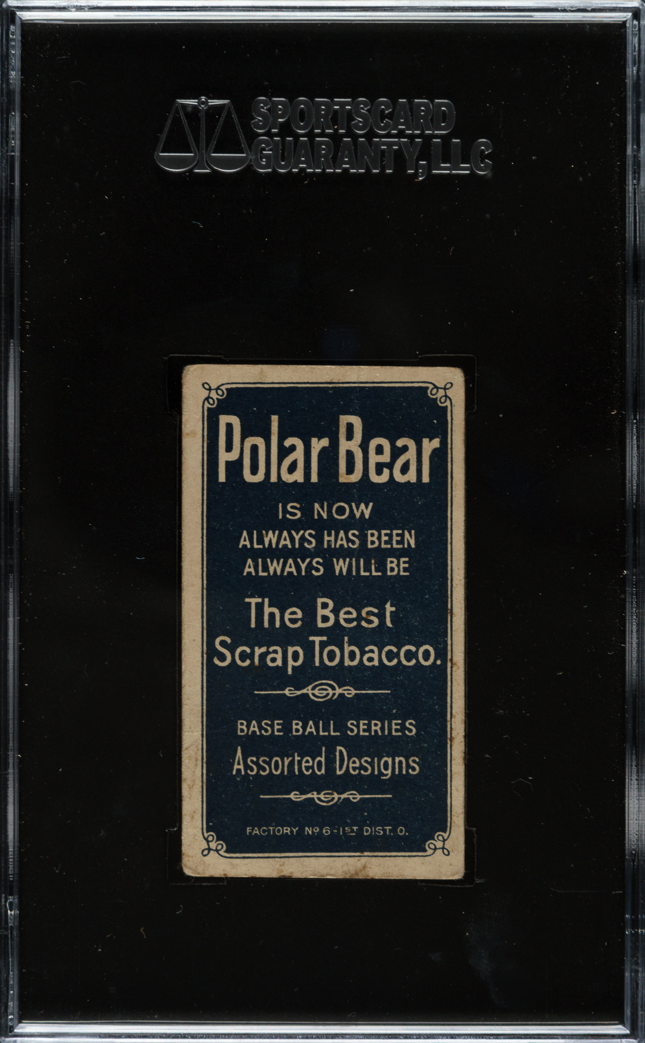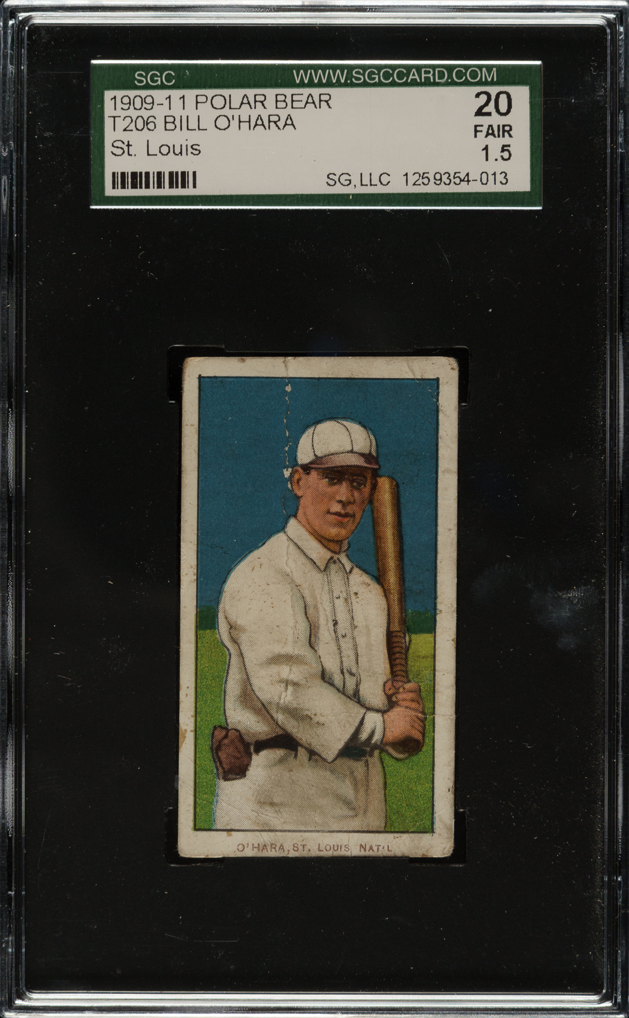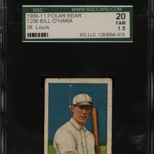 Graded FAIR 20 by SGC. Modestly graded example of the rare Bill O'Hara card, St. Louis Browns T206 variation. Polar Bear was the only company to issue this variation, thus contributing to its significant rarity. T206 cards issued with Polar Bear tobacco were not well protected from the accompanying product, so almost all O'Haras have significant condition problems, including at least some tobacco staining (including this example). This well-centered card exhibits brilliant colors, outstanding registration, and moderate corner wear. The Polar Bear reverse is boldly printed. Scattered creasing contributes to the assigned grade. This is a pleasing low-grade example of one of the rarest and most condition-sensitive cards in the classic T206 White Border set.