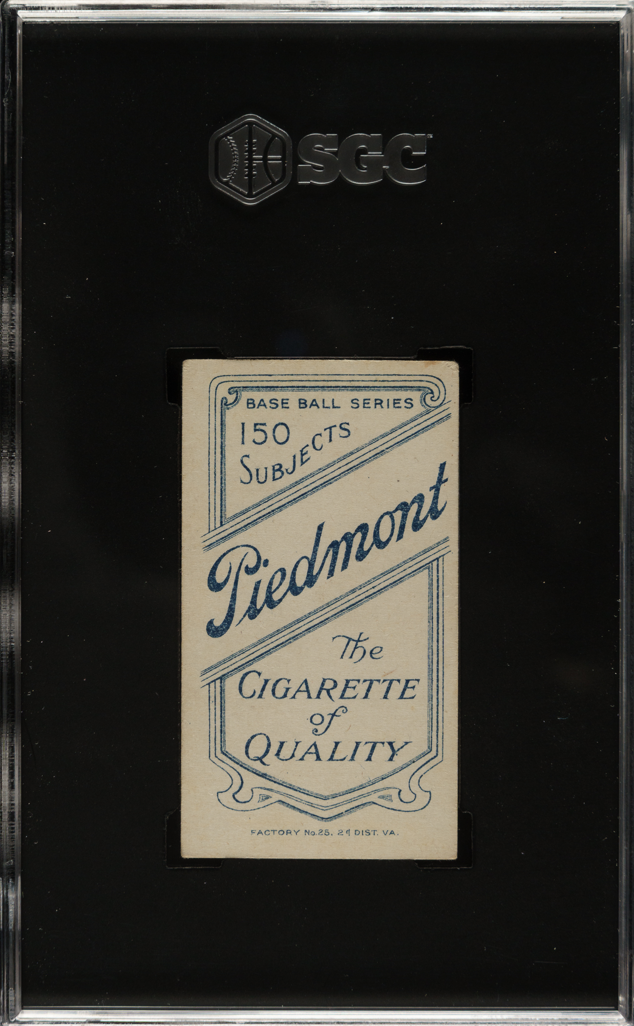 Graded VG+ 3.5 by SGC. Beautiful example of this classic tobacco card of Hall of Famer Ty Cobb. The green-background pose is considered the rarest of the four poses of Cobb in the T206 set. The offered example features a brilliant green background, outstanding registration, and light corner wear. Boldly printed Piedmont 150 advertising reverse. Downgraded slightly due to a few unobtrusive wrinkles on the front.. A strong mid-grade example of one of Cobb's most popular cards.