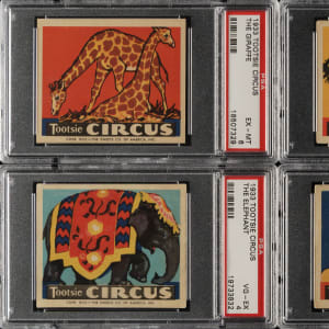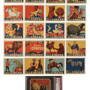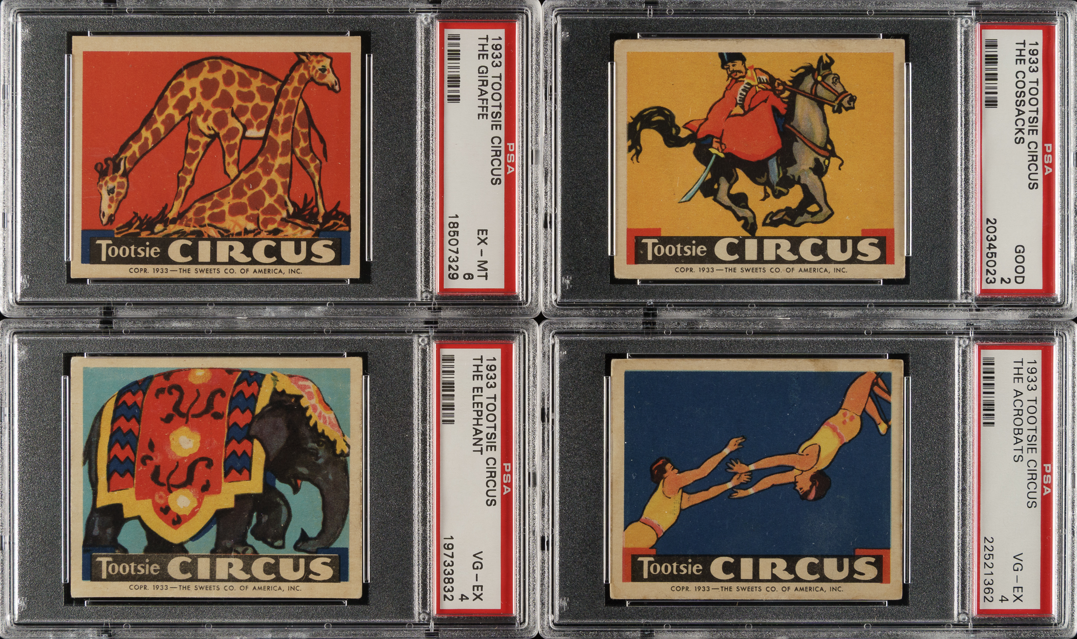 Presented is an extremely scarce complete set of "Tootsie Circus" cards. Produced by the New York-based Sweets Company of America in 1933, this 25-card set features colorful illustrations of popular circus attractions on the card front with descriptions and a single line of advertising on the reverse. Condition is Ex-Mt, Ex, six Vg-Ex, ten Vg, four Gd, and three lesser (including one with erasure marks on the front, otherwise Vg+). Five cards have been professionally graded and encapsulated by PSA: Freaks (POOR 1), The Acrobats (VG-EX 4), The Cossacks (GOOD 2), The Elephant (VG-EX 4), and The Giraffe (EX-MT 6). This is a very rarely offered complete set of this scarce 1930s nonsport issue and one that would be a welcome addition to even the most advanced collection. Total: 25 cards.