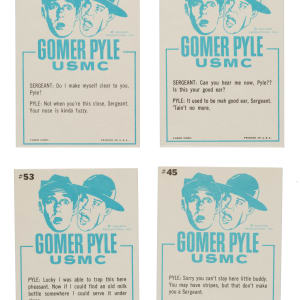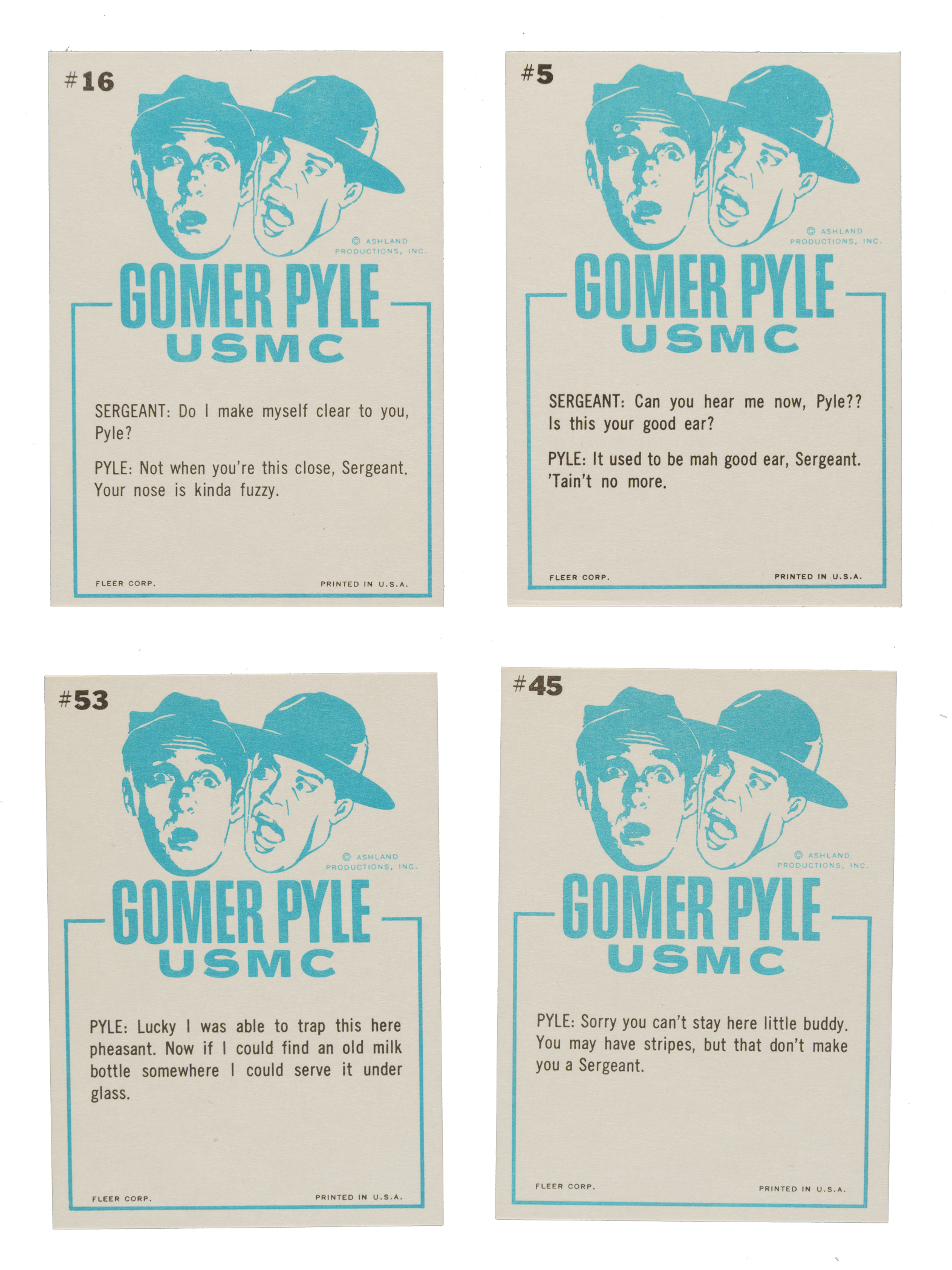 Complete 66-card set of 1965 Fleer "Gomer Pyle" trading cards. Condition is 56% Nr/Mt to Nr/Mt-Mt and 44% Ex to Ex-Mt (due to centering). Total: 66 cards. The size/weight of this item requires that there will be an additional shipping charge for this lot.