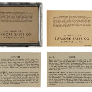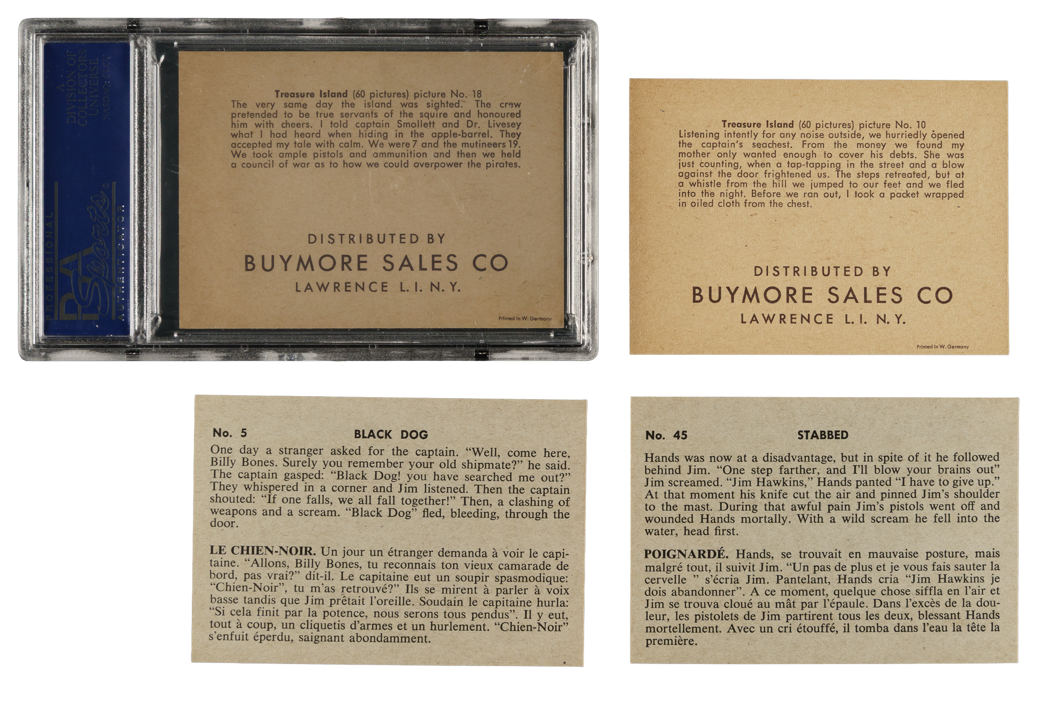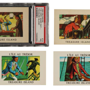 Presented is a near-complete set of 1960 Buymore Sales "Treasure Island" trading cards consisting of fifty-nine different cards, missing only #3 for completion. Eleven cards are Canadian versions produced by Grant Products Limited (#1, 2, 4, 5, 6, 13, 20, 23, 45, 56, and 60). Includes both the U.S. and Canadian version of #45. Condition is 70% Nr/Mt to Nr/Mt-Mt, 15% Ex to Ex-Mt, and 15% Vg to Vg-Ex. One card has been professionally graded and encapsulated by PSA. PSA-graded card: #18 (NM 7). Total: 60 cards (near set of 59 plus one variation). The size/weight of this item requires that there will be an additional shipping charge for this lot.