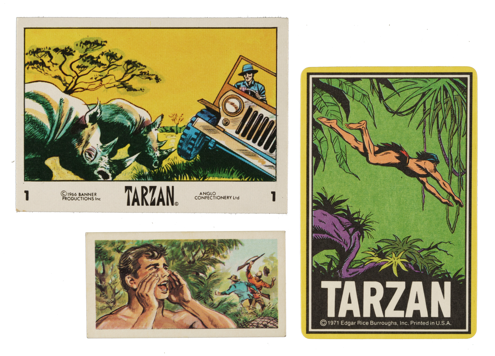 Presented is a complete set collection of "Tarzan" trading cards produced by three different companies in the 1960s. This lot consists of the following: 1) 1966 Philadelphia Gum "Tarzan" (66): Condition is 77% Nr/Mt to Nr/Mt-Mt (including a few bordering on Mint) and 23% Ex to Ex-Mt. 2) 1967 Anglo Confectionery "Tarzan" (66): Condition is 33% Ex-Mt (including a few Nr/Mt) and 67% Ex (including a couple Vg-Ex). 3) 1967 Barratt & Co. "Tarzan" (50): Condition is 80% Nr/Mt to Nr/Mt-Mt (including a few bordering on Mint) and 20% Ex to Ex-Mt (including a couple Vg-Ex). Also includes a high-grade complete 45-card deck of the 1971 Mattel "Tarzan" game produced by Edgar Rice Burroughs, including instructions and unperforated trailmarkers. Total: 182 cards plus game set.