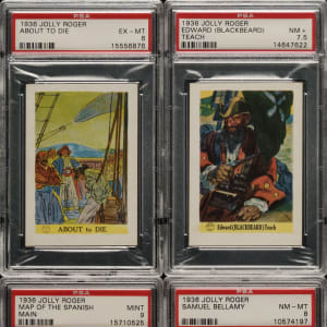 Presented is a complete 48-card set of 1936 F375 Pac-Kups "Jolly Roger Pirate Cards". Seven cards have been professionally graded and encapsulated by PSA. Condition is 65% Nr/Mt to Nr/Mt-Mt (including a few Mint), 20% Ex to Ex-Mt, and 15% Vg to Vg-Ex (including one lesser). Seven PSA-graded cards: About to Die (EX-MT 6), Edward 'Blackbeard' Teach (NM+ 7.5), The Happy Delivery (NM-MT 8), Map of the Spanish Main (MINT 9), Pirate Gold (NM 7), Samuel Bellamy (NM-MT 8), and Sir Henry Morgan (EX-MT+ 6.5). Total: 48 cards. The size/weight of this item requires that there will be an additional shipping charge for this lot.
