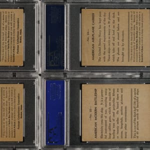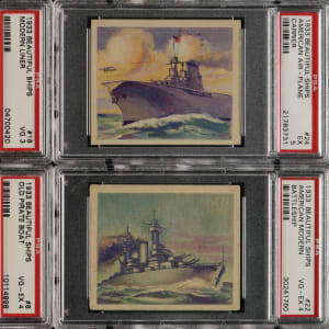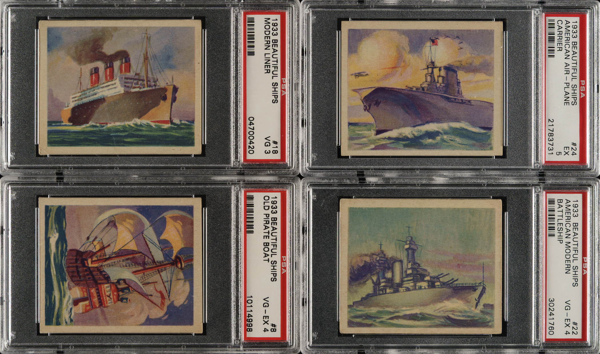 Presented is a near-complete set of 1933 R135-1 "Beautiful Ships" consisting of twenty-three different cards, missing only #7 for completion. Cards from this set feature striking and very colorful illustrations of ships from all around the world. The set was produced by two Boston-based companies, Package Confectionary and United Candy. Only twenty-four cards were ever issued. The second group of twenty-four cards, which would have fulfilled the promise of forty-eight cards suggested by the "series of 48" claim which is advertised on the back of every card, was apparently planned but never issued. Condition ranges from Vg to Ex (averaging Vg-Ex), including one Ex-Mt and two Gd. Four cards have been professionally graded and encapsulated by PSA. Keys: #1 Egyptian Ship (Vg-Ex), 8 (VG-EX 4), 18 (VG 3), 22 (VG-EX 4), and 24 (EX 5). This is an awesome offering of this extremely attractive and scarce 1930s nonsport card issue. Total: 23 cards.