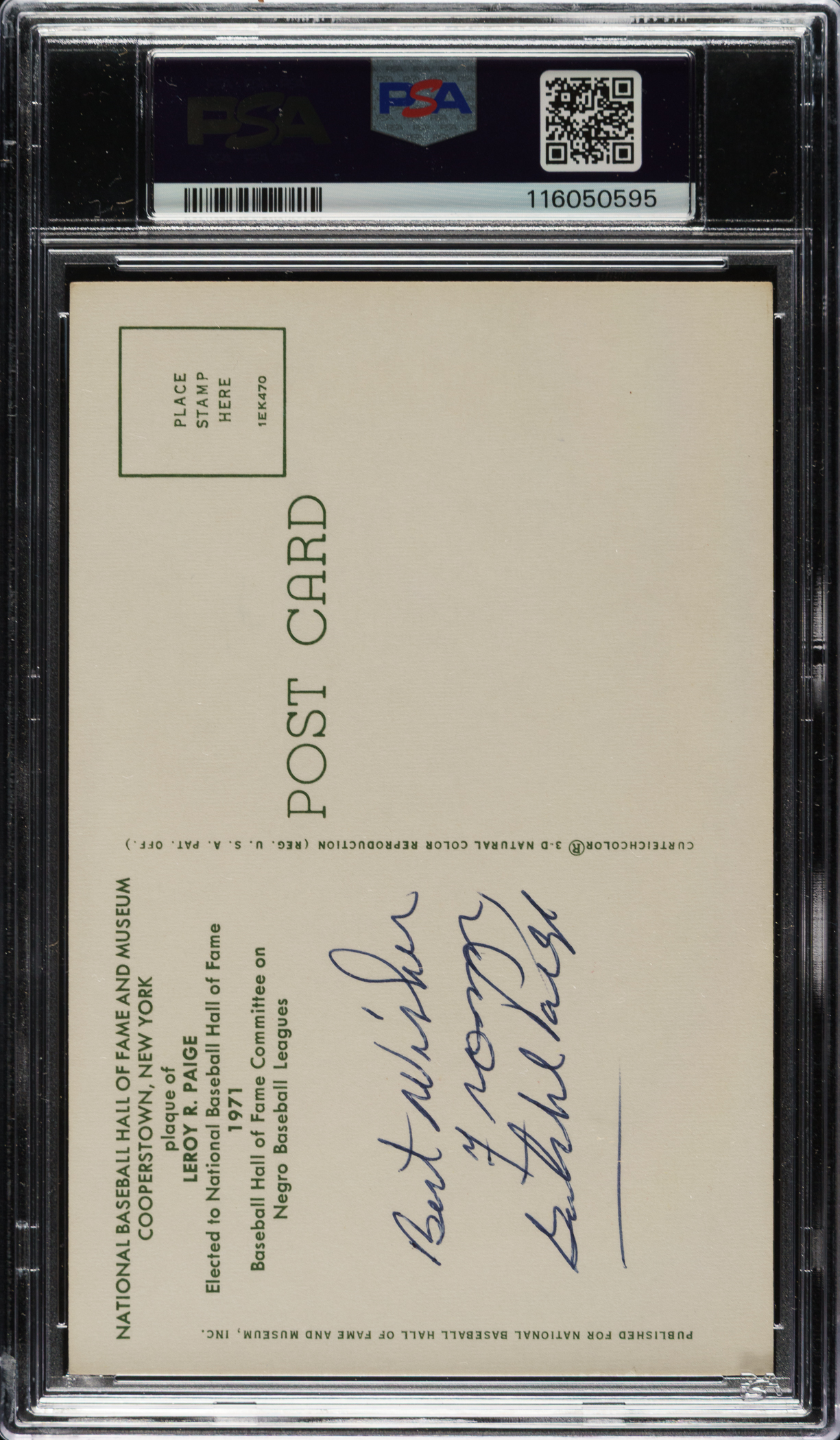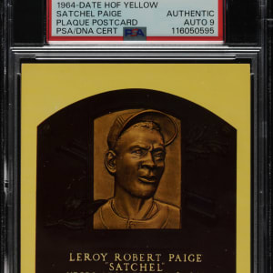 PSA/DNA has encapsulated the postcard, grading the signature MINT 9. Cleveland Indians Hall of Famer Satchel Paige.