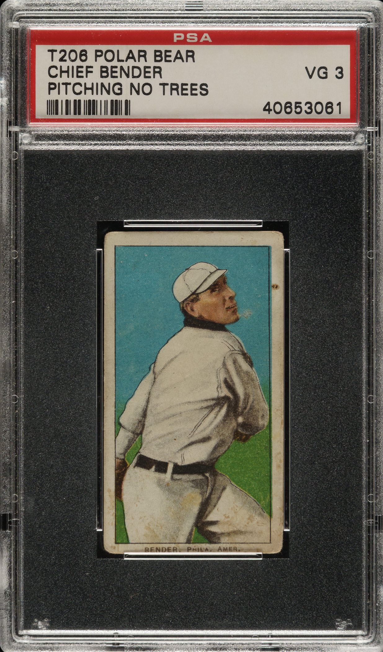 Lot # 256: 1909-1911 T206 White Border Chief Bender Pitching, No Trees in Background PSA VG 3 - Polar Bear Back