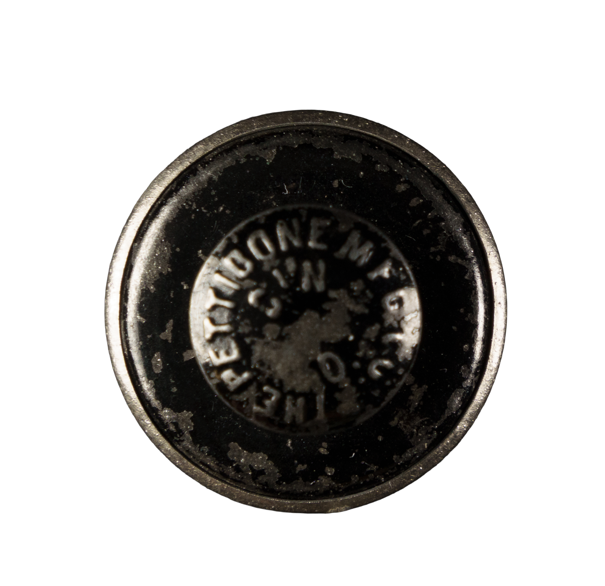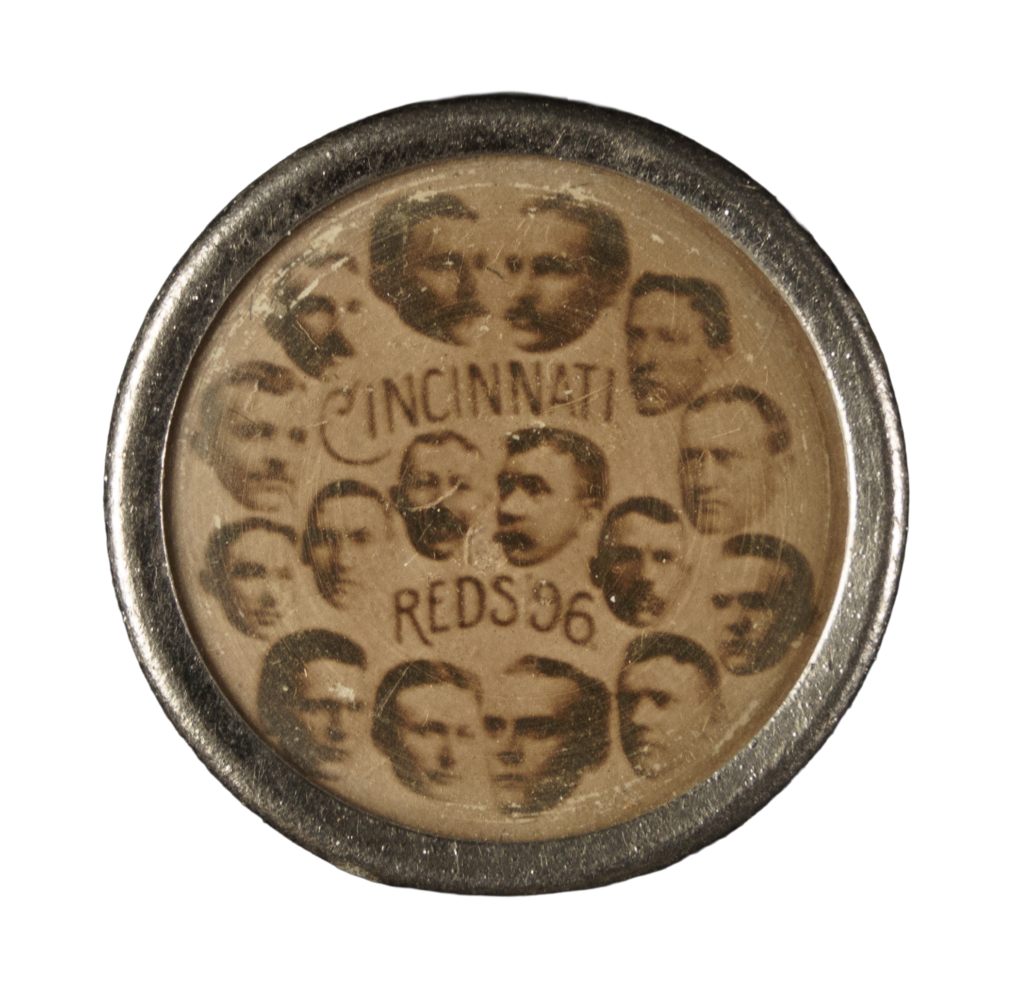 Extraordinarily rare 1896 Cincinnati Reds team pin featuring portraits of the entire team. This pin is noteworthy on several counts: 1) This team pin includes legendary Hall of Famer Buck Ewing as a player/manager (he was manager of the Reds from 1895 to 1899). 2) This is from an extremely rare series of pins, and one of only two baseball pin sets dating from before 1900. Very few examples from this set have ever surfaced. We have seen only two different teams from this series to date (the other team is Pittsburgh). 3) This series has an extraordinary significance to collecting as it is the very first baseball celluloid pin set: 1896 was the first year of the celluloid pin. This series predates Cameo Pepsin Gum pins (commonly assumed by many to be the first baseball pins) by approximately two years. It is unknown exactly how these pins were issued, but each has the manufacturer's credit "The Pettibone MFG. Co." on the back. The pins are designed with lapel-style backs, with the lithographed portrait images trapped under a celluloid cover. This example displays bold portrait images, light toning, and chipping on the metal backing. Overall in Very Good condition. Diameter: .75 inches.