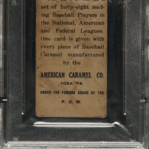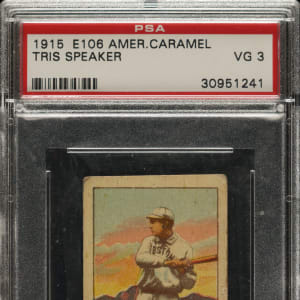Graded VG 3 by PSA. Mid-grade E106 example of legendary Hall of Famer Tris Speaker of the Boston Red Sox. The exceptionally rare 1915 E106 American Caramel issue shares designs with several other closely related candy issues (Croft's Candy, Nadja Caramels, Dockman & Sons, etc.) from the same era. These cards have glossy surfaces, which are very susceptible to cracking. This example has brilliant colors, outstanding registration, honest corner wear, and a small surface flaw along the right border. The reverse is heavily soiled. In addition to being issued a few years later than most caramel cards, E106 American Caramel Company cards are considerably rarer than most traditional "E" cards. This is a visually appealing mid-grade example of Hall of Famer Tris Speaker from this extremely rare, early 20th century candy issue.