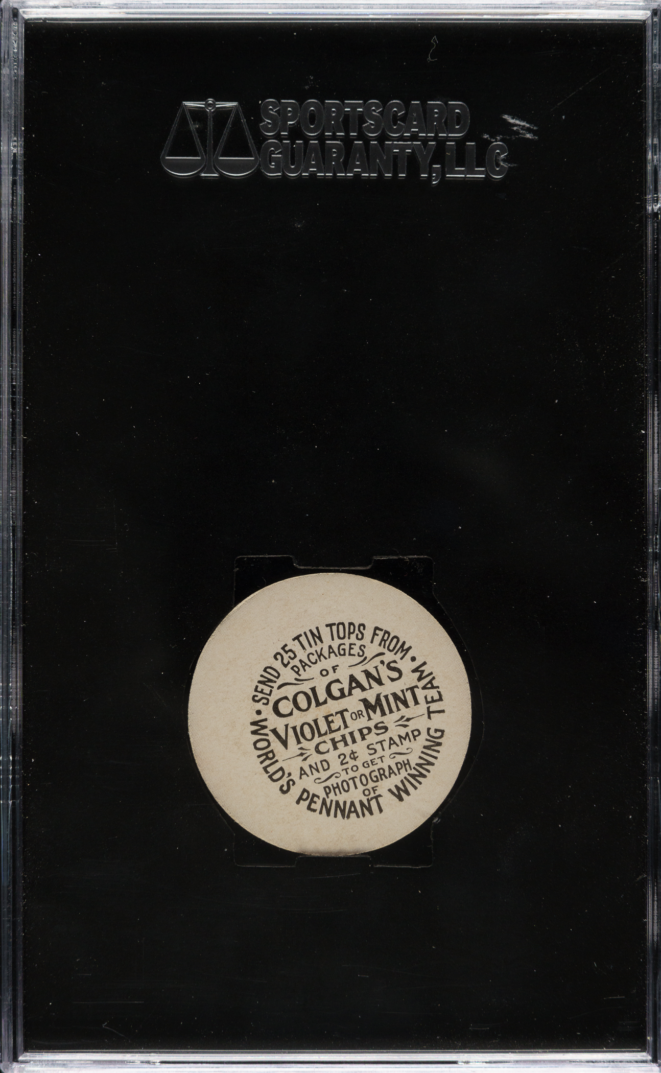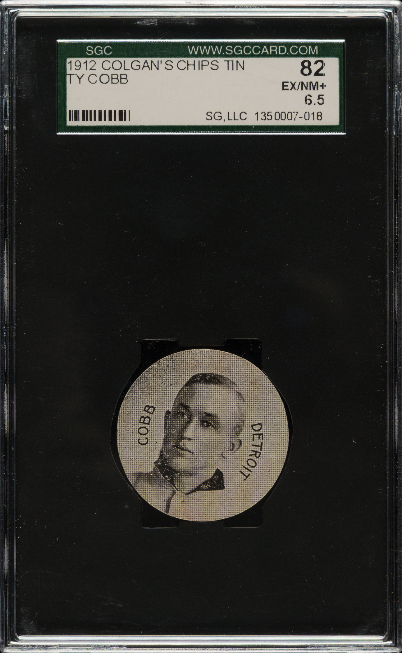 Graded EX/NM+ 82 by SGC. Outstanding example of Detroit Tigers Hall of Famer Ty Cobb from the extremely rare E270-2 Colgan's Chips "Tin Tops" series. Among the most unique and distinctive cards ever produced are the various Colgan's Chips issues, beginning with the 1909-1911 E254 "Stars of the Diamond" set and concluding with the E270-2 "Tin Tops" issued a few years later. The cards are actually circular (1-7/16 inches in diameter) and were issued as inserts with Colgan's Chips products in the company's trademark round tins. E270-2 cards were inserted with Colgan's Violet or Mint Chips, as noted on the backs, which is one of the design elements that distinguishes these E270-2 "Tin Tops" cards from their more common E254 "Stars of the Diamond" counterparts. The player and team identification text on the E270-2 "Tin Tops" Ty Cobb is also clearly very different than its far more common E254 counterpart. Cobb is undoubtedly one of the keys to the ultra-rare E270-2 set. As suggested by its impressive assigned grade, the offered example is superb, with a crisp image, minimal wear on the edges, and a boldly printed reverse. This is a tremendous opportunity to acquire a fantastic high-grade example of Ty Cobb from this very rare and desirable issue. By any measure, this is one of the rarest of all Ty Cobb cards!